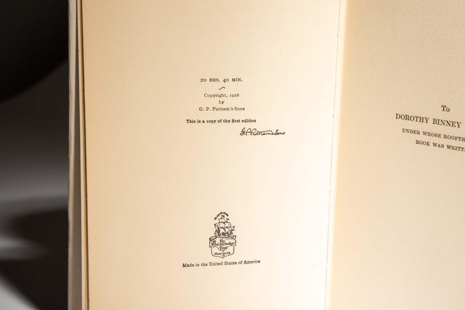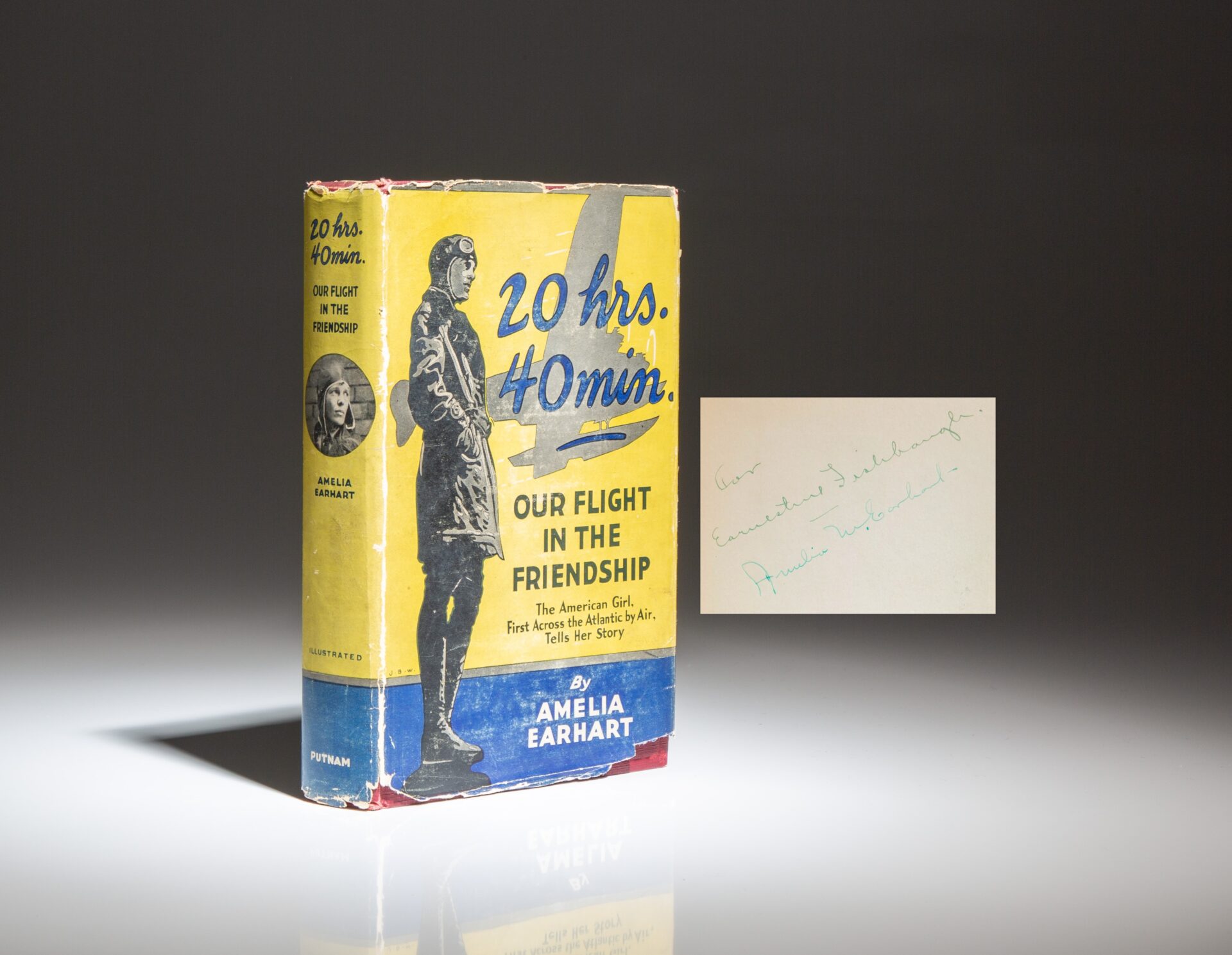 Signed first edition, first printing of 20 Hrs. 40 Min.: Our Flight In the Friendship by Amelia Earhart, with the publisher’s scarce dust jacket.