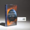 A Brief History of Time by Stephen Hawking, with his thumb print on the title page and an annotation by his secretary, Susan Masey.