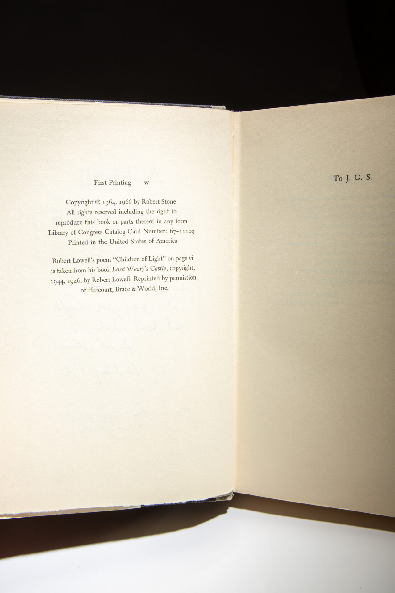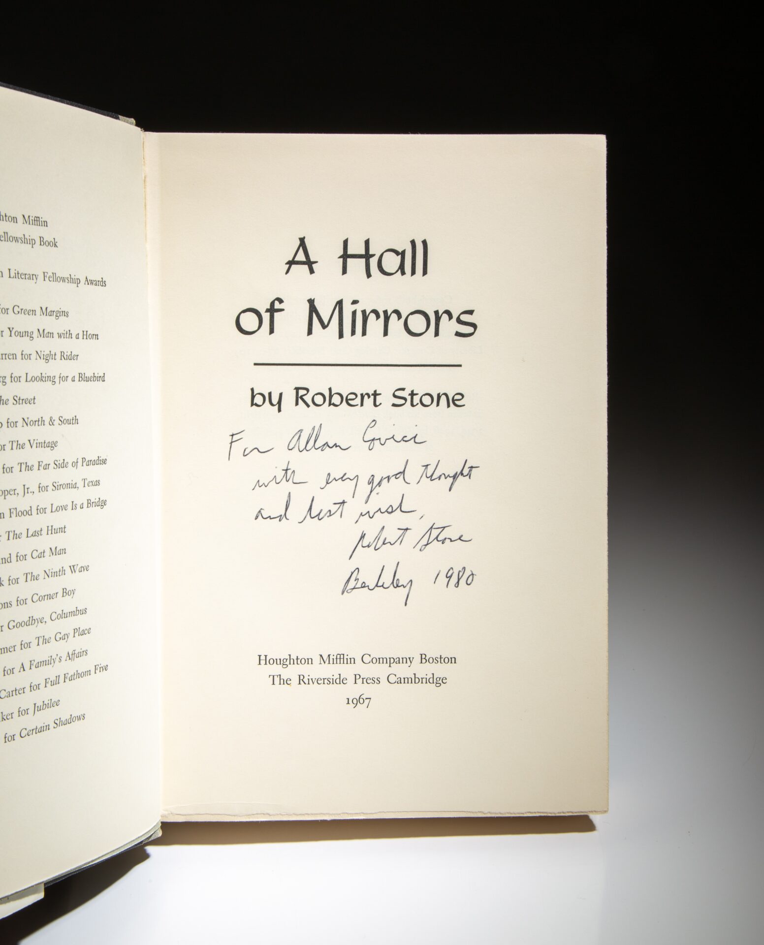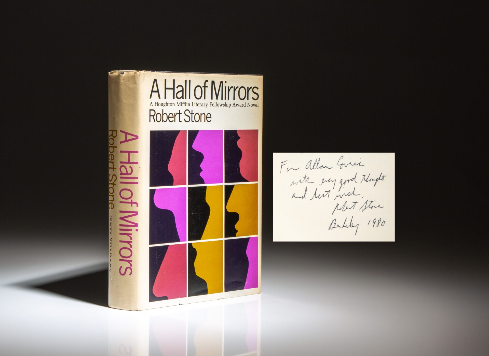Inscribed on the title page: “For Allan Guici / with every good thought and best wish, Robert Stone / Berkeley 1980.”