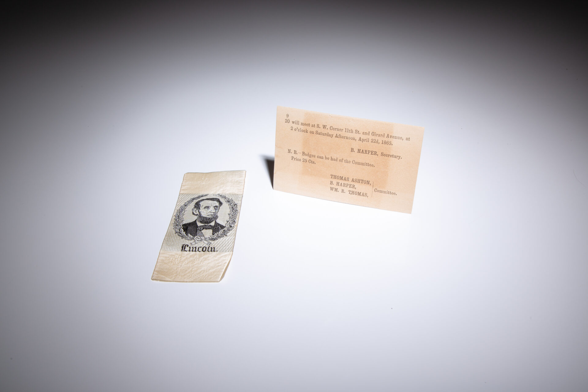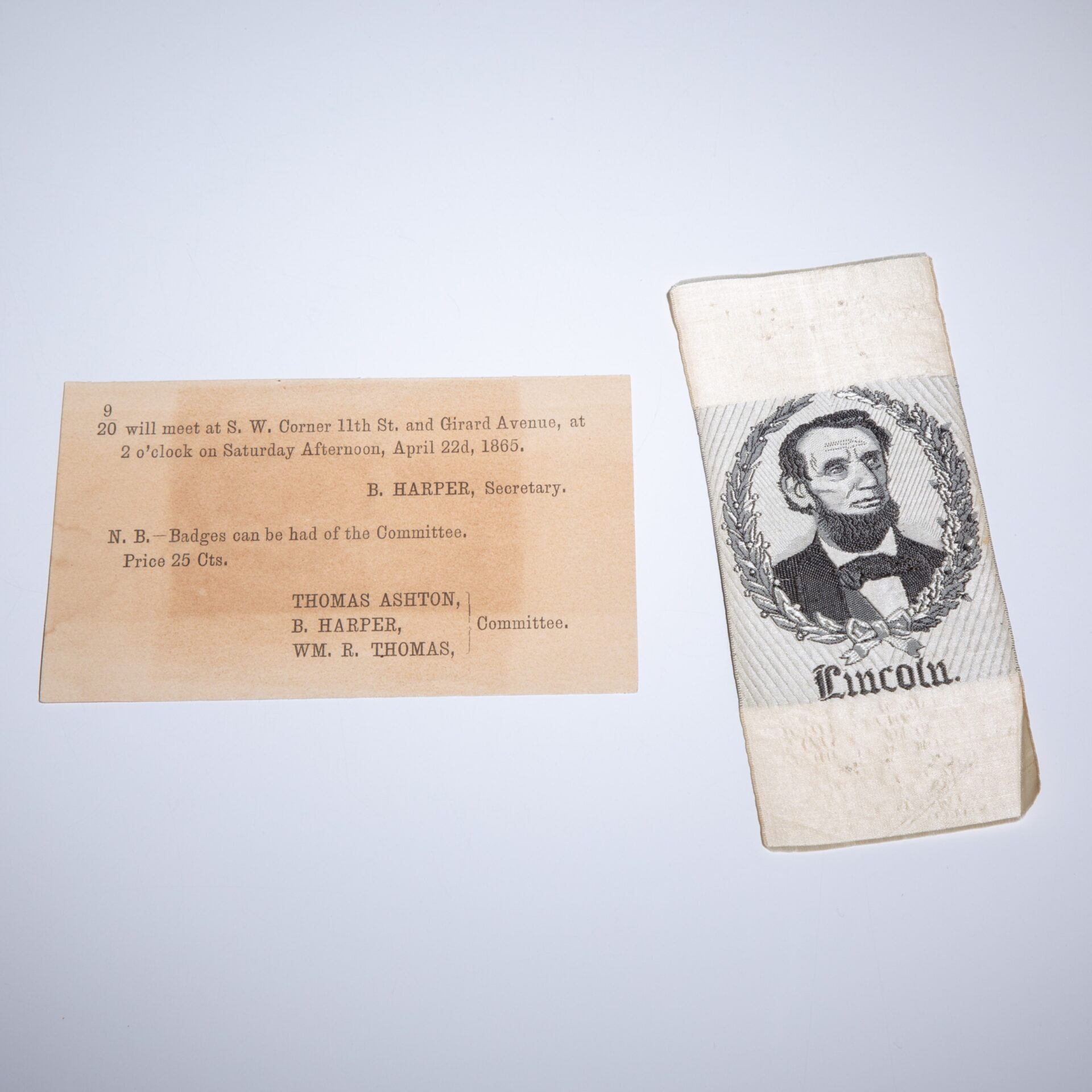 Sewn on white silk ribbon, pin holes along top and bottom quarter. Full piece measures 5.25″ x 2″. Accompanied by an announcement of a meeting on April 22, 1865, where “badges can be had of the Committee, Price 25 Cts,” shortly before the Lincoln funeral train arrived in Philadelphia. One example of this mourning ribbon was found in the Library of Congress. (Portfolio 17, no. 34 – scsm000750)