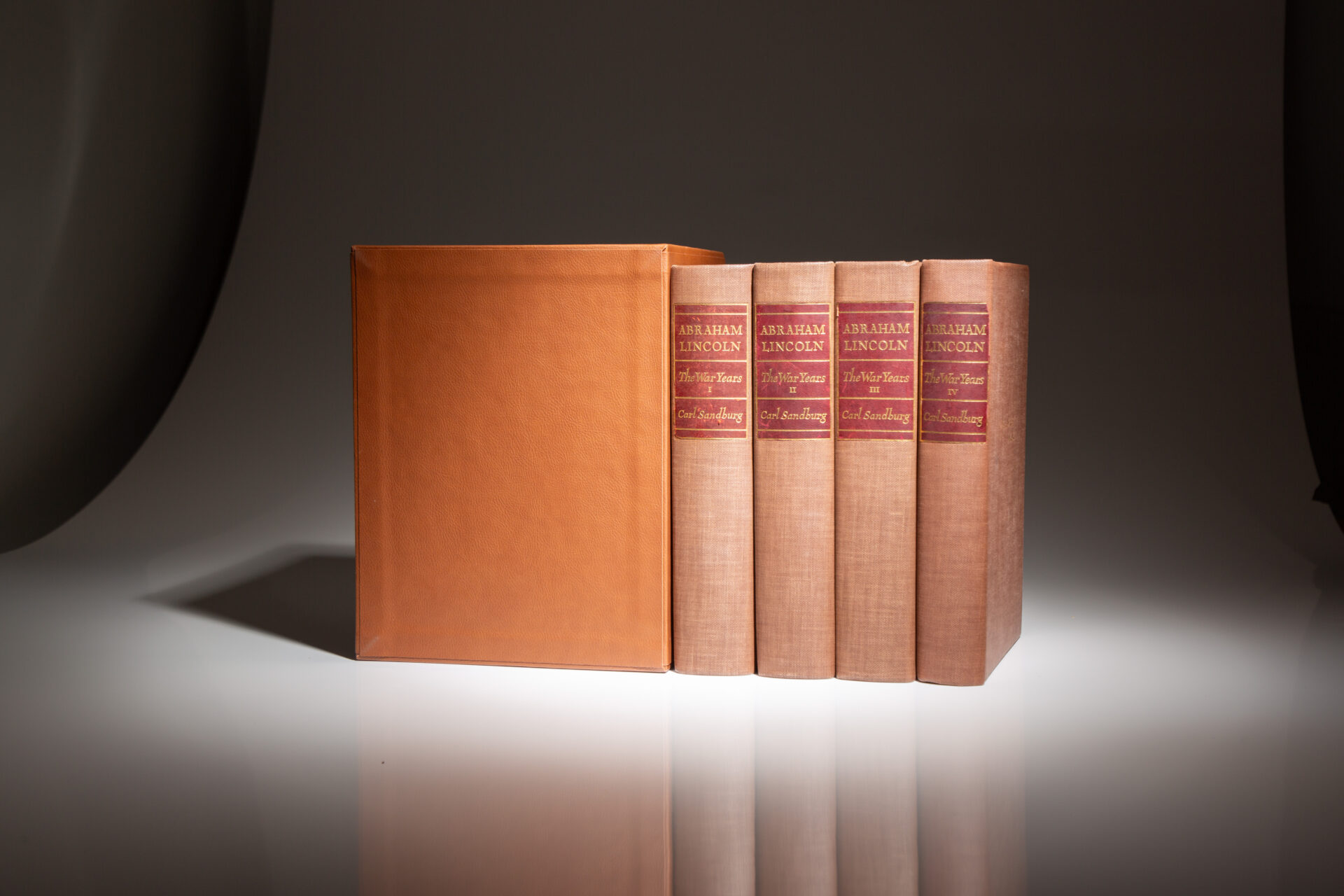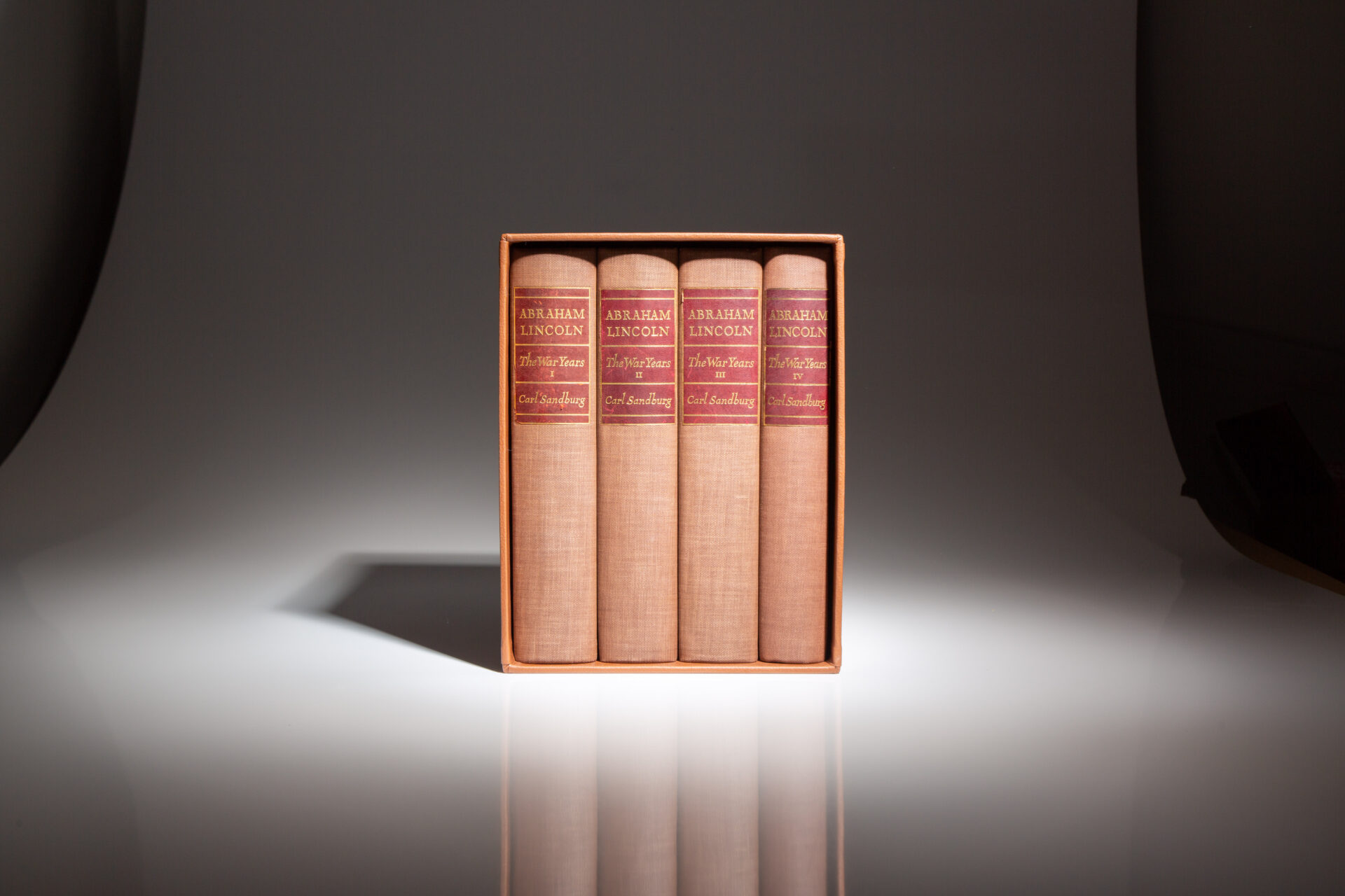Octavo, [four volumes], xxxi, 660pp; xii, 655pp; xiii, 673pp; xii, 515pp. Brown cloth, gilt title over maroon print on spine, signature of A. Lincoln in gilt on cover. Top edge gilt, uncut edges. This set appears unread. Offsetting to front endpapers of Volume I, others in fine condition. Housed in custom brown morocco slipcase.