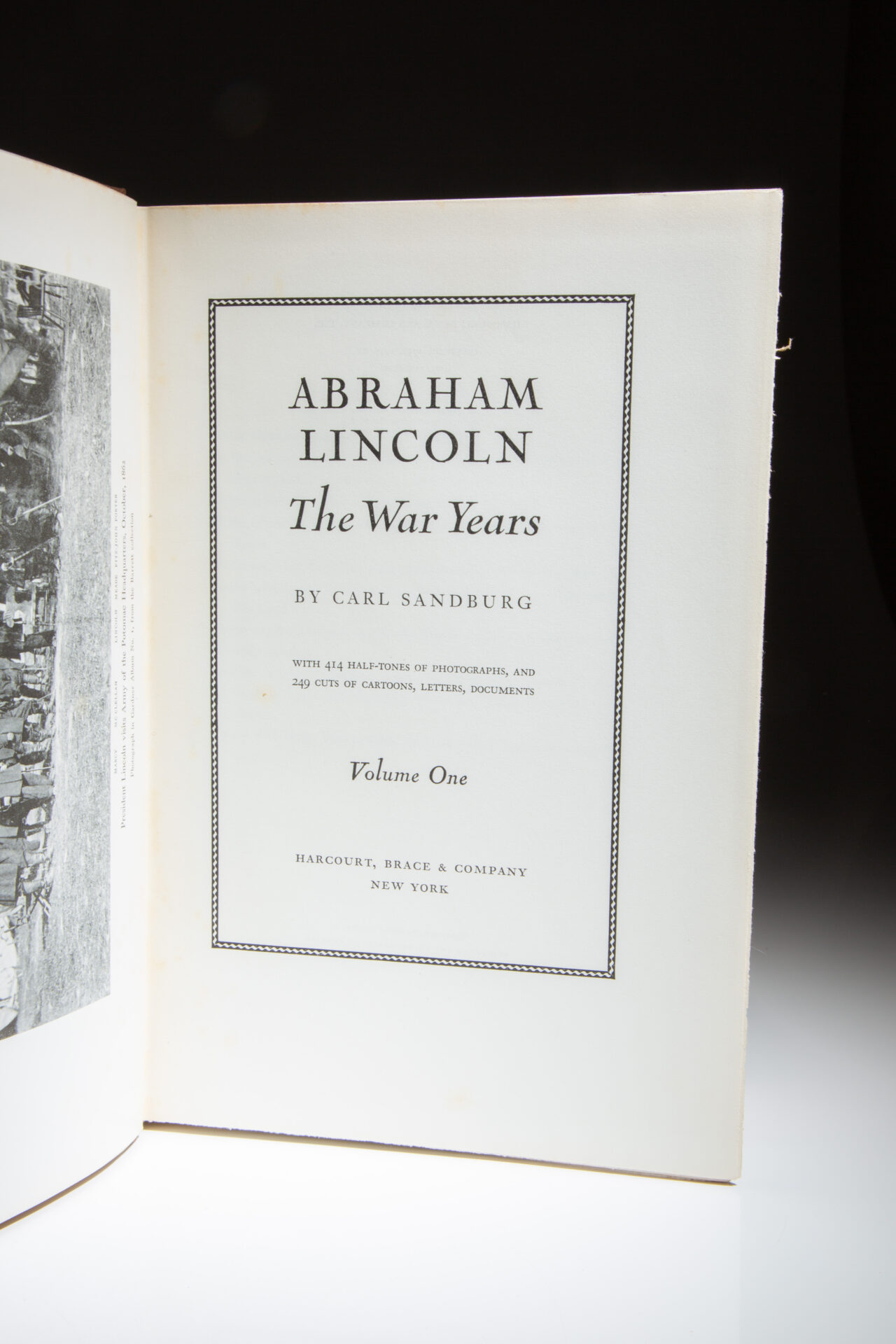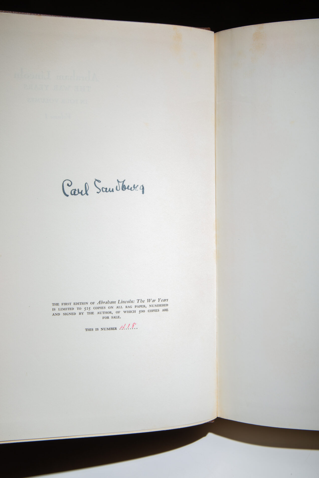 Signed by the author, Carl Sandburg, on limitation page, this being number 418 of 525. Limitation reads: “The First Edition of Abraham Lincoln: The War Years is limited to 525 copies on all rag paper, numbered and signed by the author, of which 500 are for sale. This is number 418.”