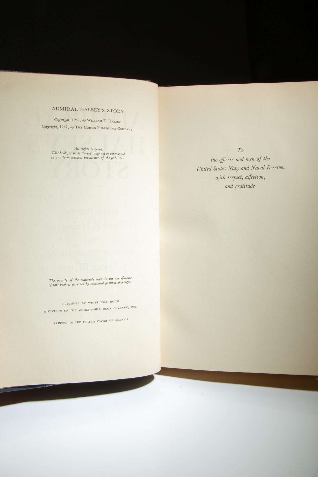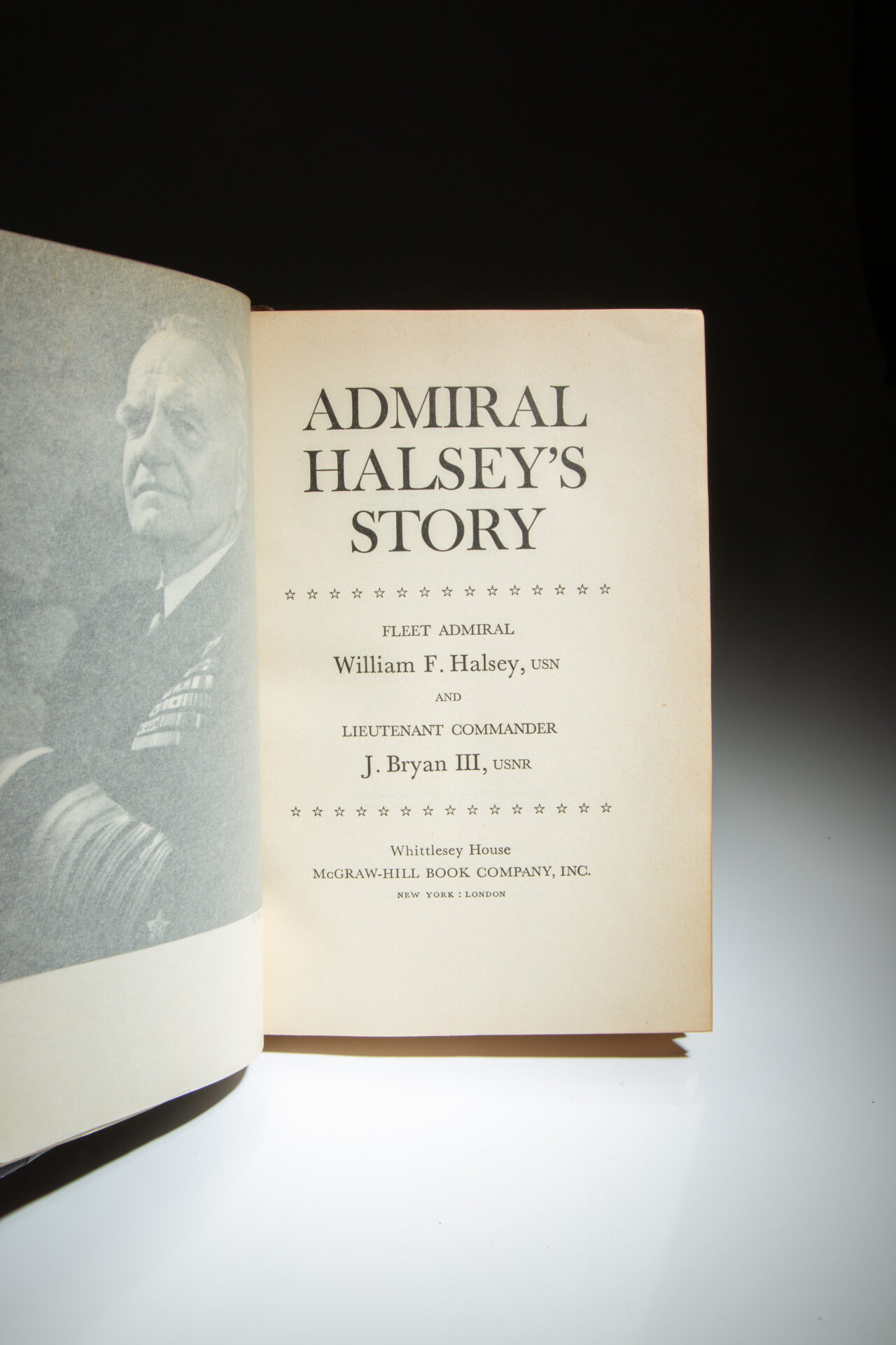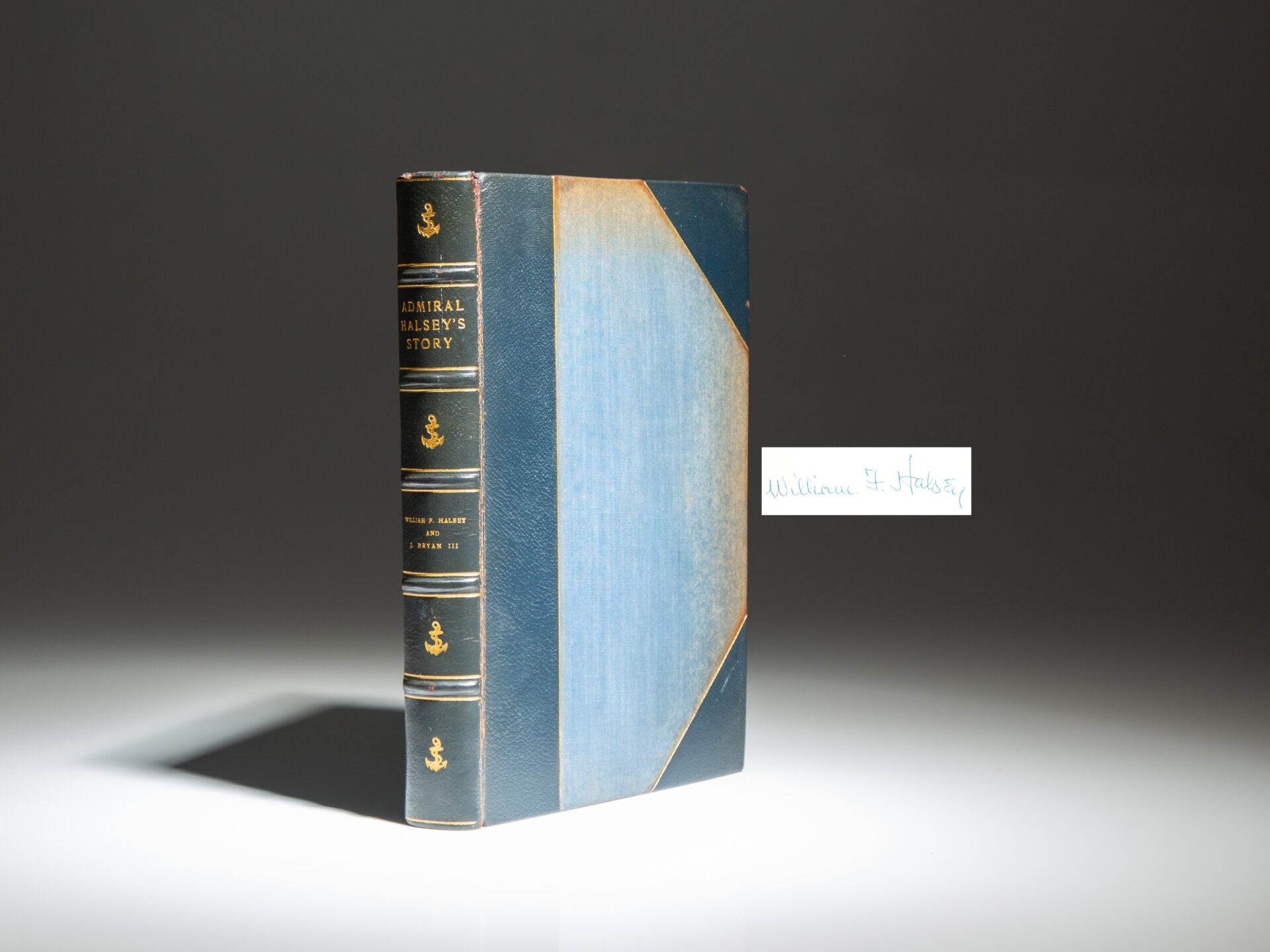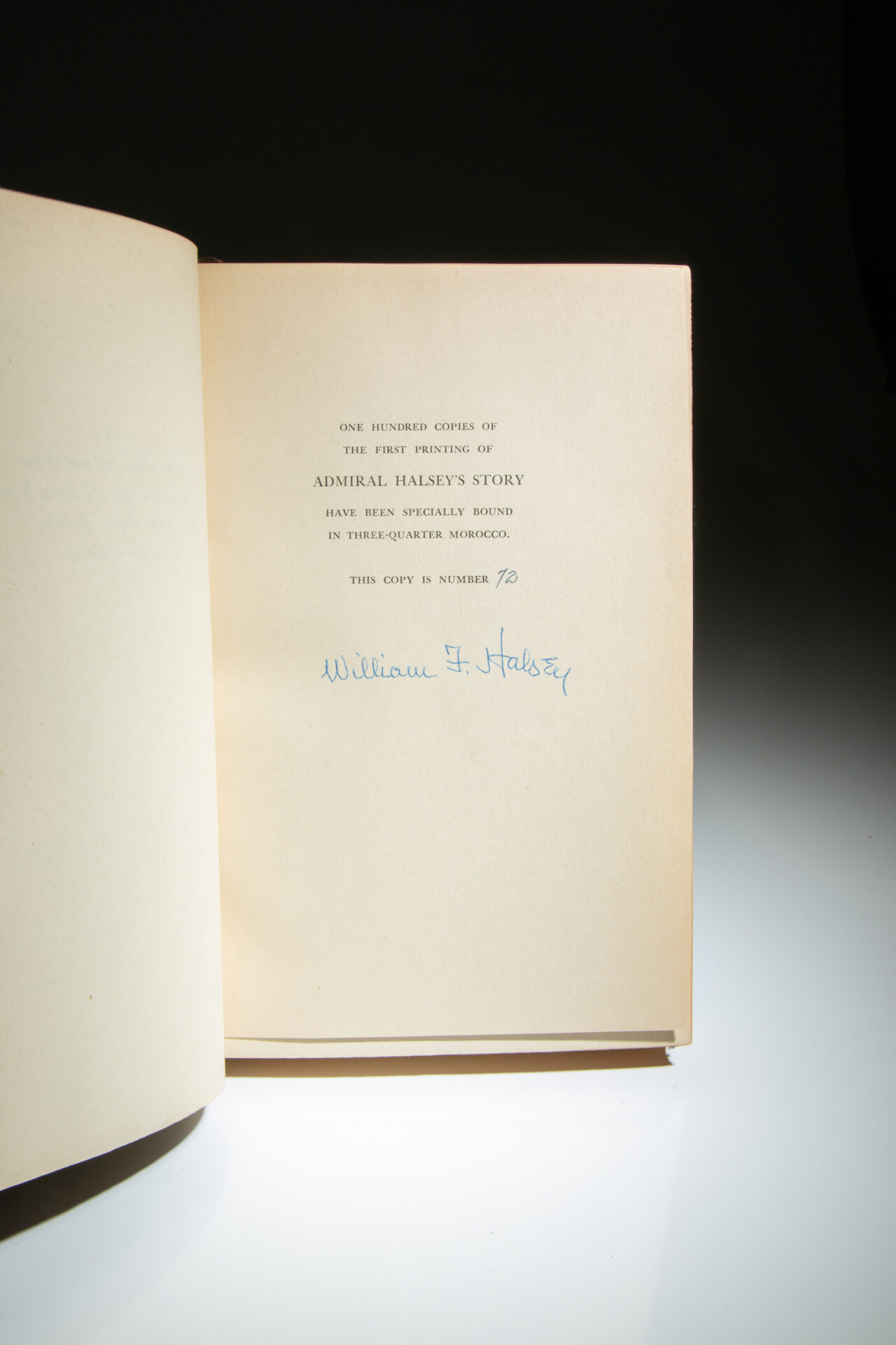 From a limited edition printing of 100 copies signed by Admiral Halsey. Limitation reads: “One hundred copies of the first printing of Admiral Halsey’s Story have been specially bound in three-quarter morocco. This copy is number 72.”