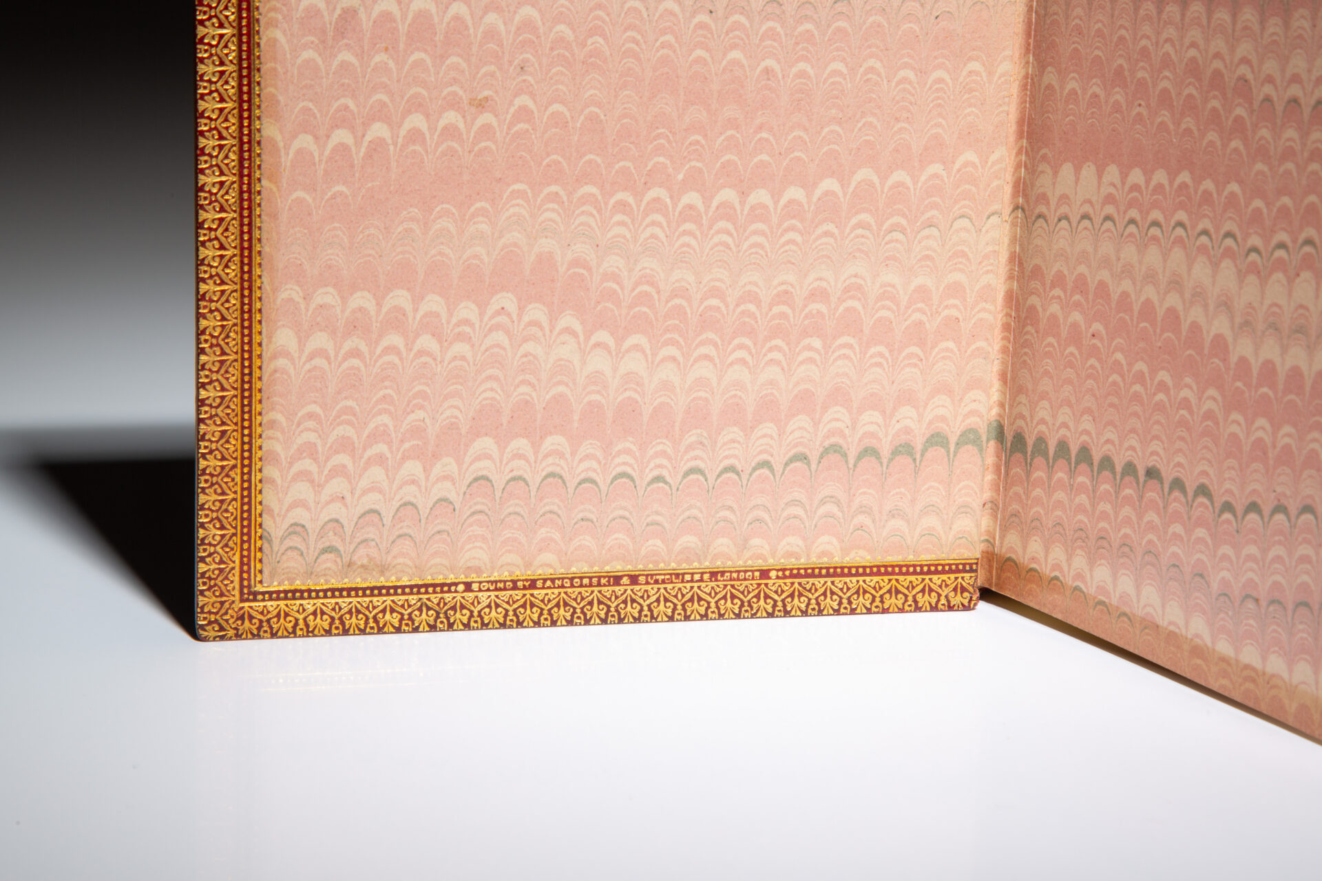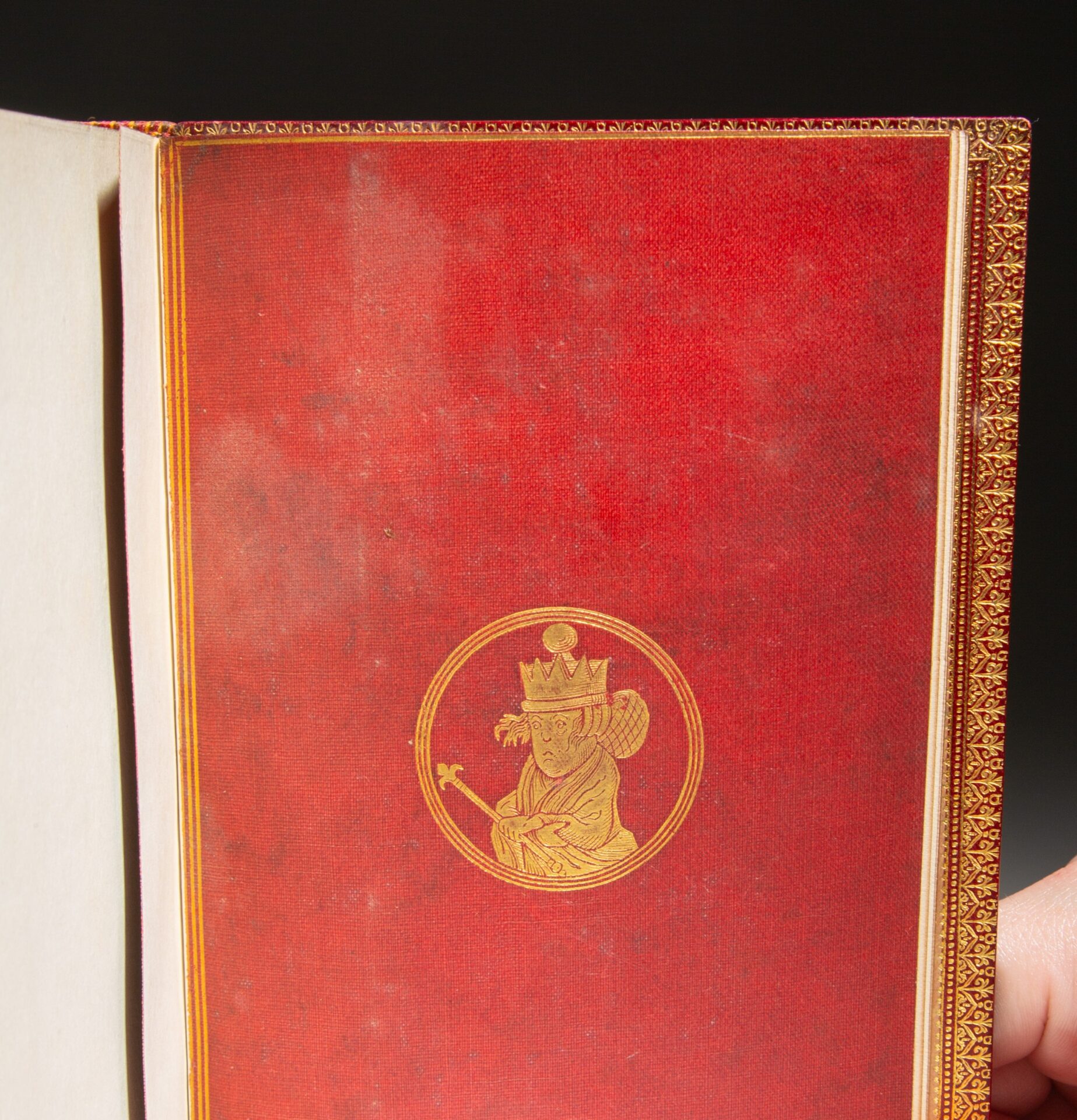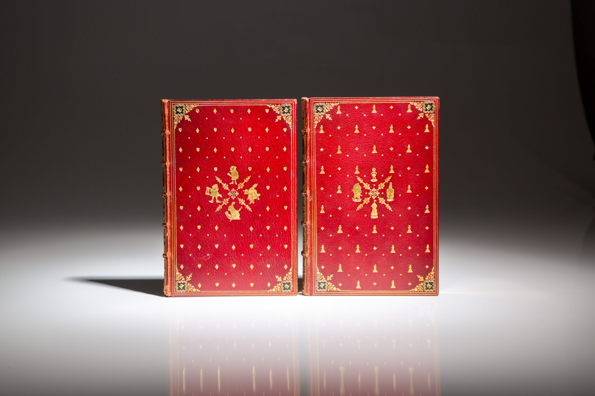 Twelvemo, [two volumes], xii, 192pp; xii, 224pp, [2]. Finely bound in full red morocco. Features a gilt pattern on covers; card suits on Volume I and chess pieces on Volume II. Five raised bands, title in gilt with gilt devices on spines. All edges gilt, gilt turn-ins. Bright marbled endpapers. Bound by Sangorski & Sutcliffe of London, with the bindery imprint on front endpaper in each volume. Both with half titles. Both volumes have the original red cloth covers and spine bound in at rear.