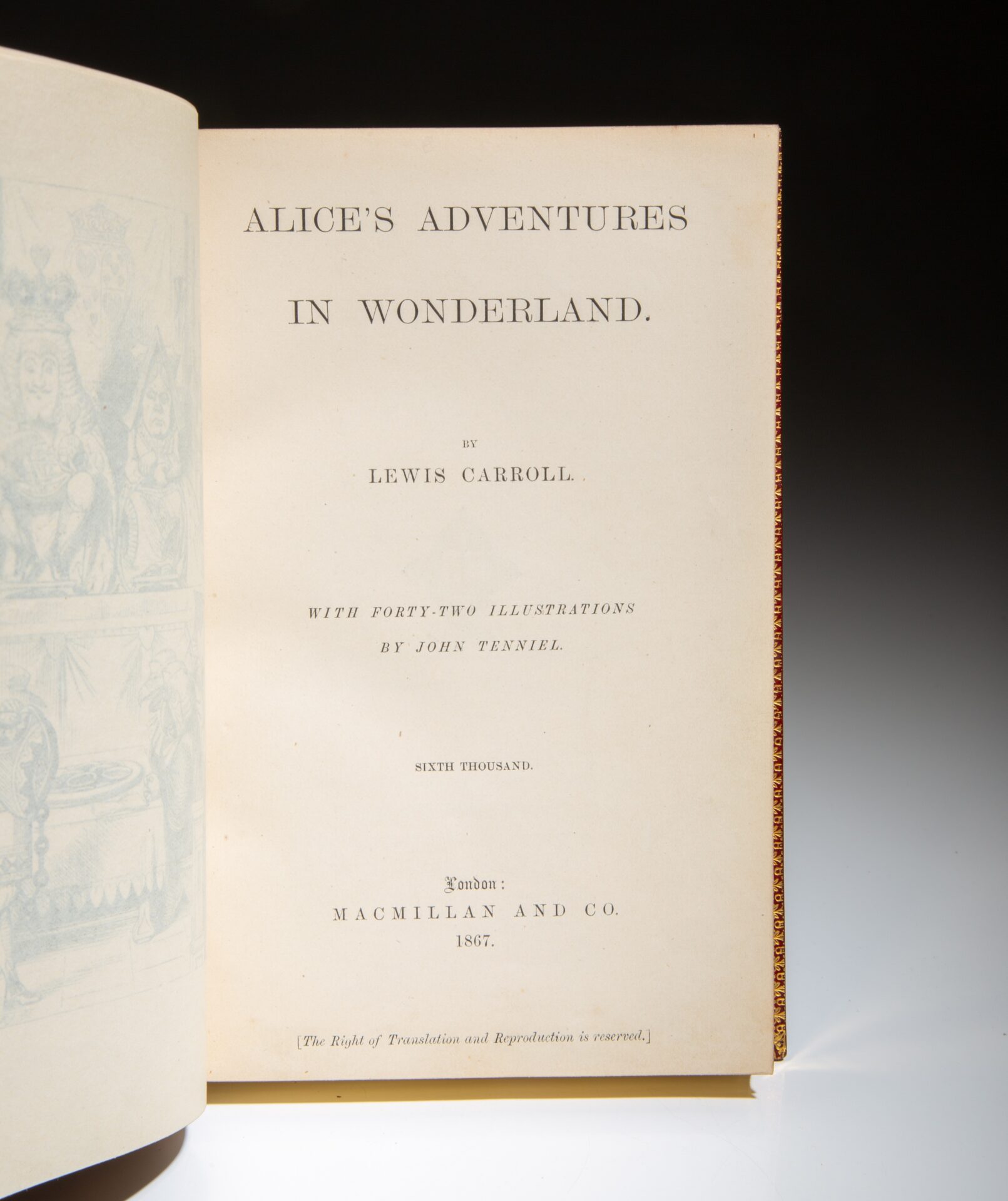 Alice’s Adventures in Wonderland is an early edition, with “Sixth Thousand” stated on title page and “backs” for “back” on Page 116. Solid text block, occasional foxing to leaves. Complete with forty-two illustrations by John Tenniel, including frontispiece.