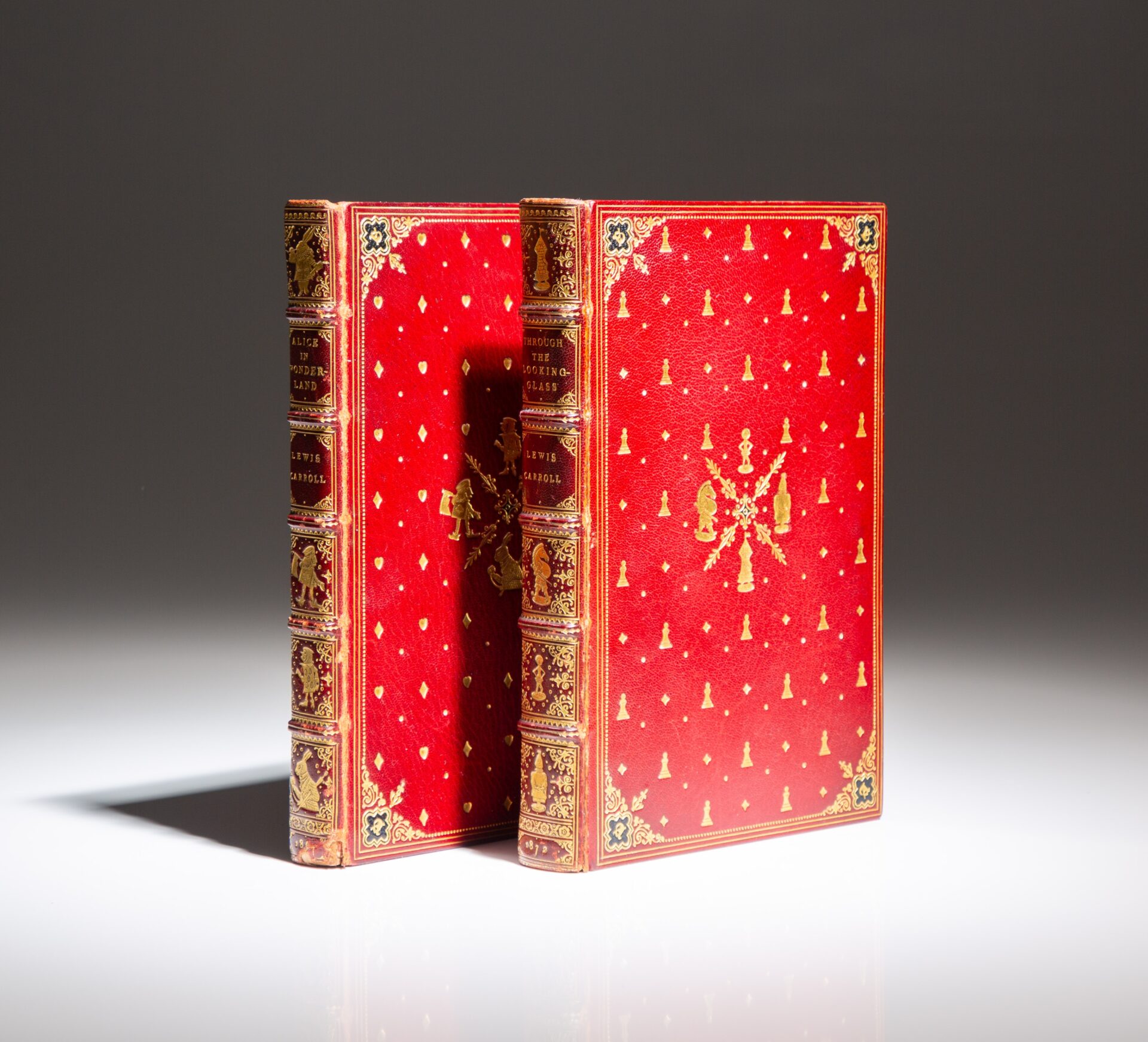 An early edition of Alice’s Adventures in Wonderland with the first edition of Through the Looking-Glass by Lewis Carroll, in a decorative binding by Sangorski & Sutcliffe of London.