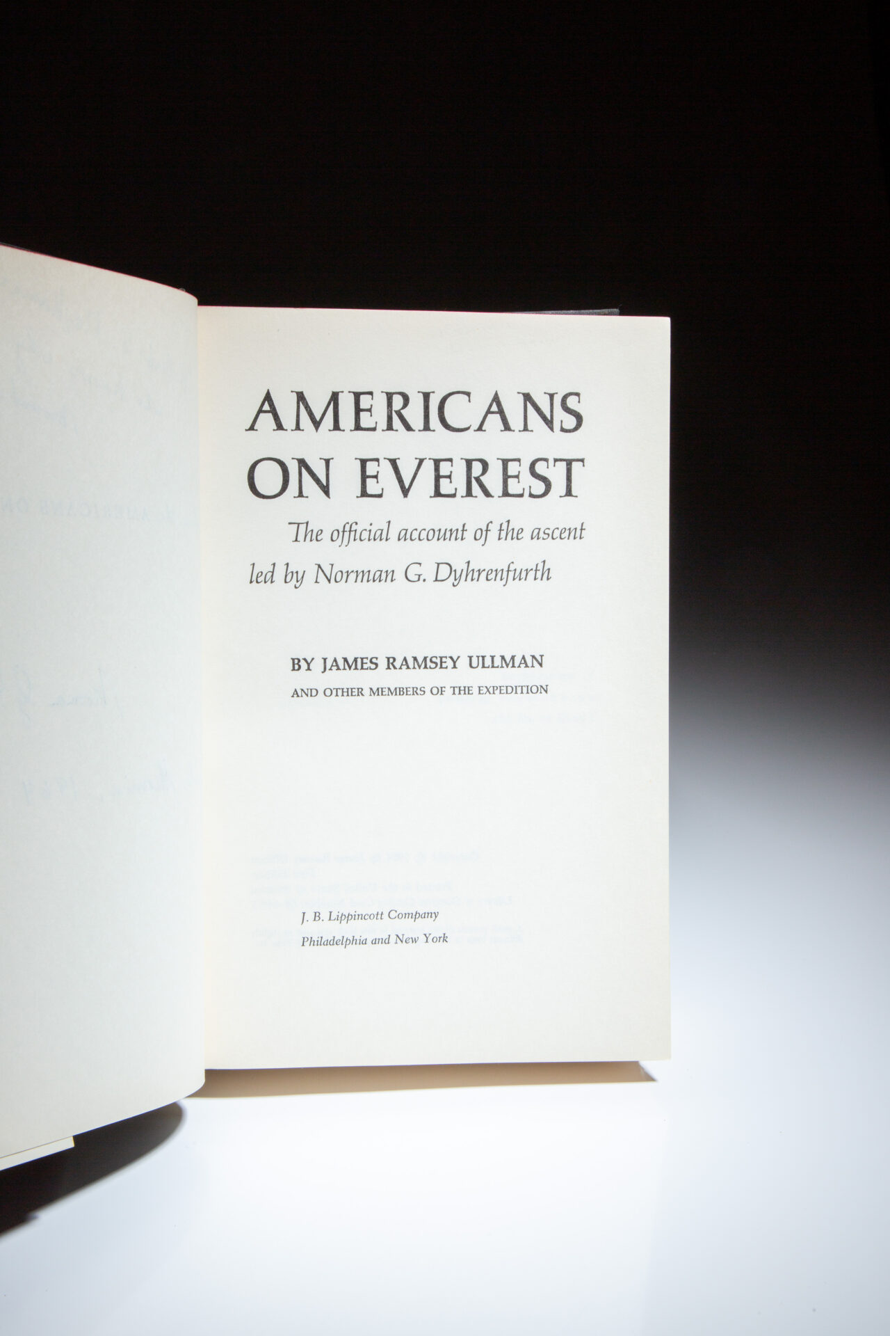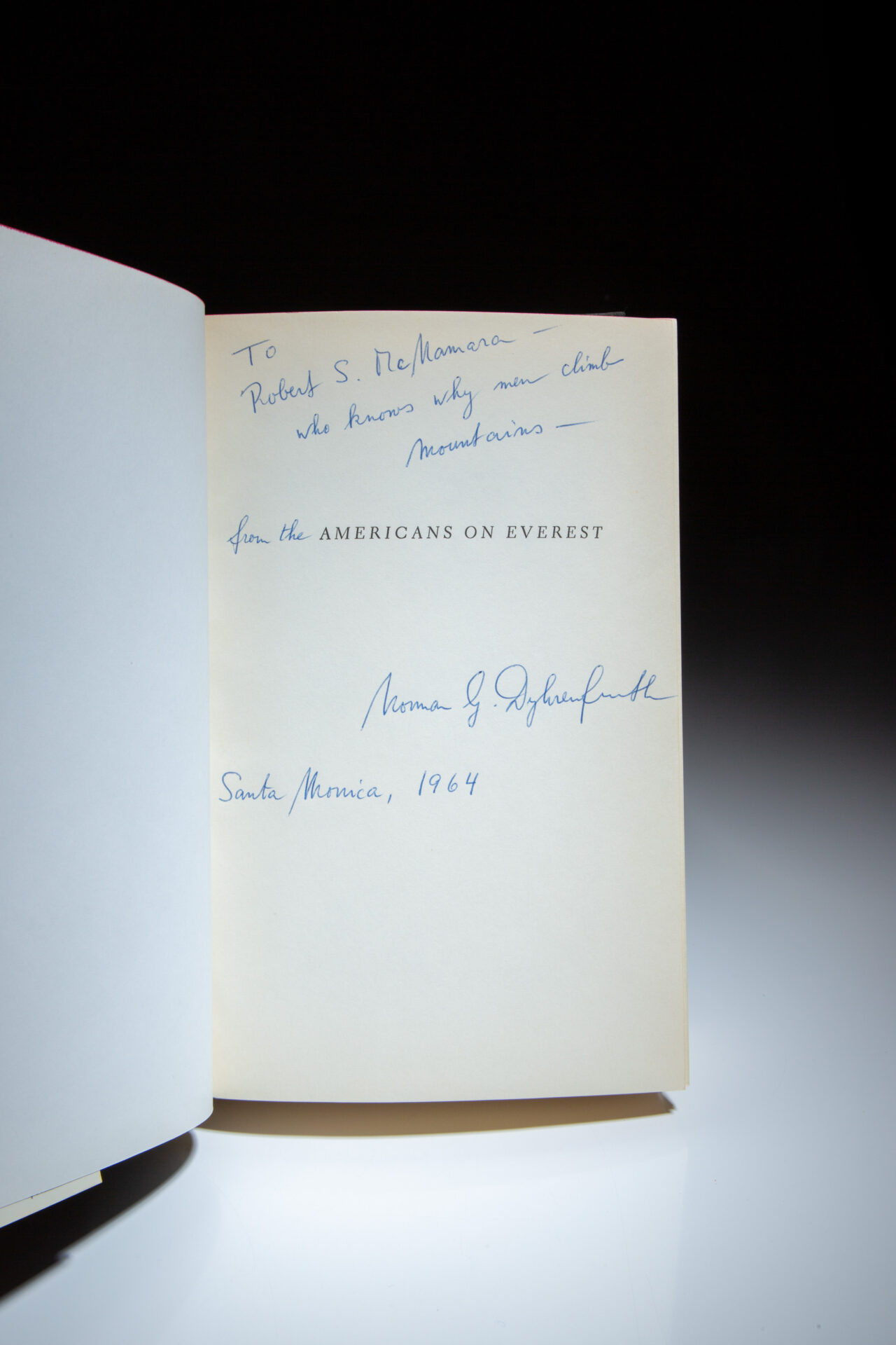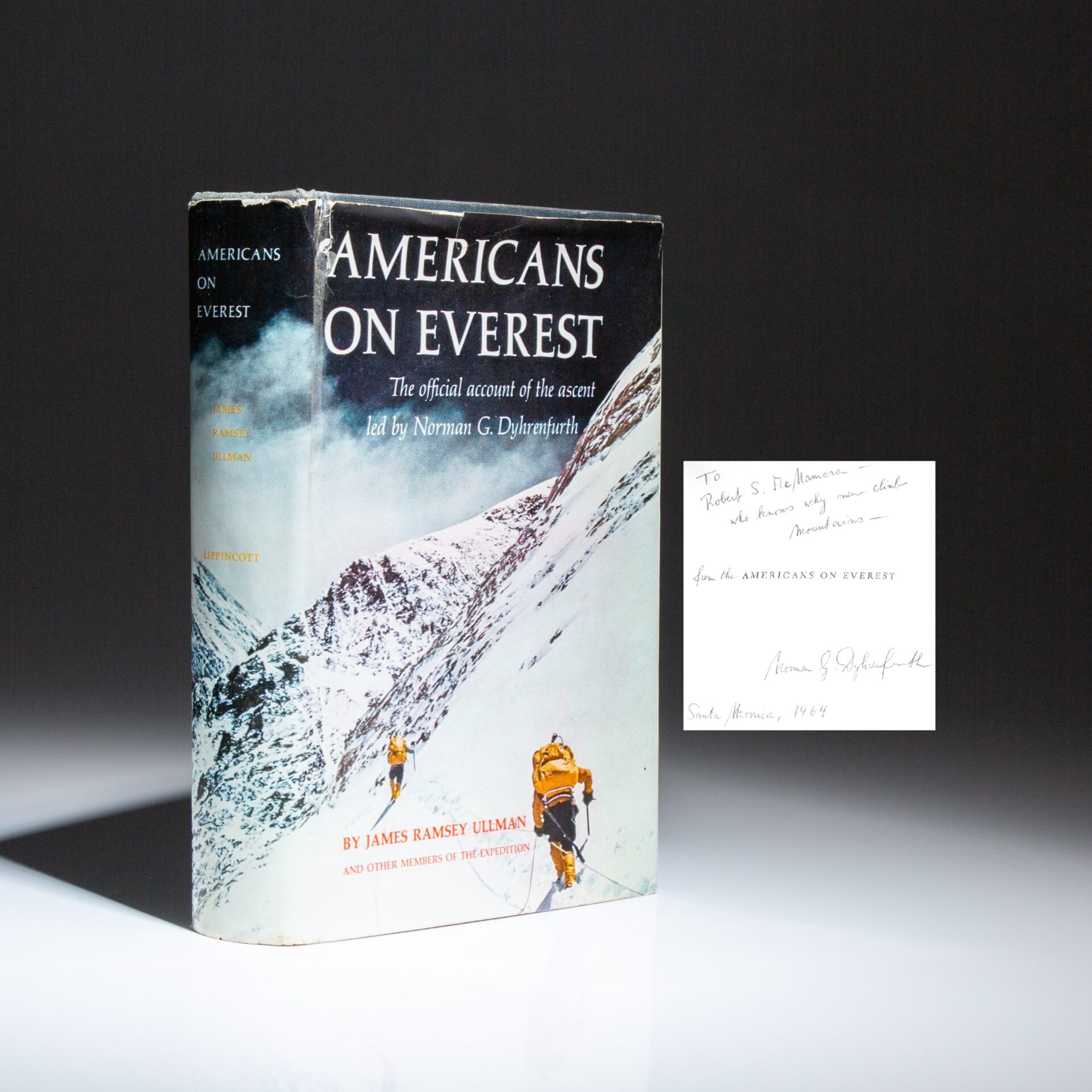 The first edition of Americans on Everest by James Ullman, inscribed by the leader of the first successful American Everest Expedition, Norman Dyhrenfurth, to Secretary of Defense, Robert McNamara.