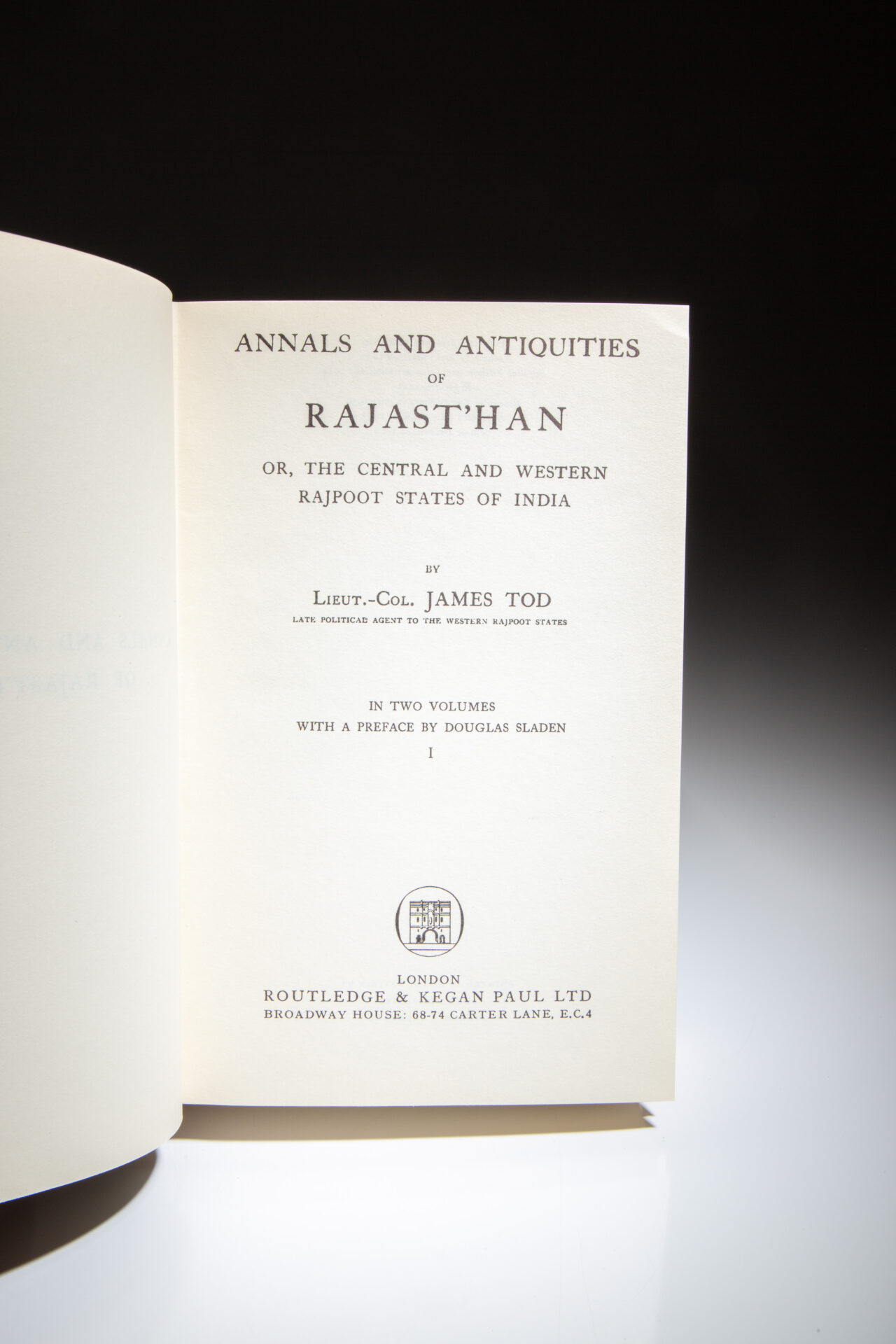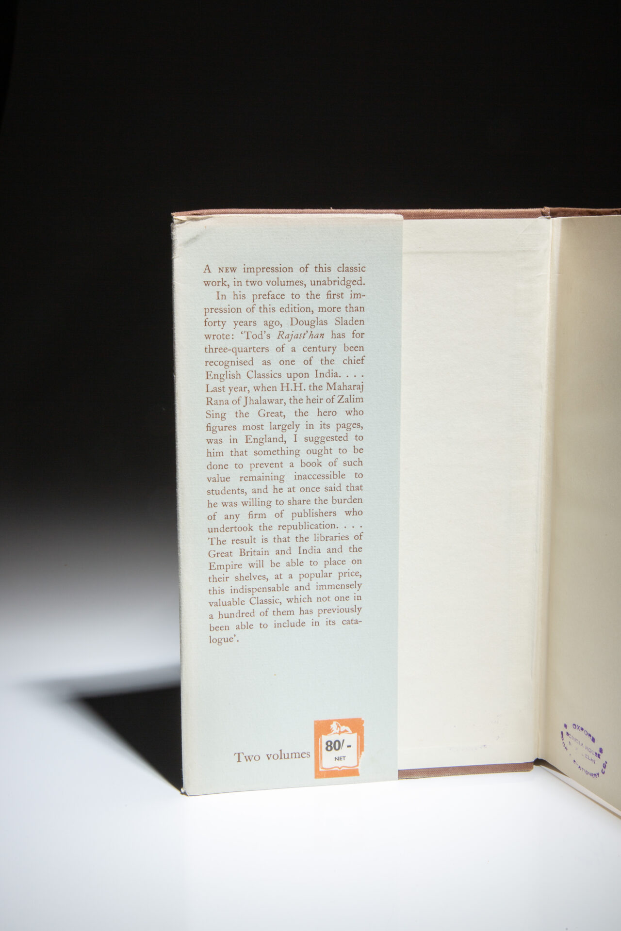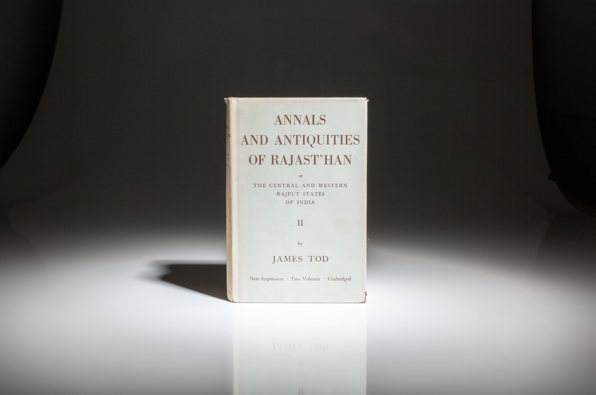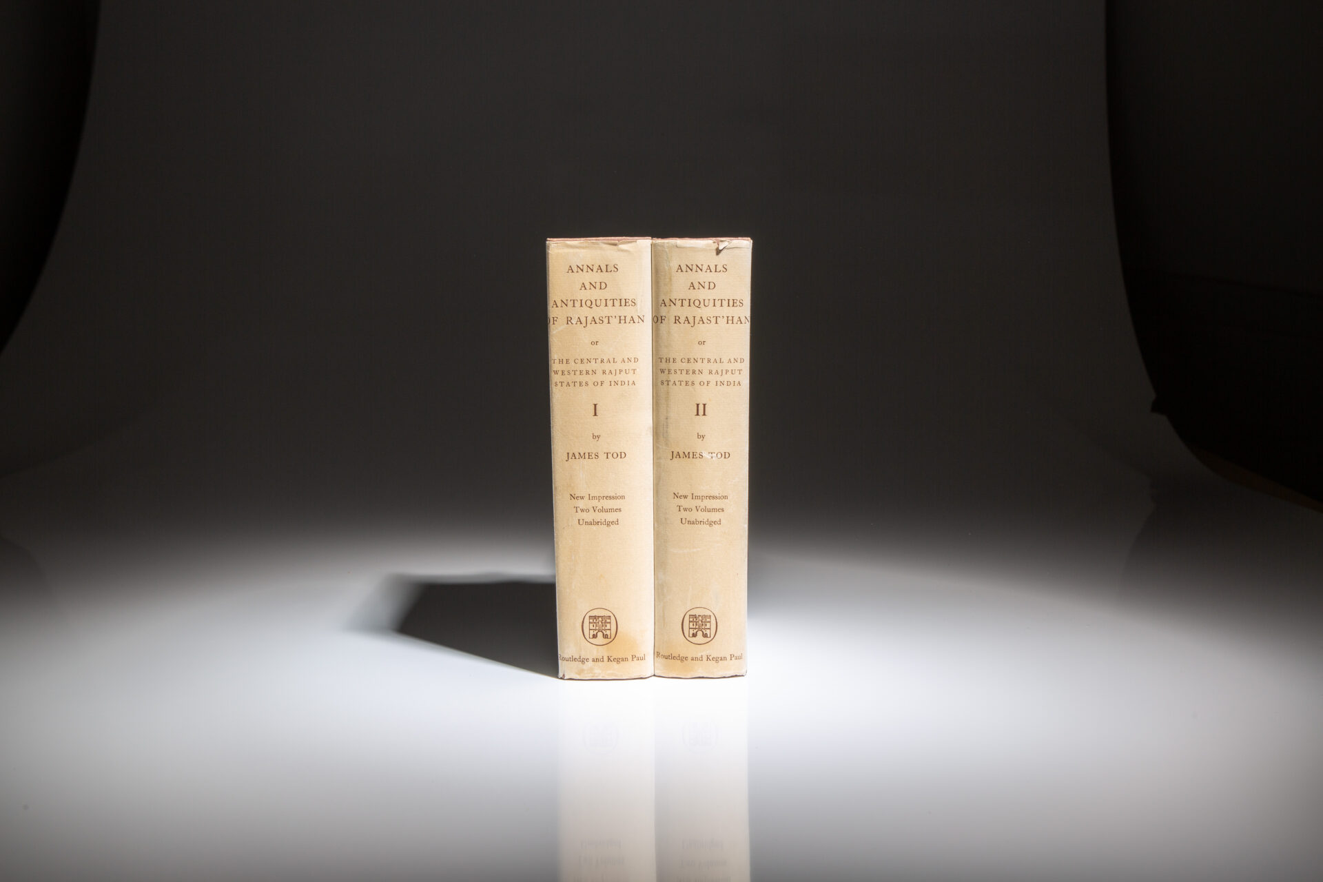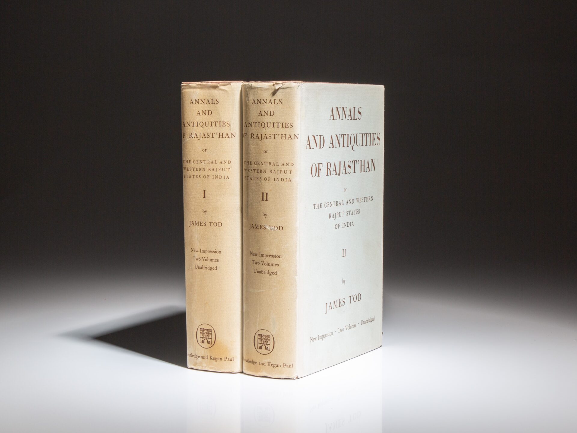 Octavo, [two volumes], xxx, 631pp, [1]; xxxii, 637pp, [4], [table]. Brown cloth, title stamped in gilt on the spine. Stated “New Impression, Two Volumes, Unabridged” on spine of dust jacket. Stated “Volume I reprinted 1960” on the copyright page, with Volume II published in 1957, being the first impression of the new edition. Both volumes appear unread. Bookseller’s stamp on front free endpaper. Both in the publisher’s scarce dust jackets, light wear to both, faint soiling to jackets, retail sticker over original retail price on both front flaps. Includes a large fold-out map of Rajast’han in Volume I and two fold-out tables at the rear of Volume II.