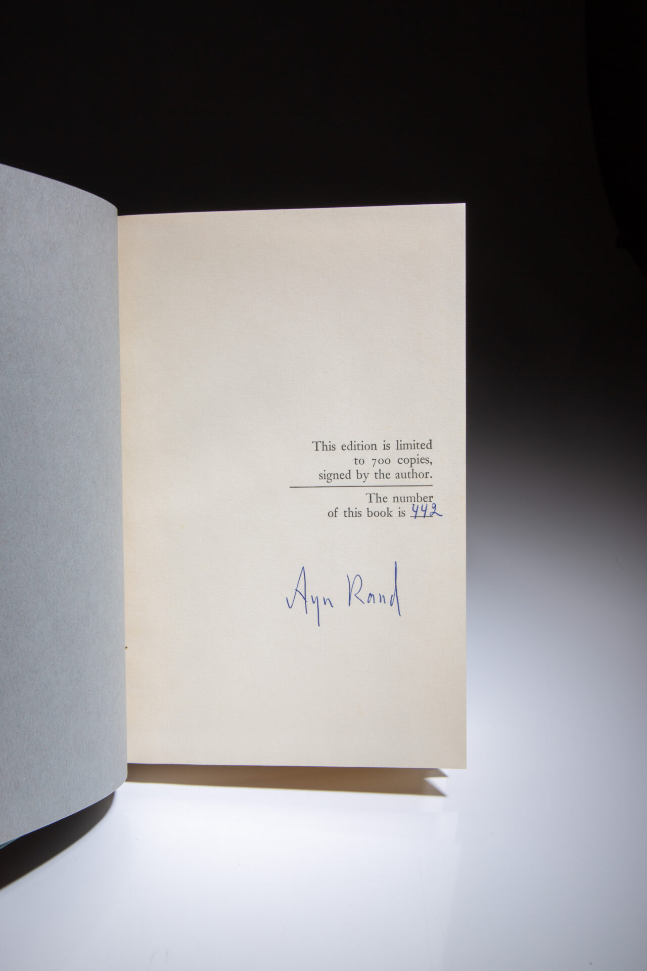 This copy is signed on the limitation page by Ayn Rand, being number 442 of 700.Â