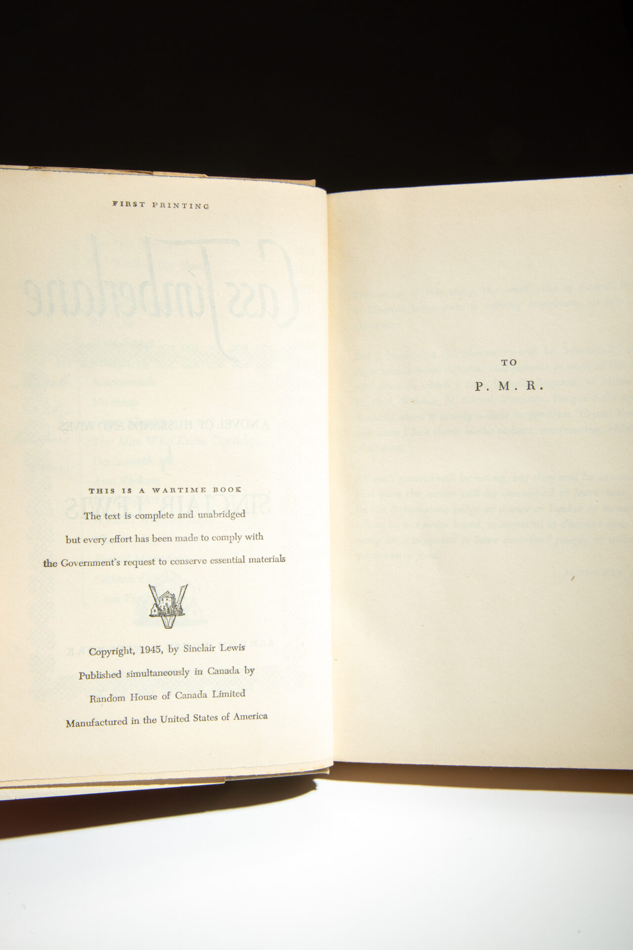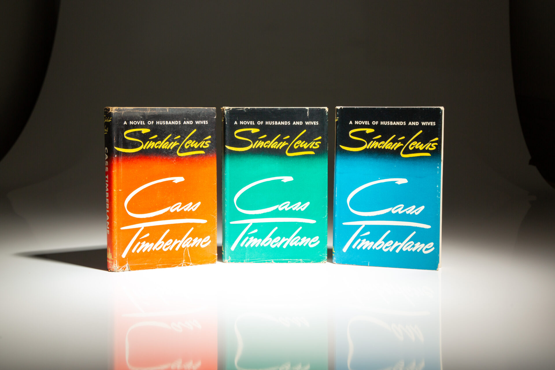 First edition, first printing of Cass Timberlane: A Novel of Husbands and Wives by Sinclair Lewis. This listing includes three copies of the title, with the three variants of dust jackets in blue, red, and green.