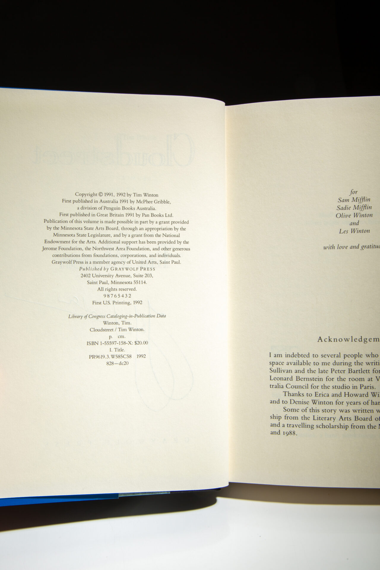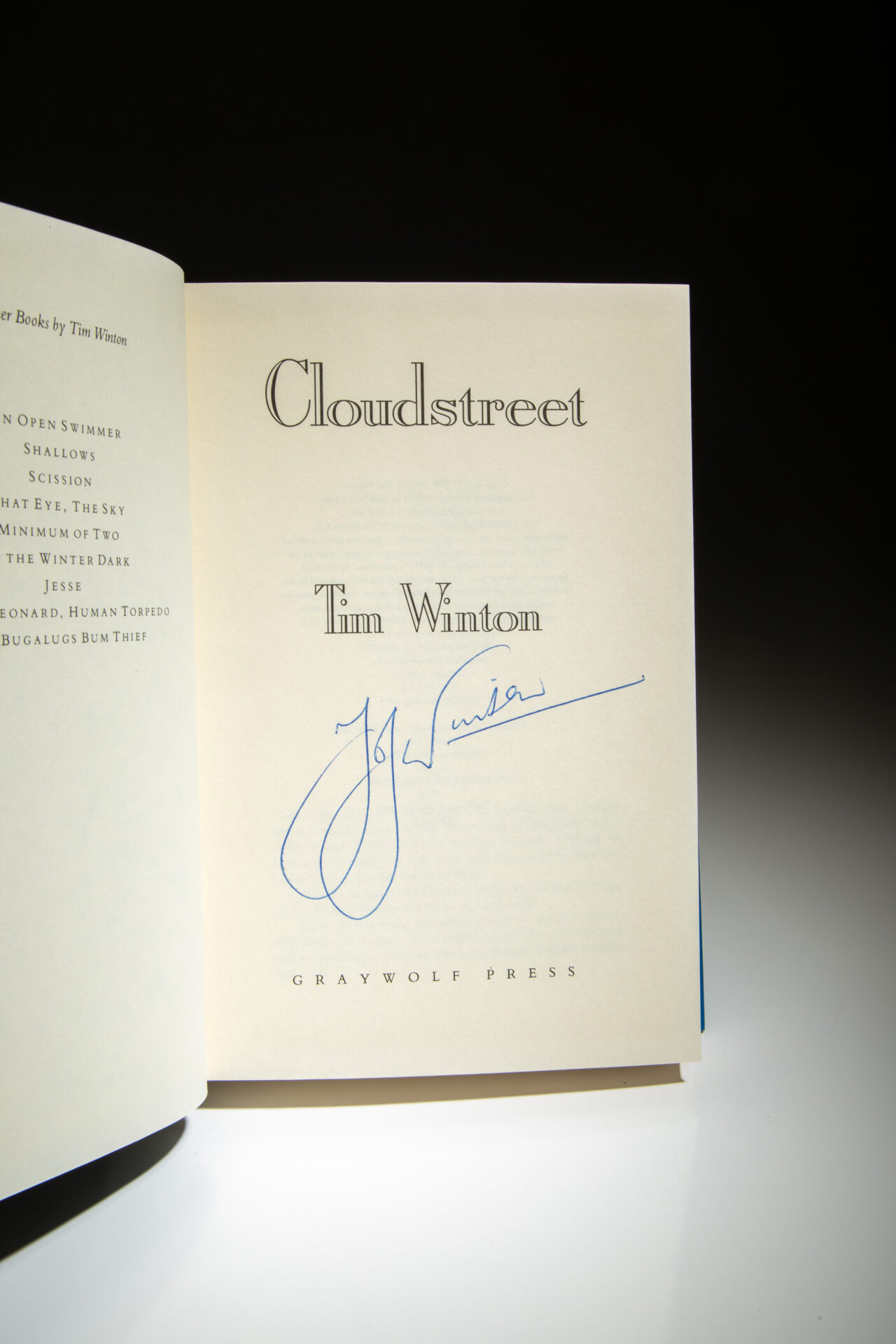 Signed first U.S. edition of Cloudstreet by Tim Winton.