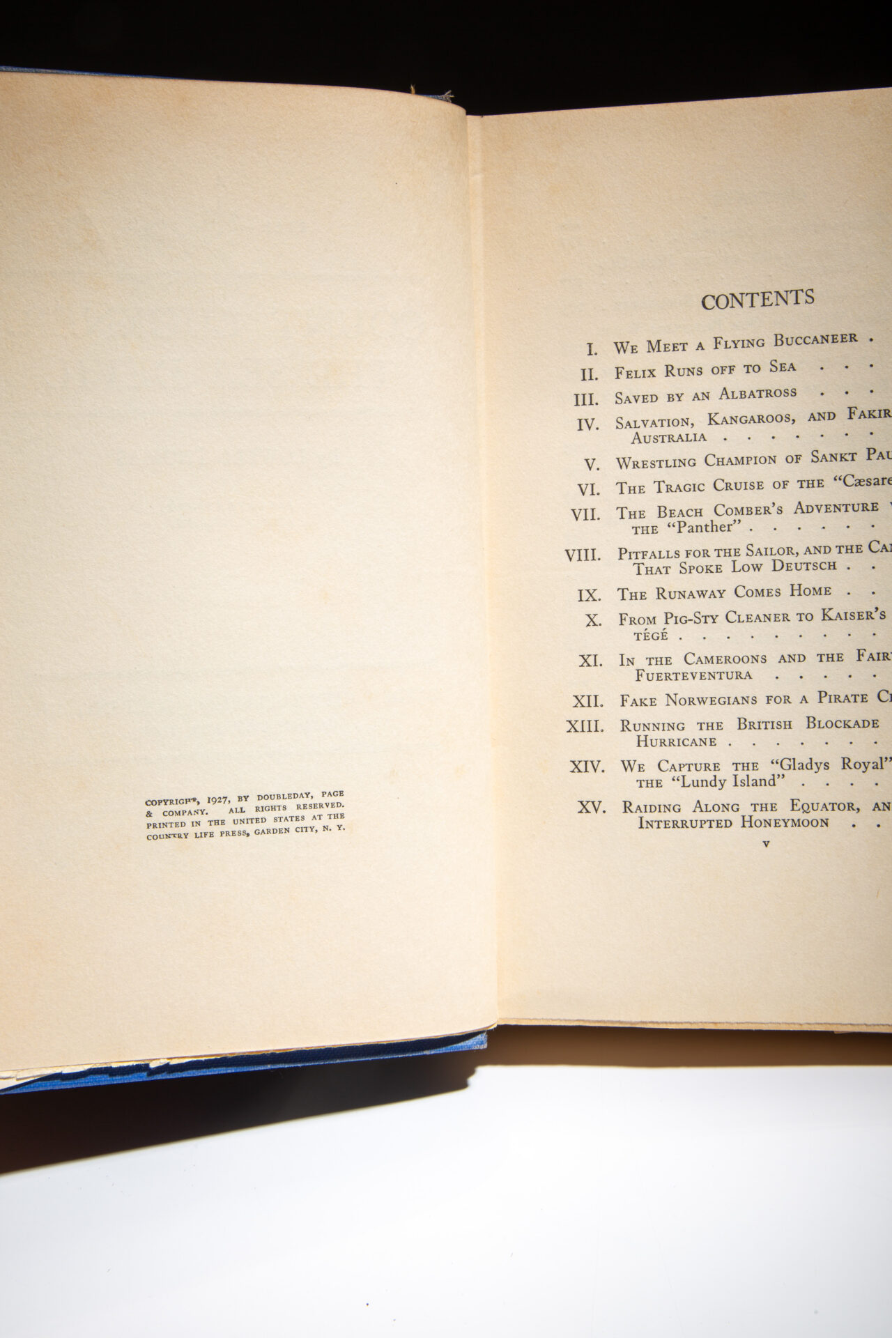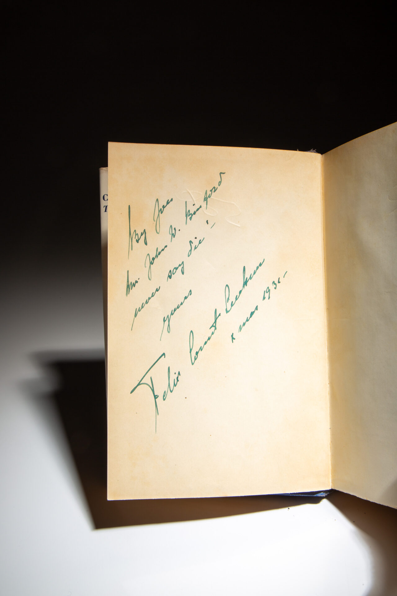 Inscribed on the second free endpaper: “By Joe / Mr. John W. Binford / never say die! / yours Felix Count Luckner / Xmas 1936.”