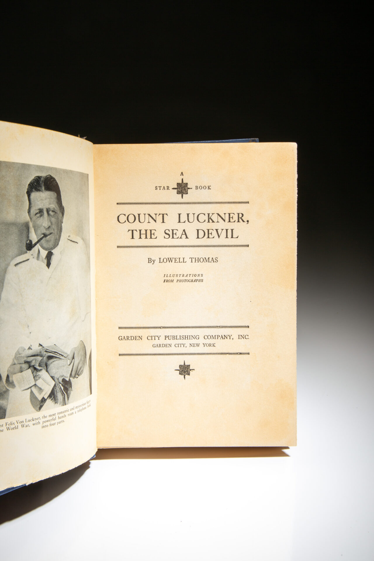 The first edition of Count Luckner, The Sea Devil, by Lowell Thomas, inscribed by Count Felix von Luckner, Captain of the SMS Seeadler.
