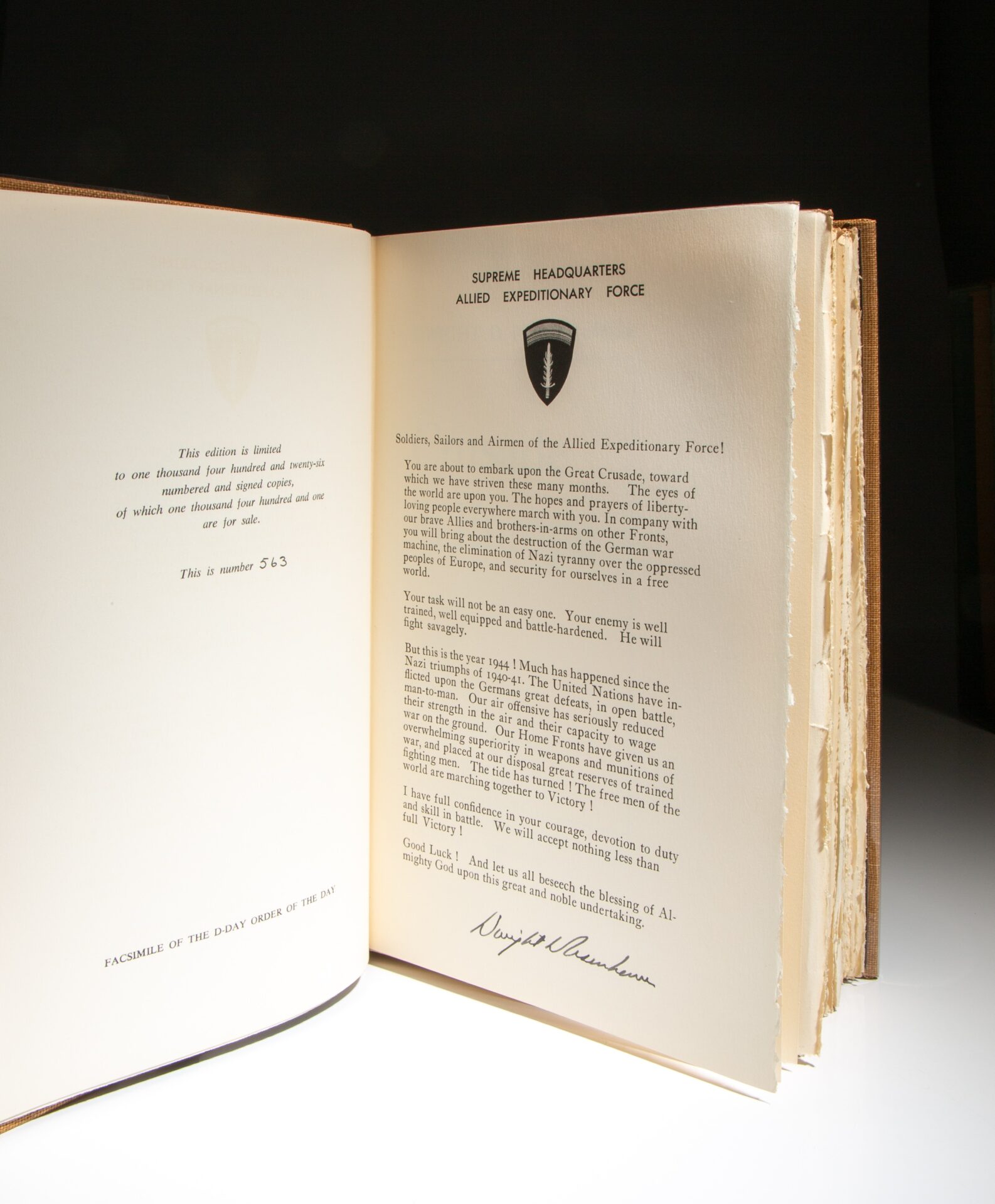 This book is a limited edition of 1426 copies signed by Dwight D. Eisenhower. This is number 563 of 1426.