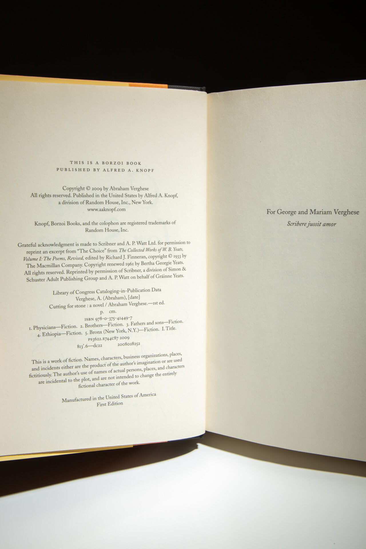 Signed first edition of Cutting for Stone: A Novel by Abraham Verghese.