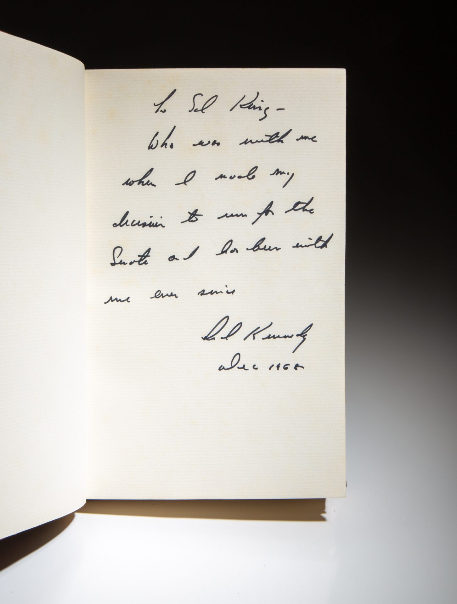 Inscribed by Senator Ted Kennedy: “To Sal King – Who was with me when I made my decision to run for the Senate and has been with me ever since. Ted Kennedy / 1968.”