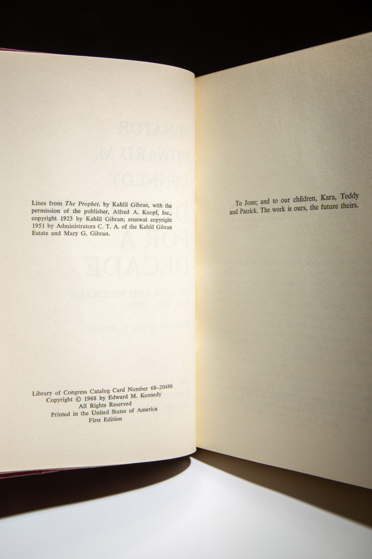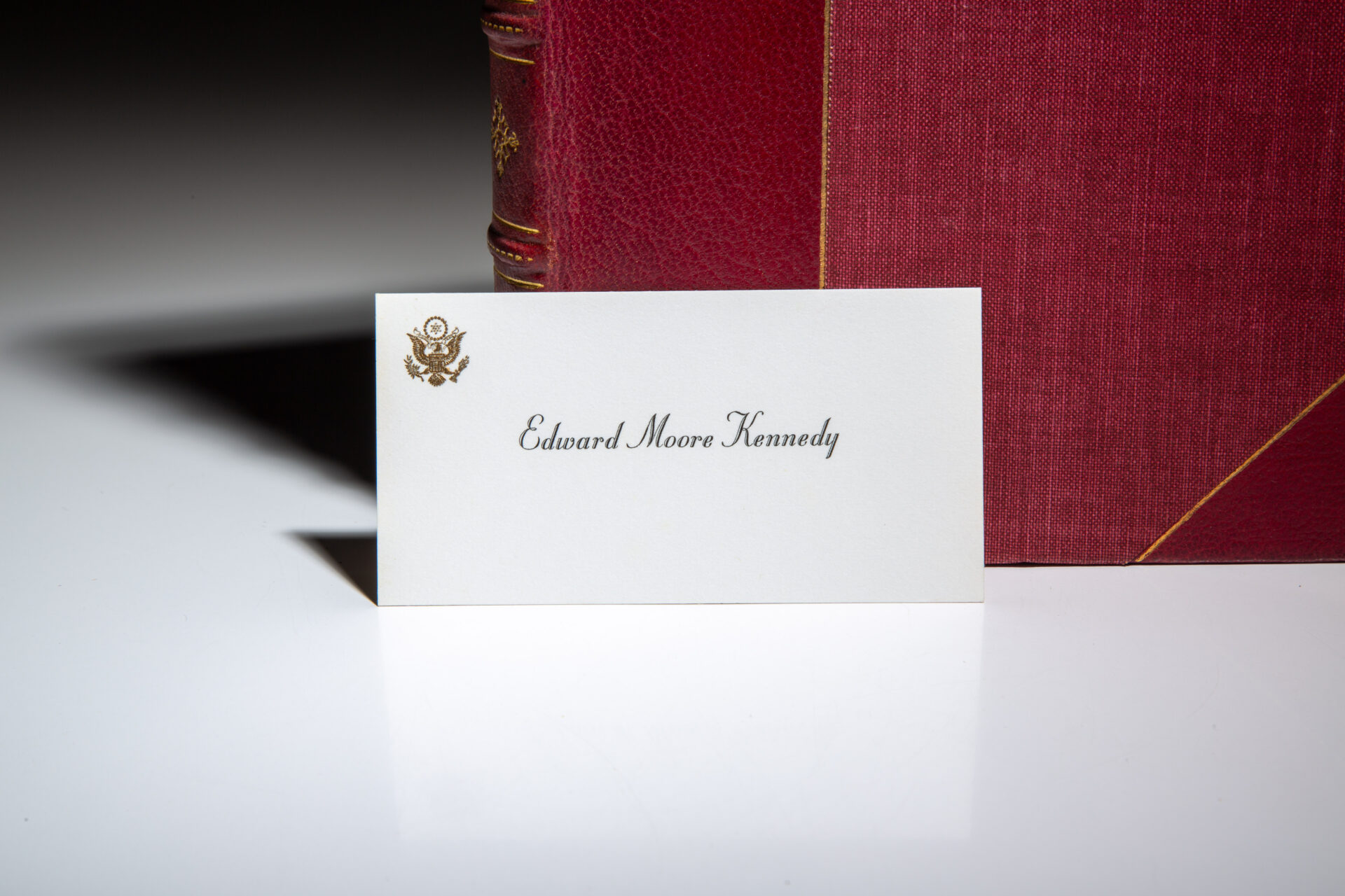 Octavo, [4], 222pp, [6]. Bound in three-quarter red morocco, title in gilt on spine with decorative raised bands. Top edge gilt, marbled end papers. Bound by The Harcourt Bindery for the personal use of Senator Edward Kennedy. Stated “first edition” on the copyright page. There is no limitation page in this volume.