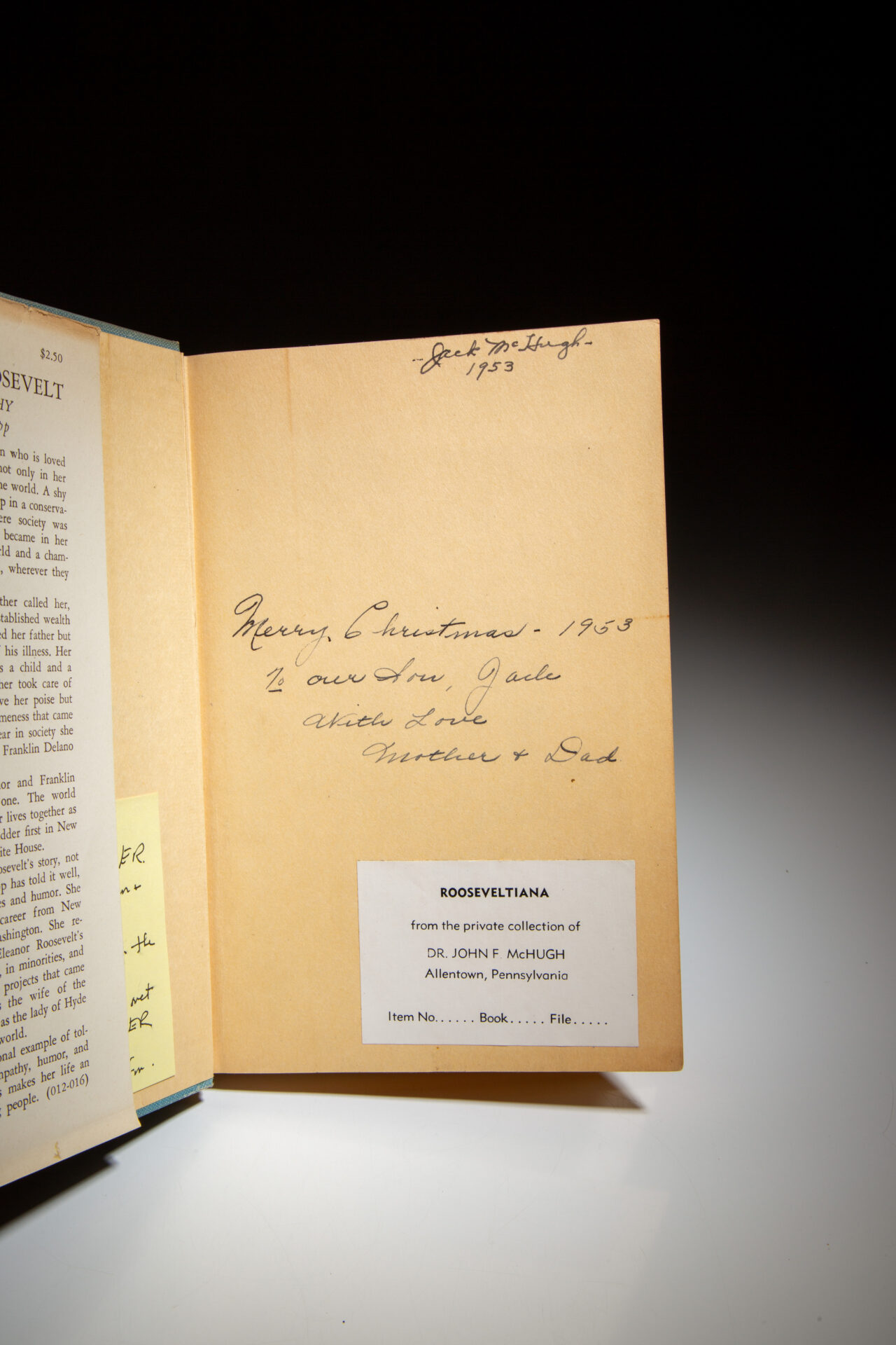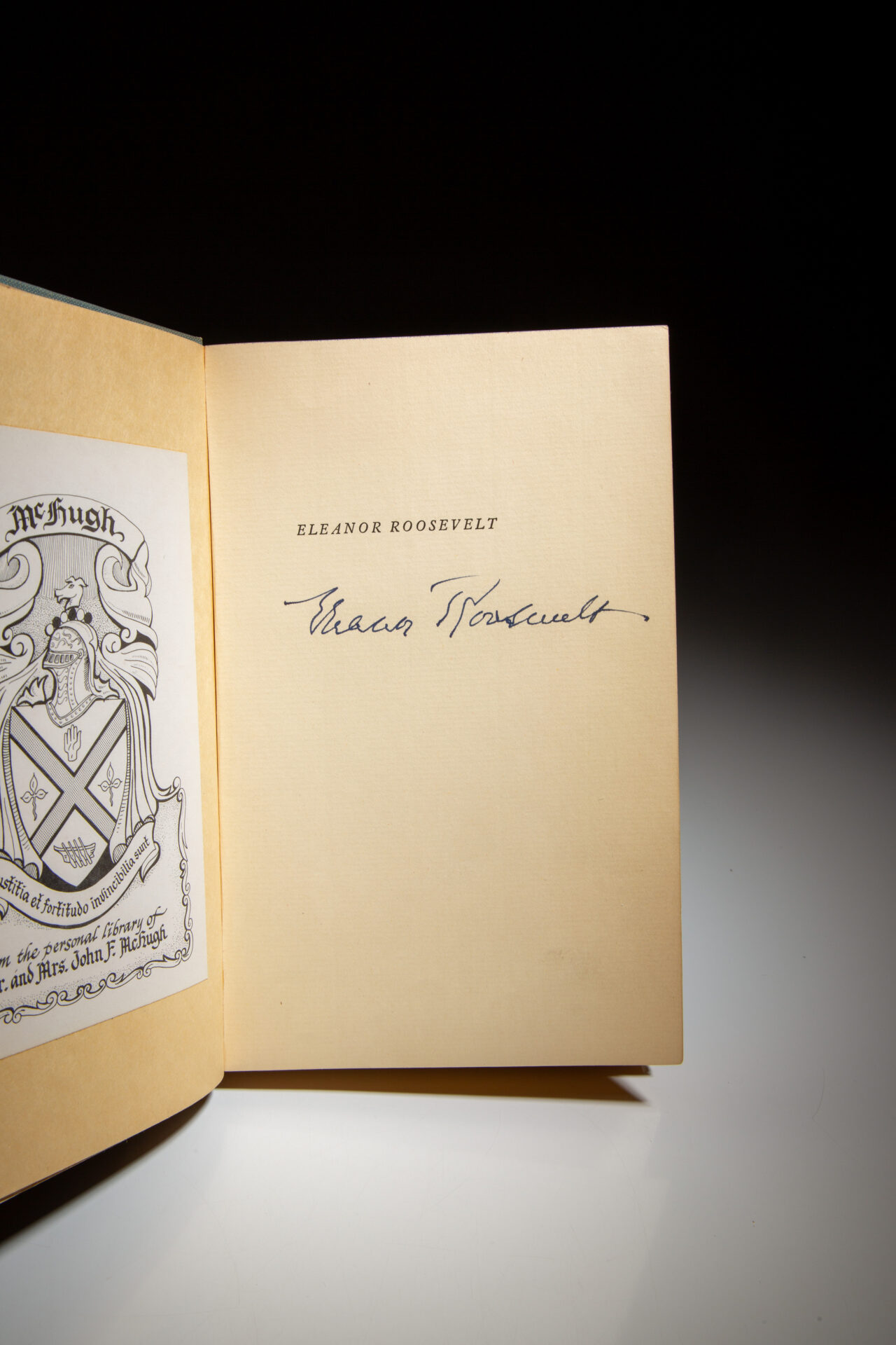 Octavo, [8], 185pp, [1]. Blue cloth, title stamped in blue on the spine. The first printing, with no additional printings noted. Frontispiece portrait of Mrs. Roosevelt. Solid text block, internally clean. Includes the bookplate of Dr. John F. McHugh and his “Rooseveltiana” collection bookplate. In the publisher’s dust jacket, $2.50 on the front flap, touch of shelf wear and wear to heel of the spine, tape repair at heel of the spine, a very good example. (Edens, I15)