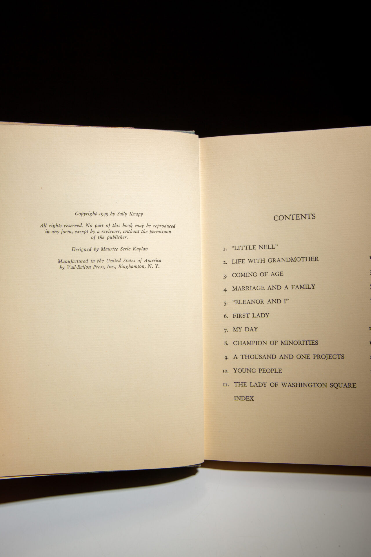 The first edition of Eleanor Roosevelt: A Biography by Sally Knapp, signed by Mrs. Eleanor Roosevelt. The only known example of this biography signed by Mrs. Roosevelt.