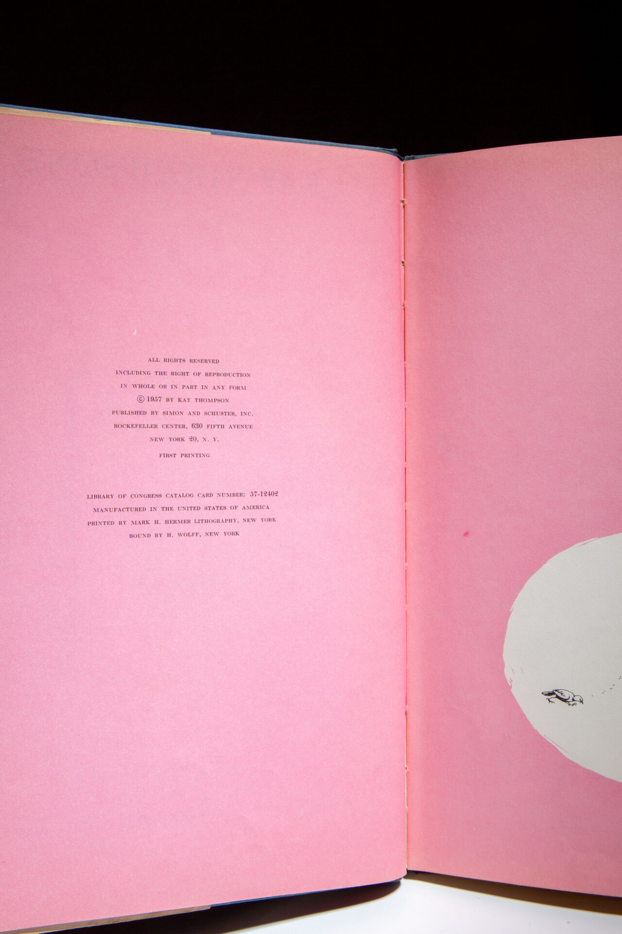 Large octavo, [unpaginated], [32 leaves]. Blue hardcover, title in silver on front cover and spine. Stated “First Printing” on copyright page. Solid text block, slight lean to spine, touch of wear along edges. Previous ownership inscription to front free endpaper. Decorated with illustrations by Hilary Knight in black, white, blue, and red throughout text. In the publisher’s dust jacket, $3.50 retail price on front flap, light sunning to spine, faint stains and ownership stamps on panels. Chips to corners and spine, short closed tears along edges, all reinforced with tape repairs on verso.