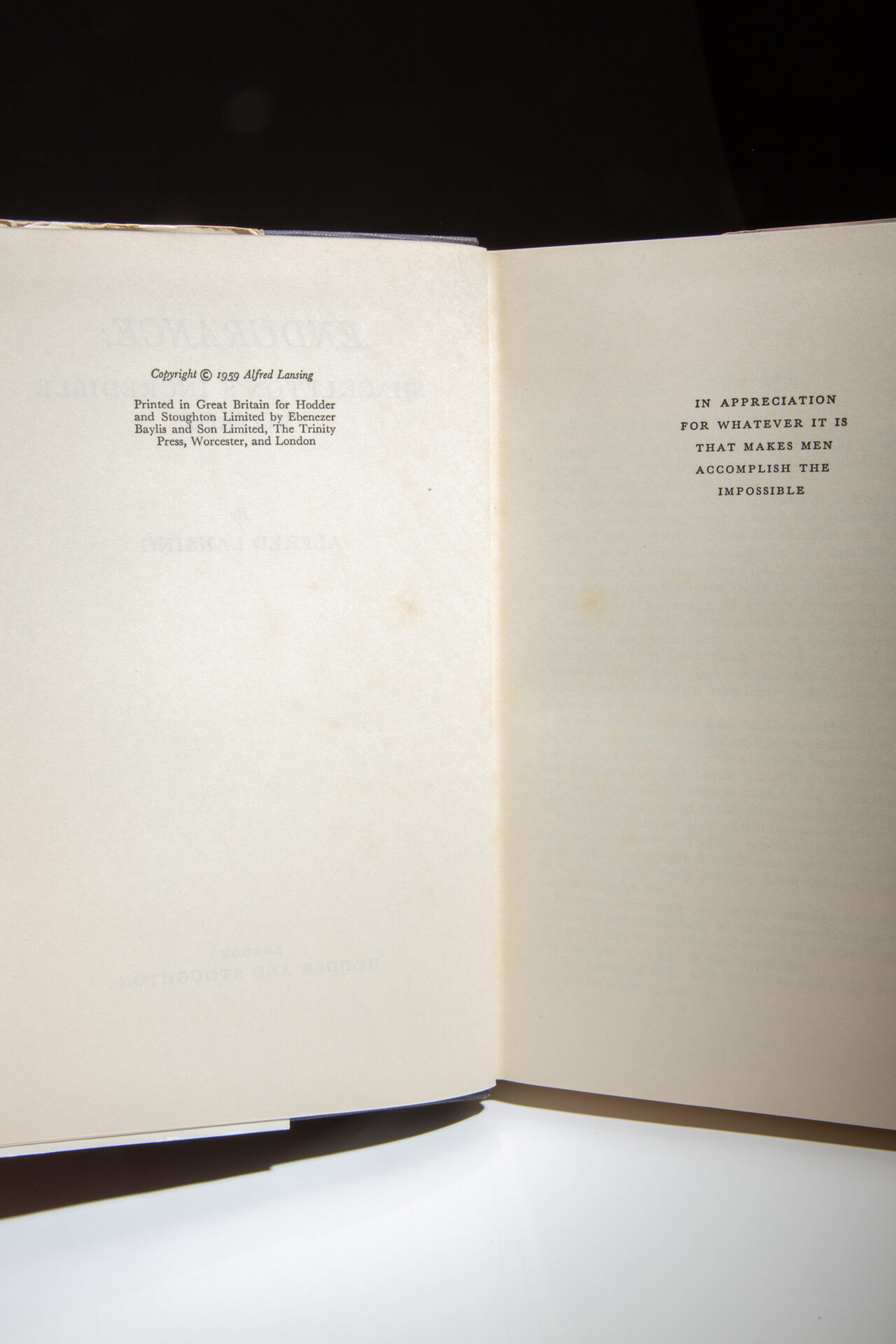 The first edition of Endurance by Alfred Lansing was published by McGraw-Hill Book Company of New York in 1959, and later that year by Hodder and Stoughton in London.