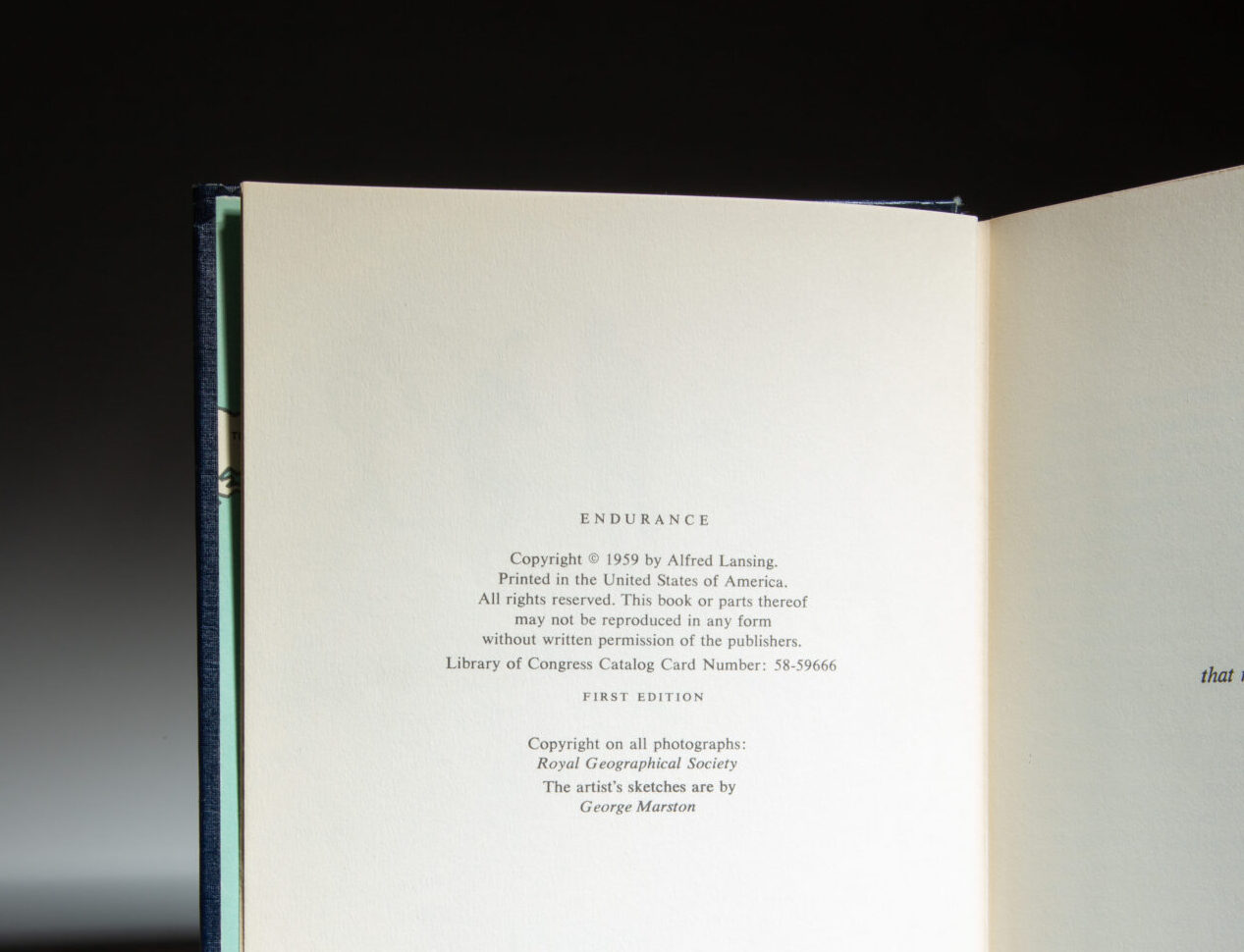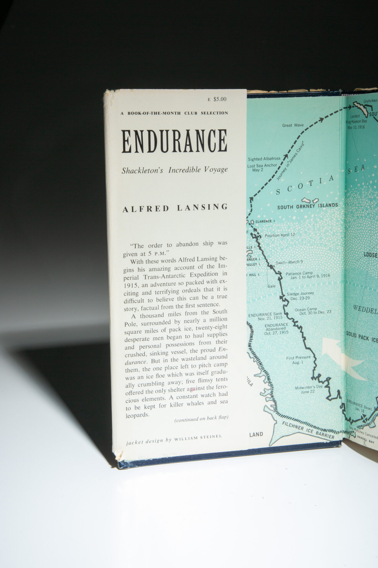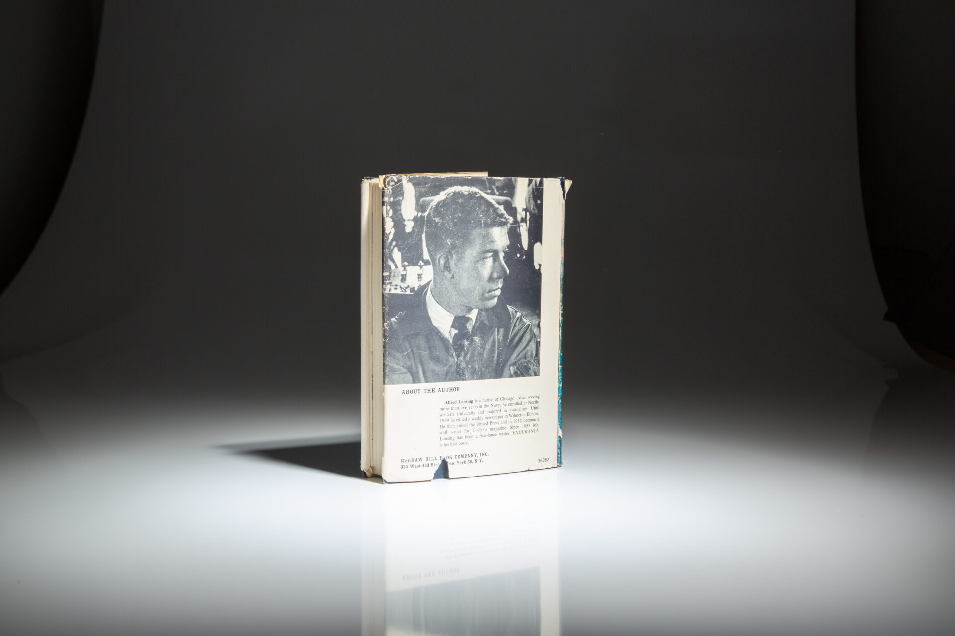 The first edition of Endurance by Alfred Lansing was published by McGraw-Hill Book Company of New York in 1959. It is often confused with the Book Club edition, released the same year. The first edition from McGraw-Hill states “First Edition” on the copyright, has a retail price of $5.00 on the front flap, with “Book-of-The-Month Club Selection” printed below the retail price. The rear panel of the dust jacket has a photograph of Alfred Lansing, with a short biography.