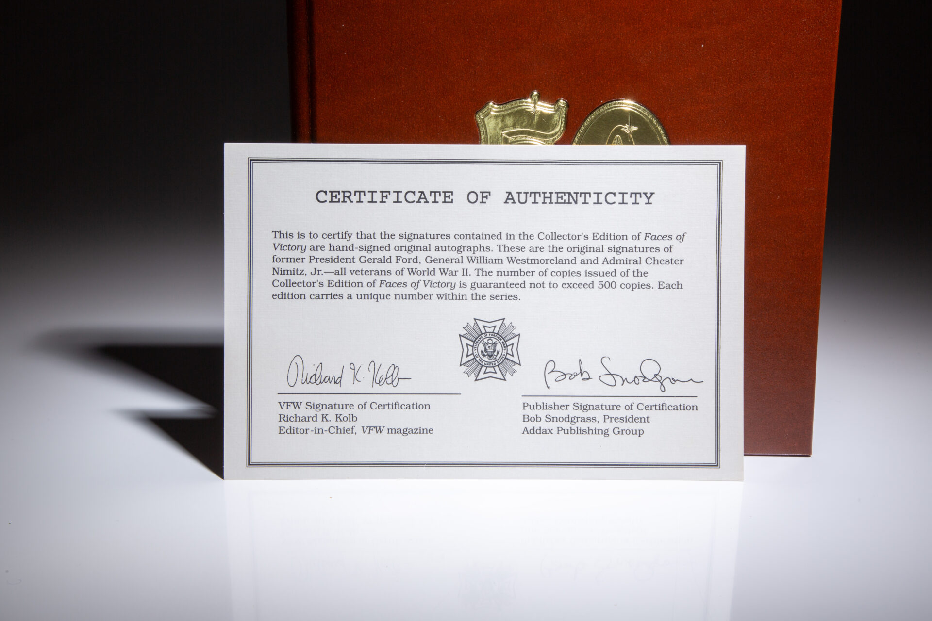 The Faces of Victory, The Fall of the Rising Sun, a limited edition signed by President Gerald R. Ford, General William Westmoreland and Rear Admiral Chester W. Nimitz, Jr.