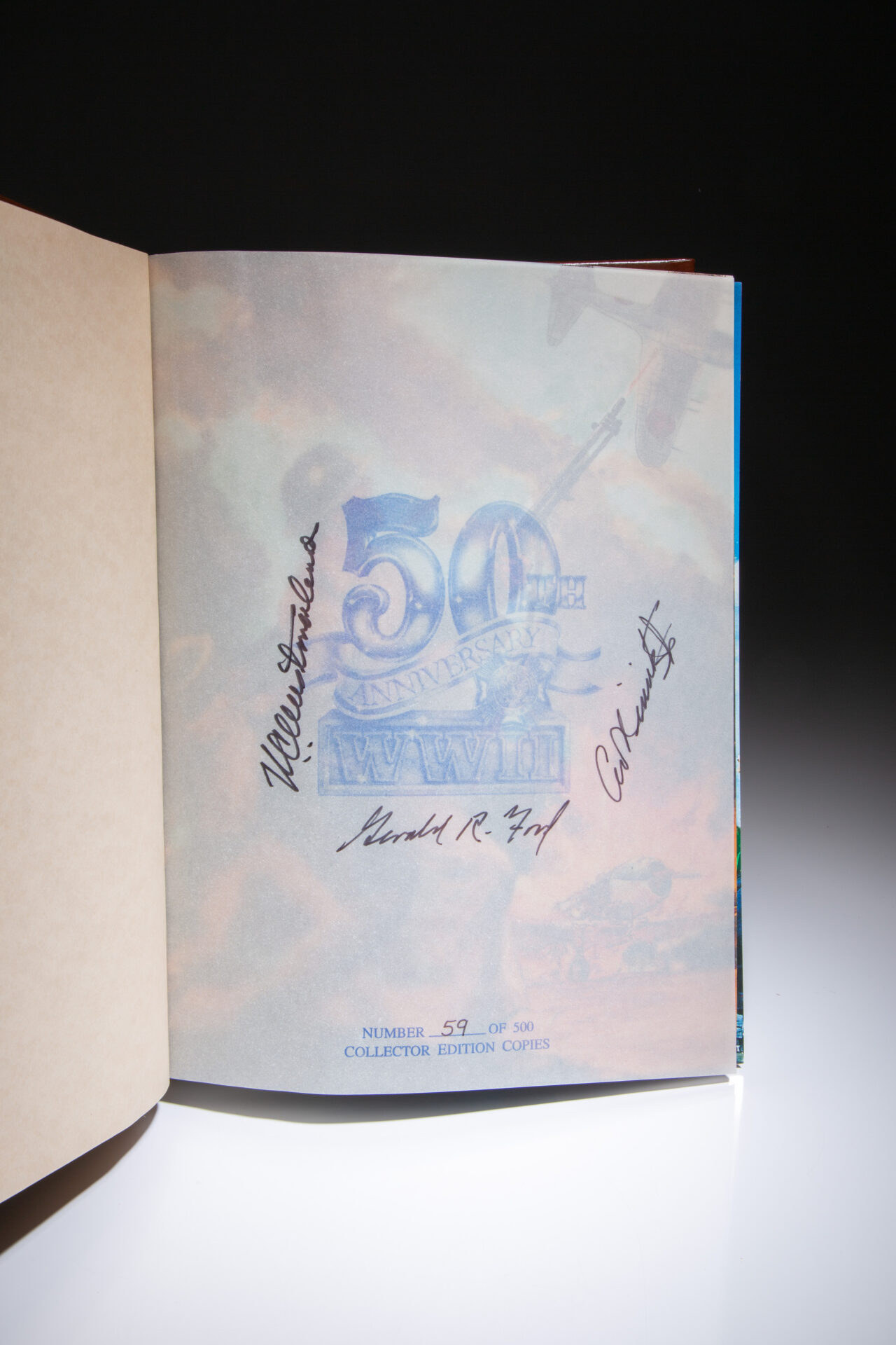 From a limited edition of 500 signed copies, this being number 59. Signed on heavy tissue paper by President Gerald R. Ford, Gen. William Westmoreland and Rear Admiral Chester Nimitz Jr., opposite title page.