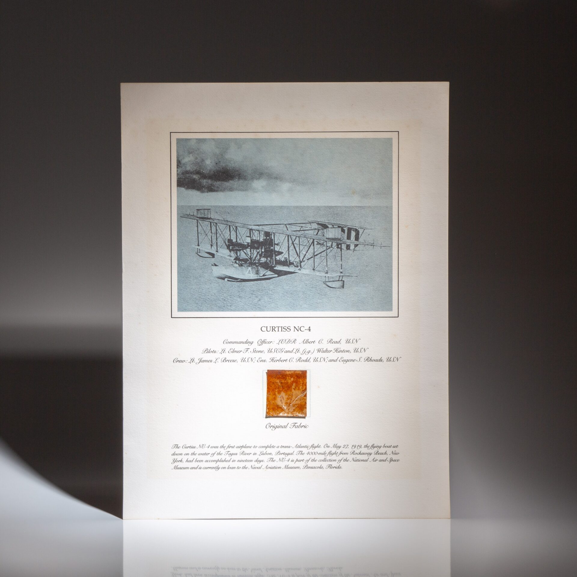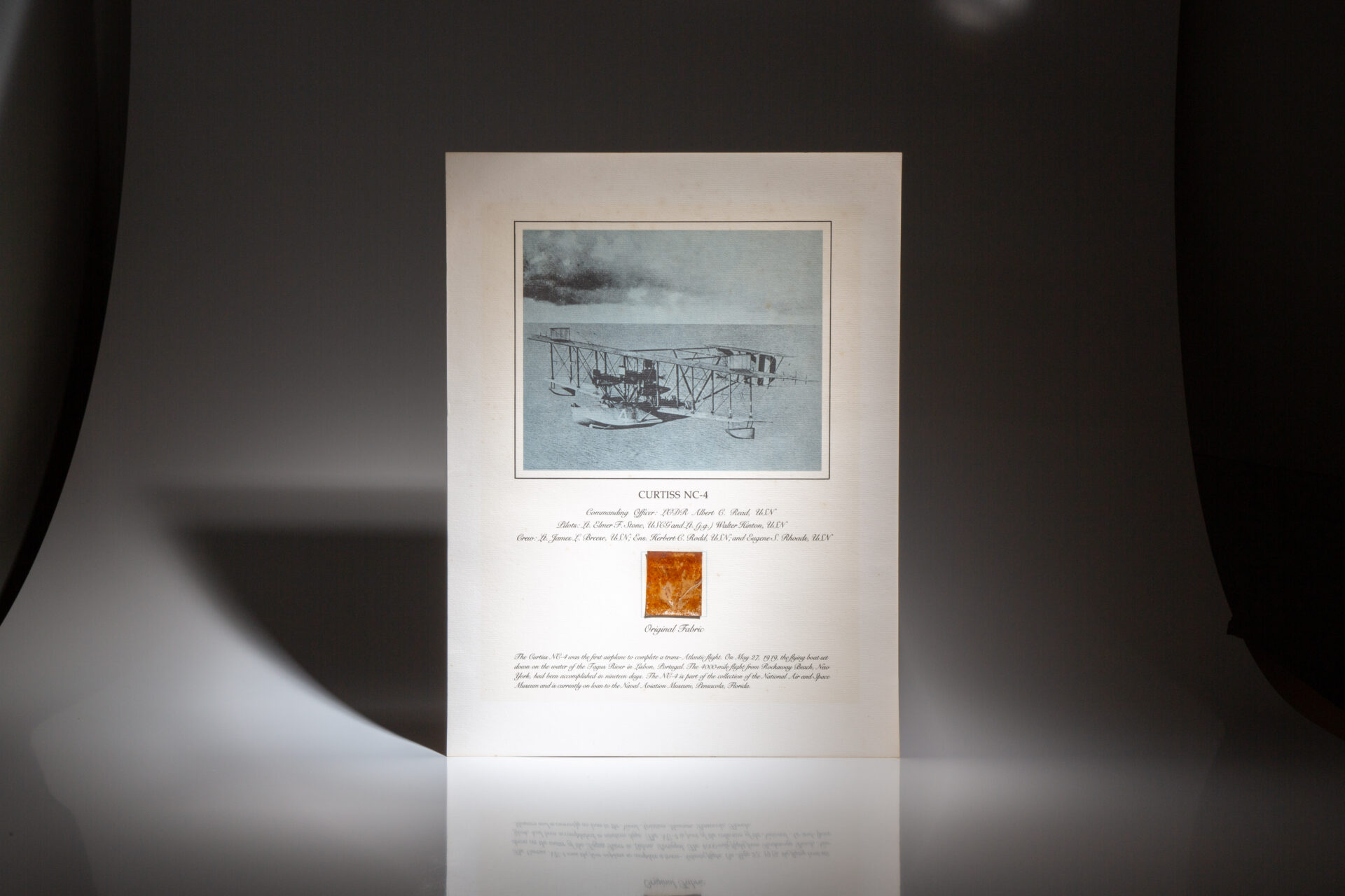 A piece of fabric from the Curtiss NC-4 Flying Boat, which made the first transatlantic flight on May 27, 1919. This relic was produced by the Smithsonian’s National Air and Space Museum, which restored the aircraft on the 50th Anniversary of the flight, in 1969.