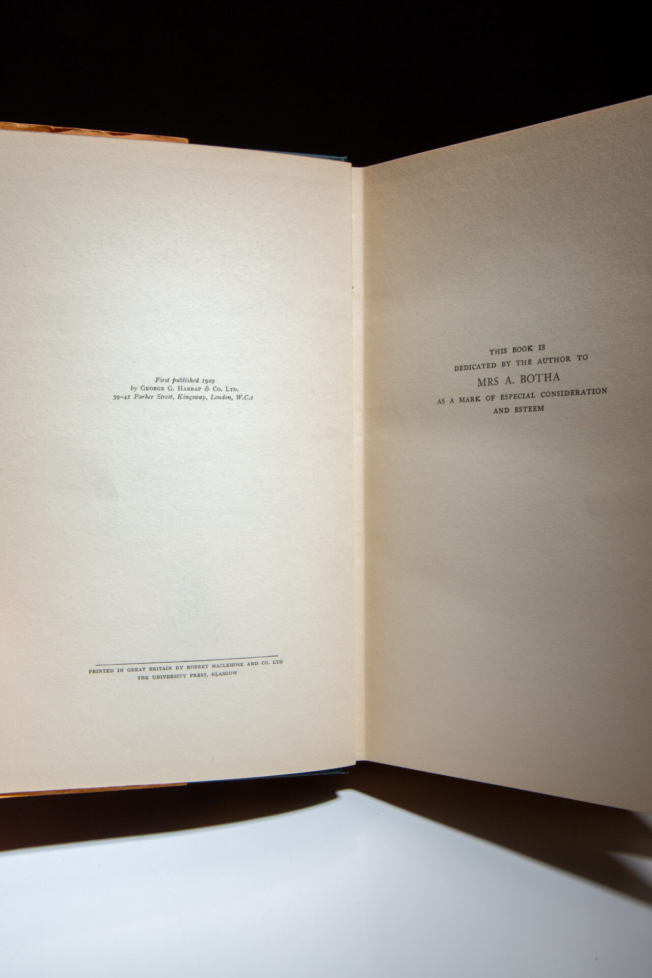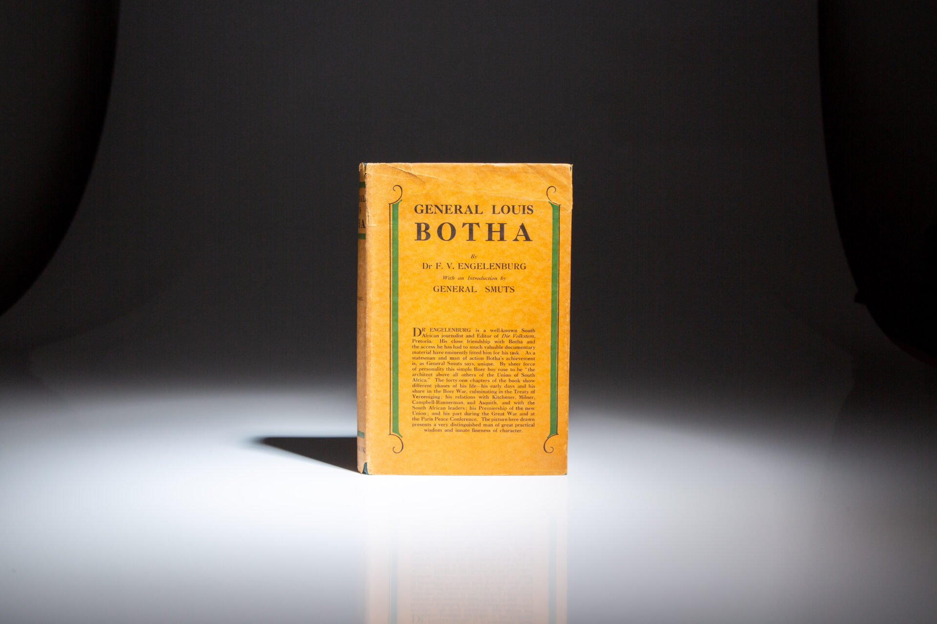 Octavo, 351pp, [1]. Green cloth, title stamped in gilt. The first English language edition, as stated on the copyright page. Preceded by the “Afrikaans Edition,” published March, 1928. Internally clean, solid text block. American Embassy stamp on the front free endpaper. Complete with frontispiece portrait of General Botha, 26 illustrations and four maps. In the publisher’s dust jacket, short closed tear along front hinge, light soiling to the spine, a very good example.