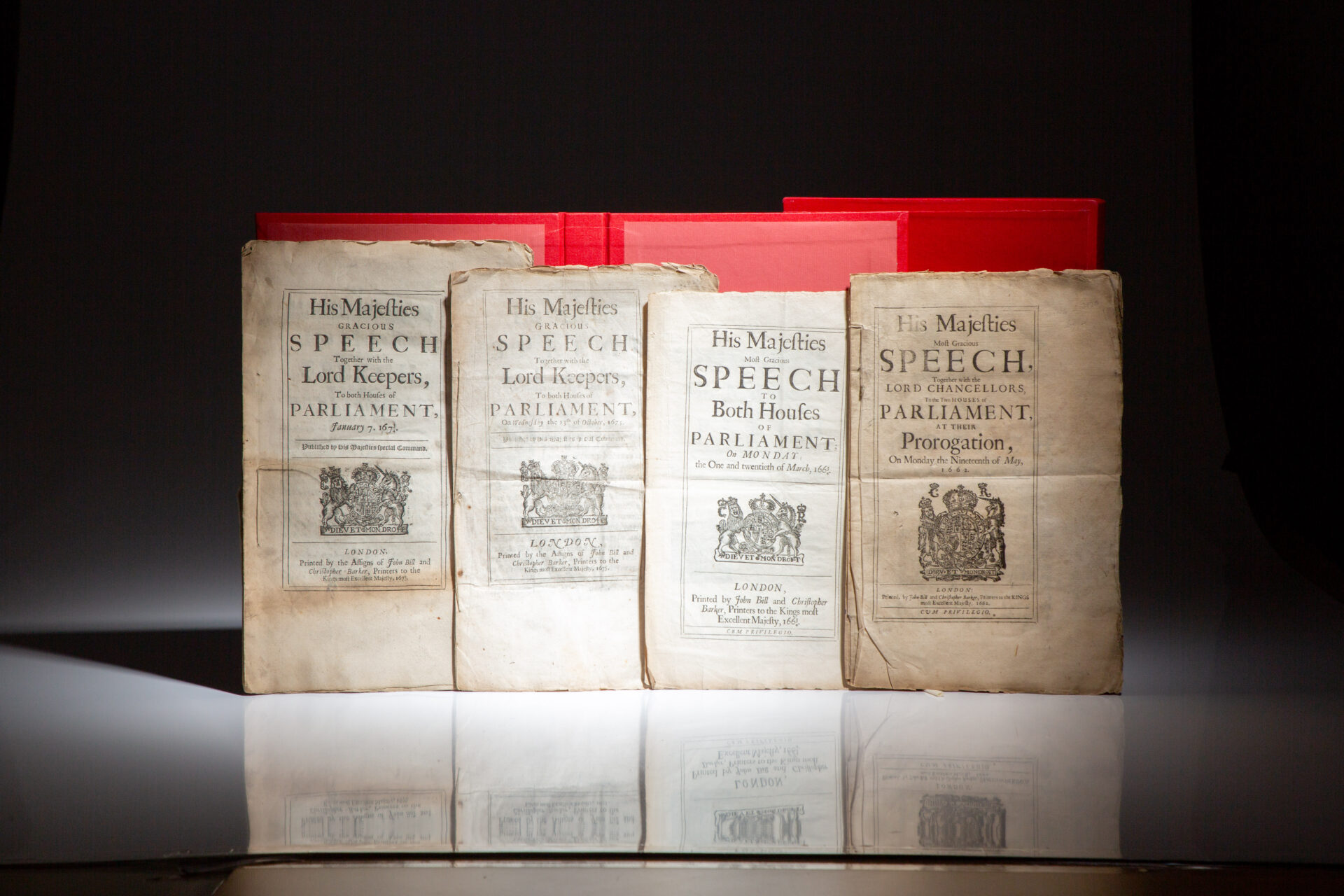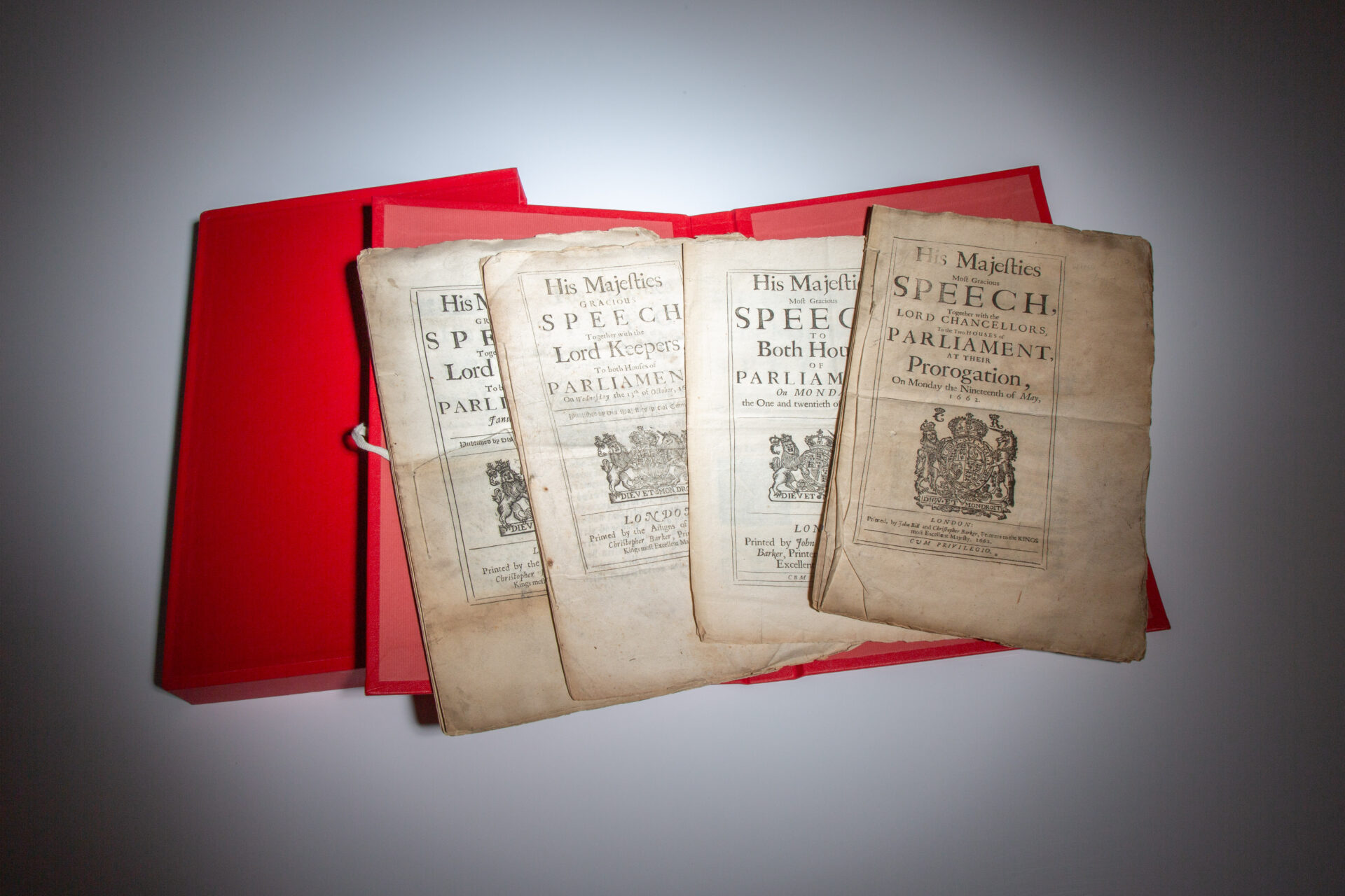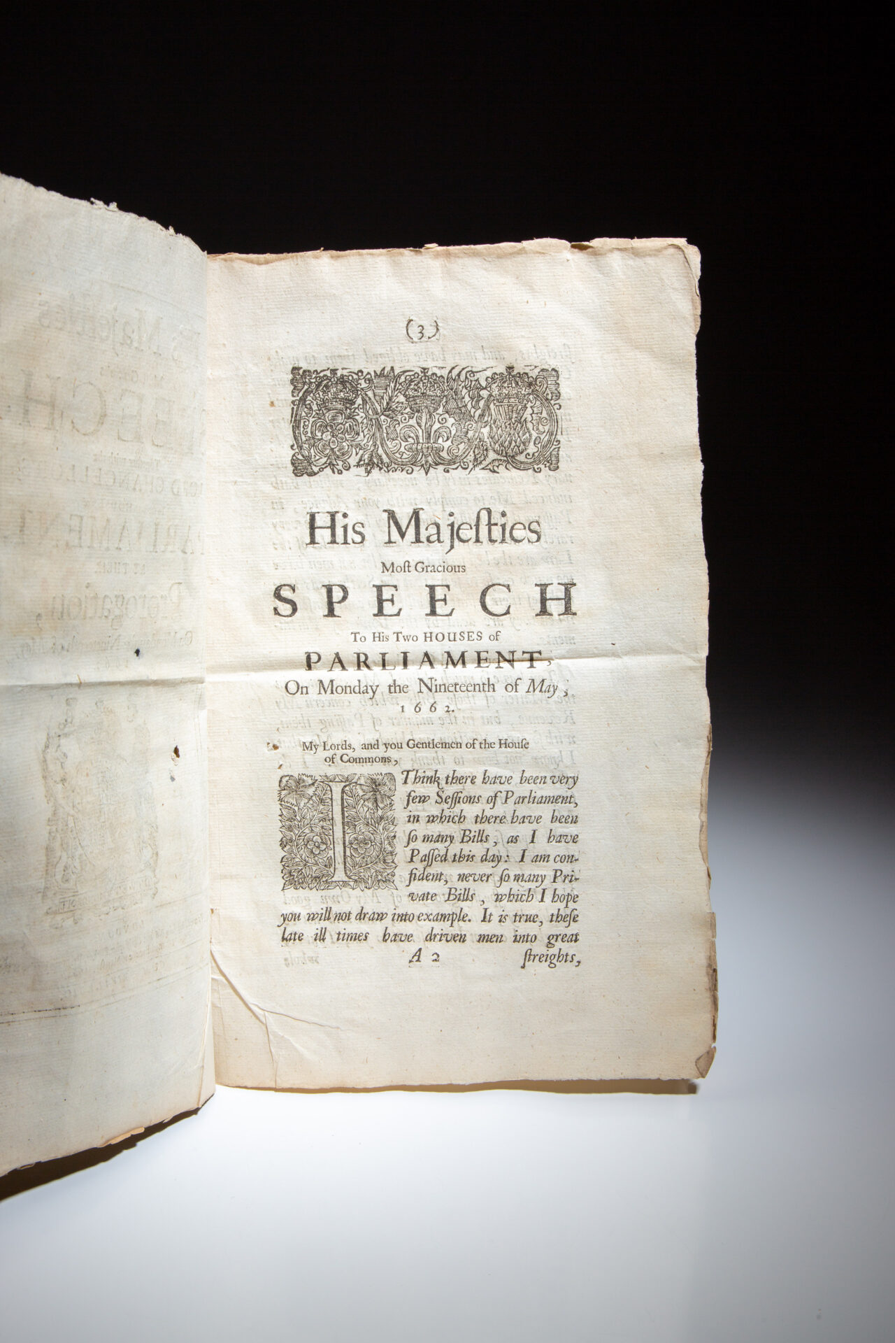 His Majesty, Charles II, Speeches to Parliament, four pamphlets, including the years 1662, 1664, 1674, and 1675.