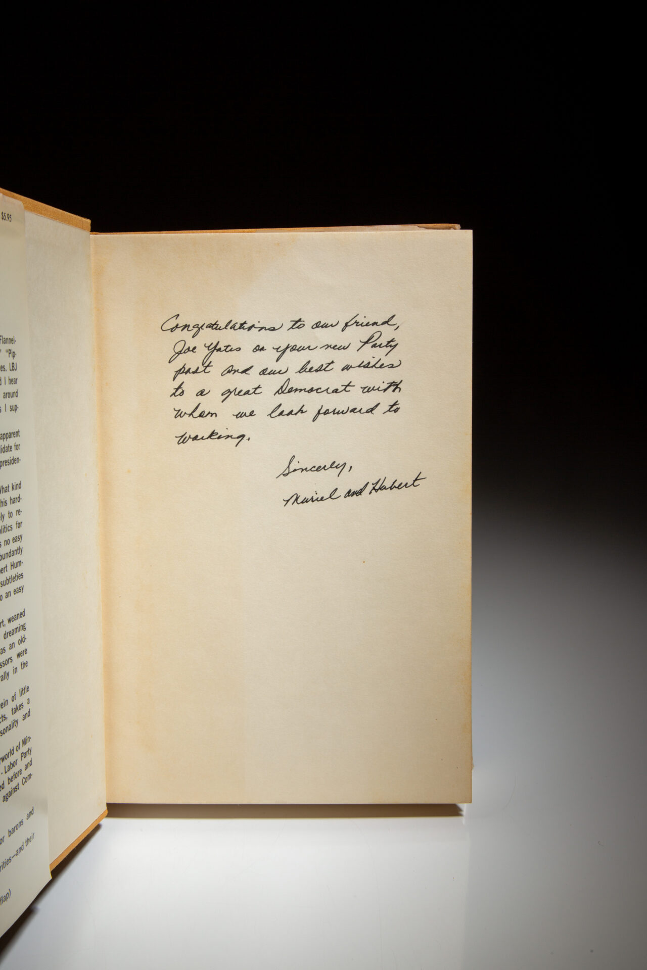 Inscribed by Vice President Humphrey on the front free endpaper: “Congratulations to our friend, Joe Yates on your new Party past and our best wishes to a great Democrat with whom we look forward to working. Sincerely, Muriel and Hubert.”