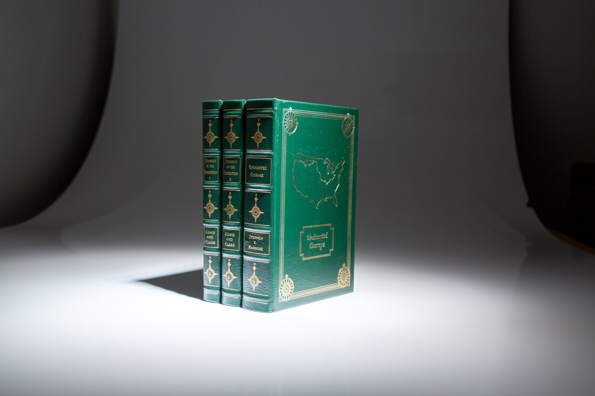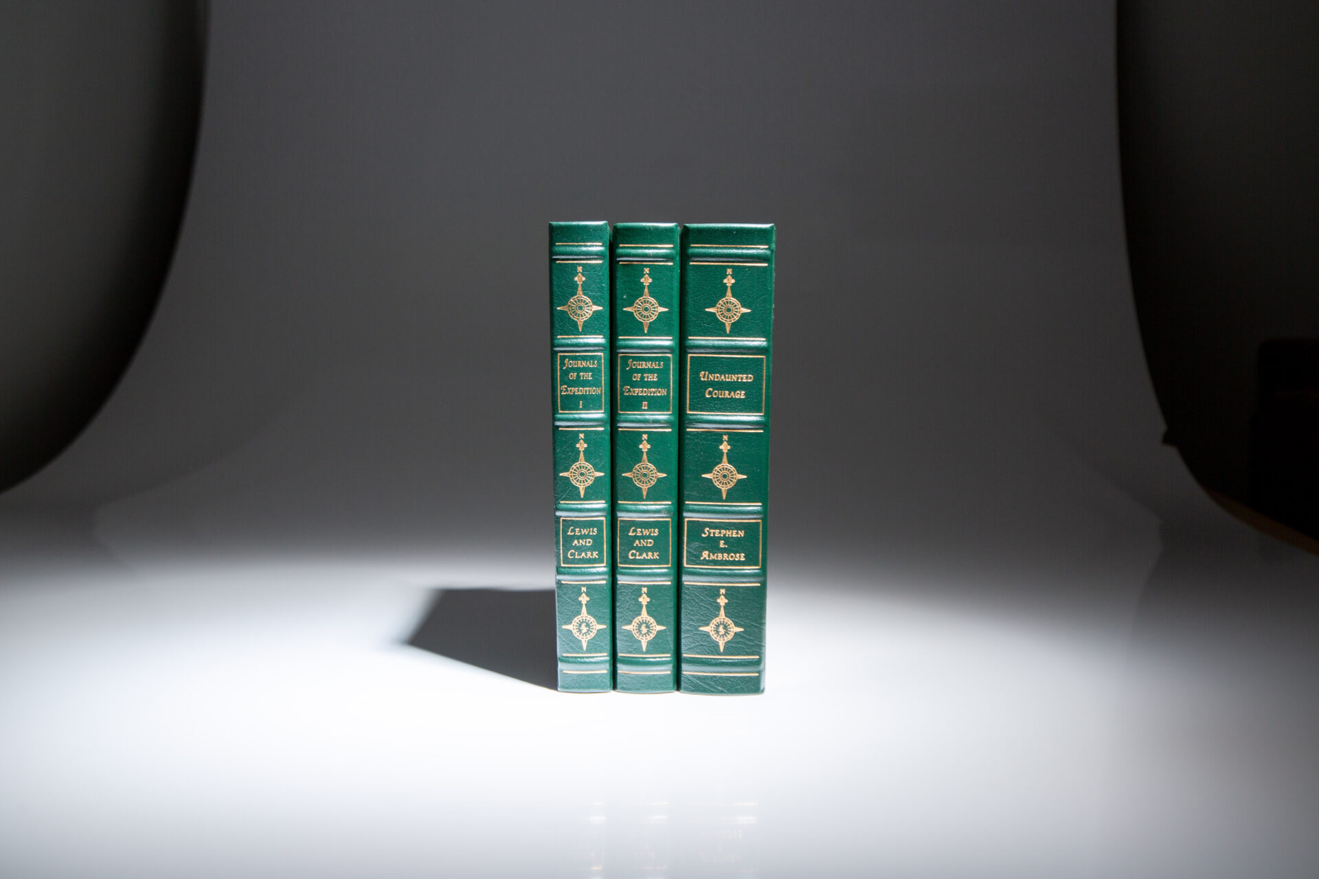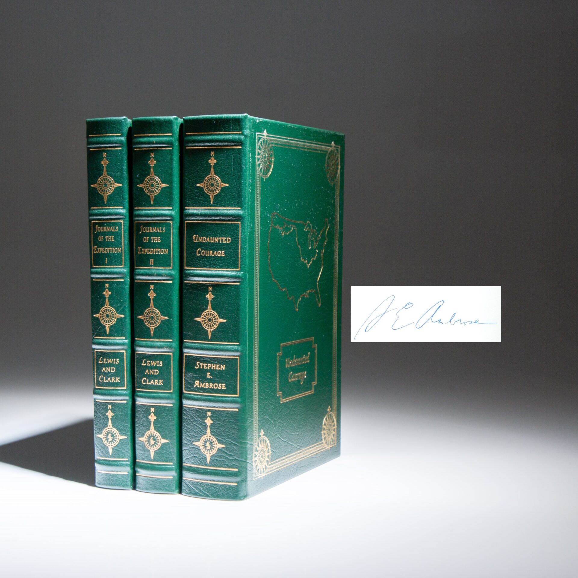 Octavo, [three volumes]. Bound in full green morocco, title stamped in gilt on the spine. All edges gilt, silk endpapers. Includes the paperwork from The Easton Press. Faint scratch along top edge of Volume II of the Journals of the Expedition, otherwise fine. Internally clean. Signed on the limitation page of Undaunted Courage by Stephen Ambrose.