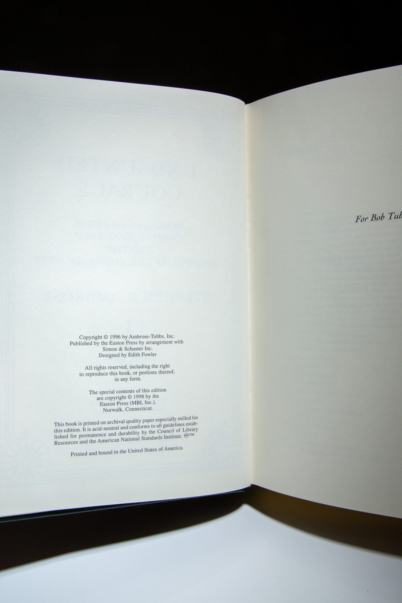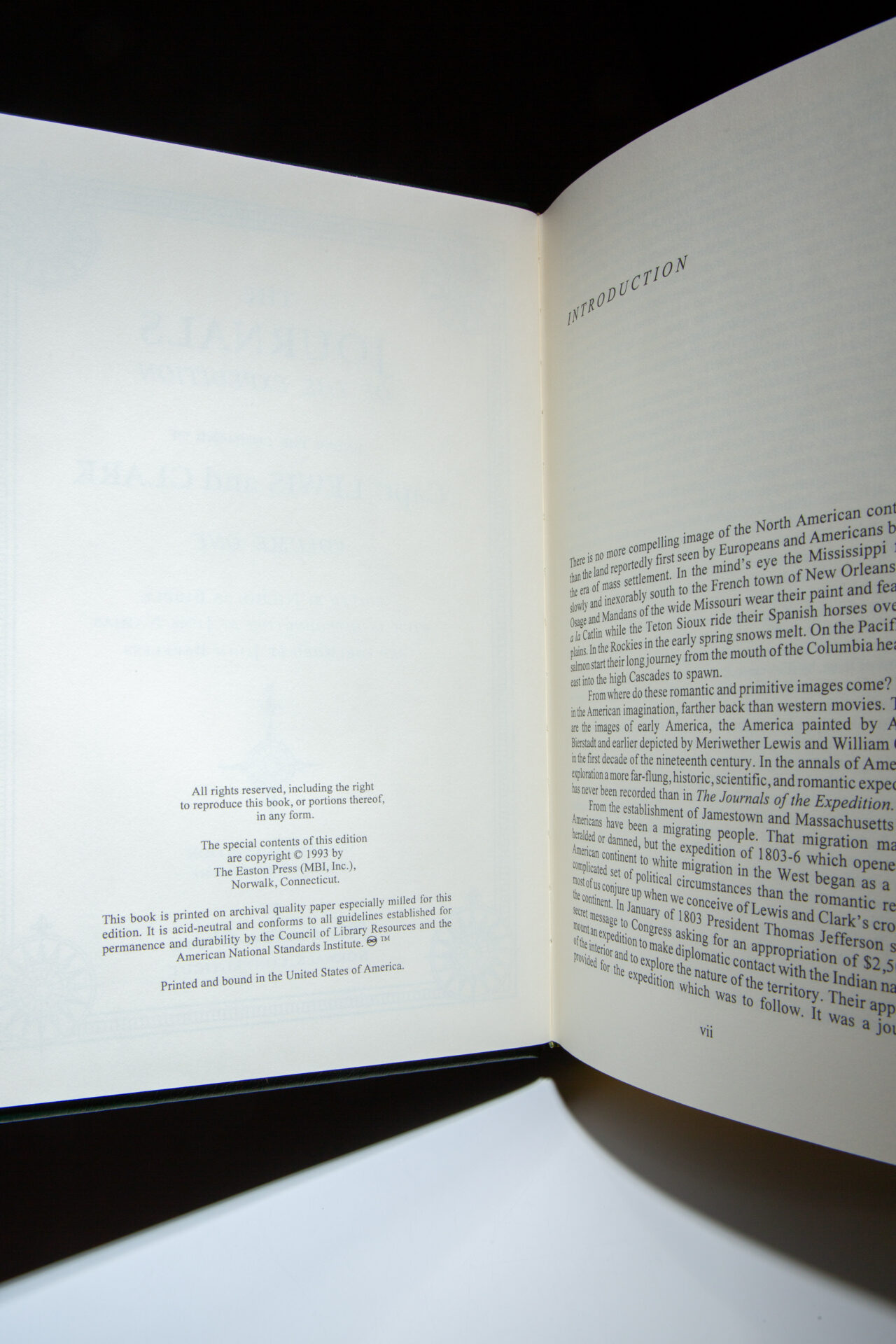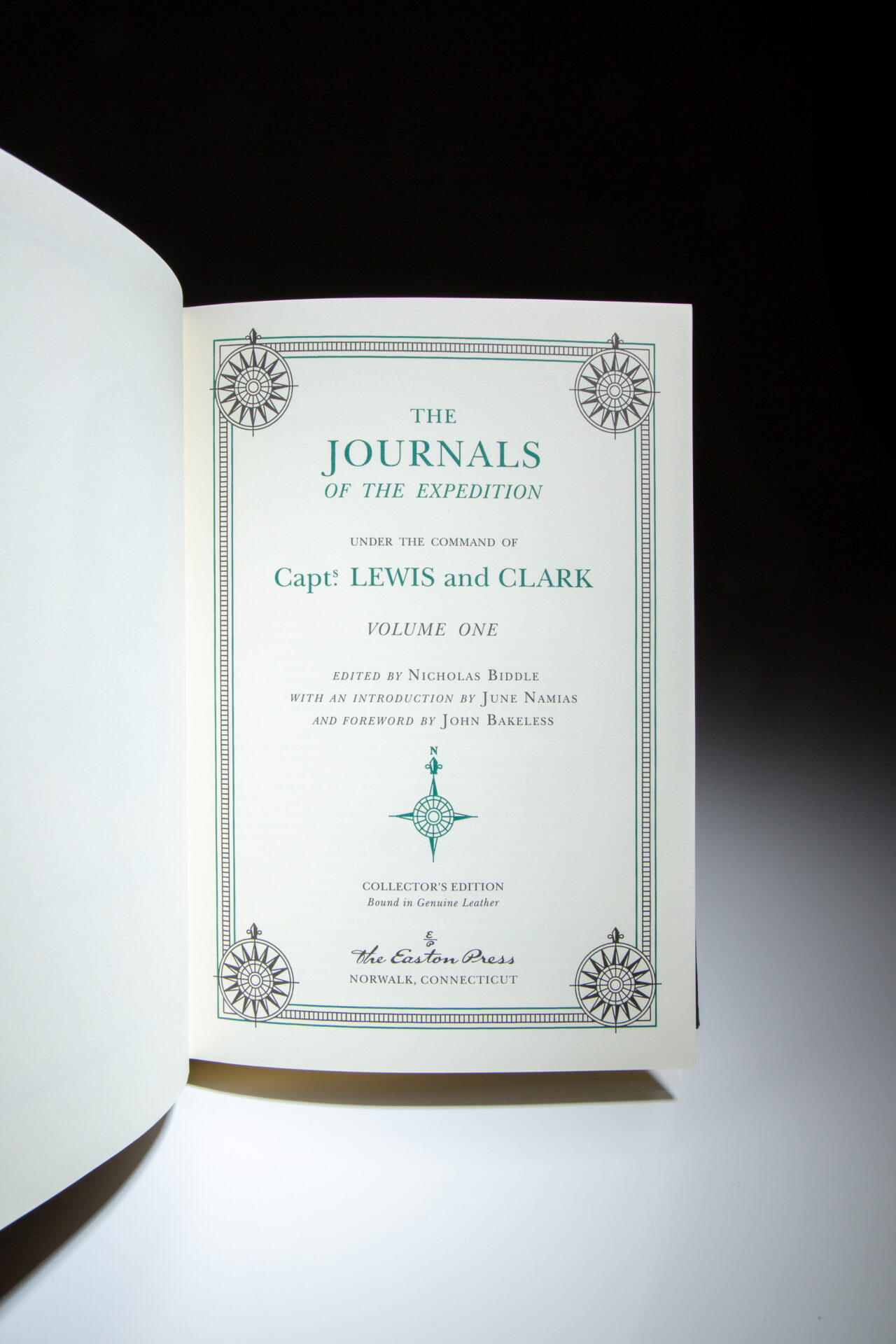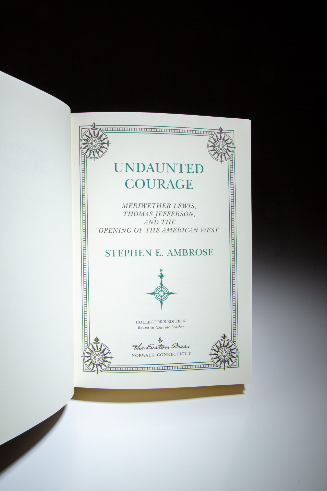 Octavo, [three volumes]. Bound in full green morocco, title stamped in gilt on the spine. All edges gilt, silk endpapers. Includes the paperwork from The Easton Press. Faint scratch along top edge of Volume II of the Journals of the Expedition, otherwise fine. Internally clean. Signed on the limitation page of Undaunted Courage by Stephen Ambrose.