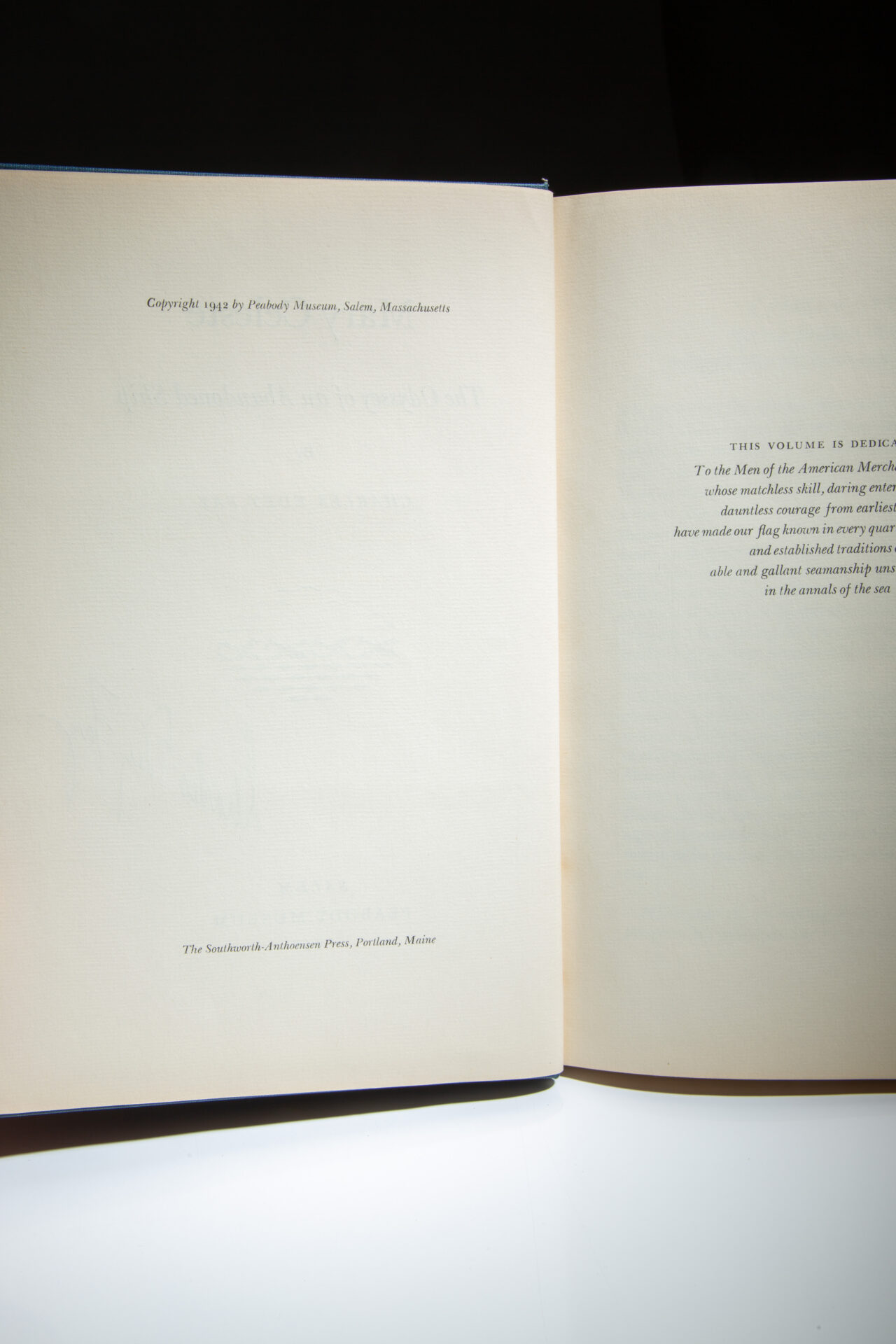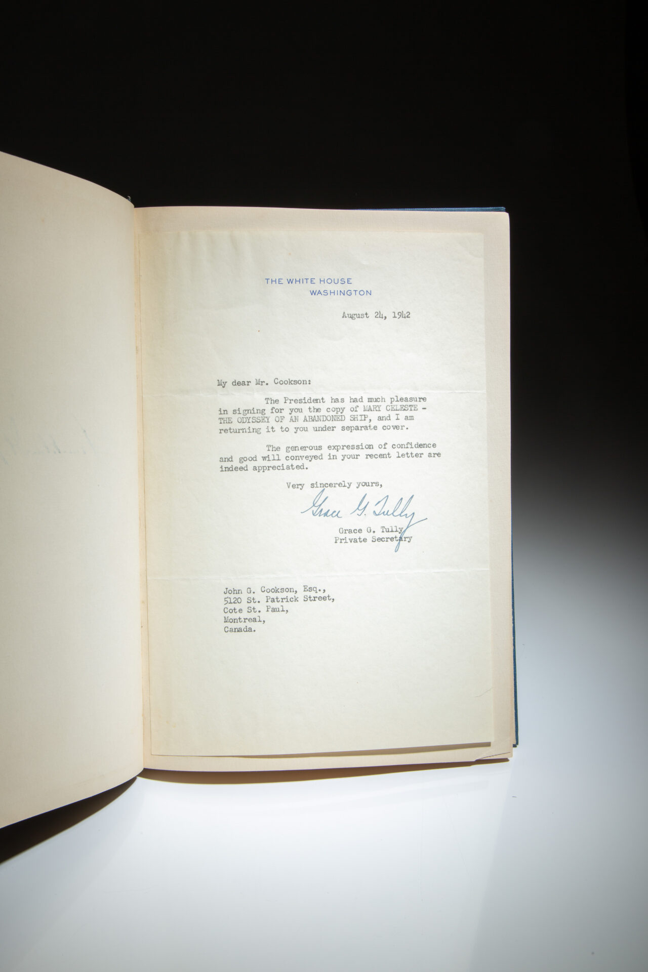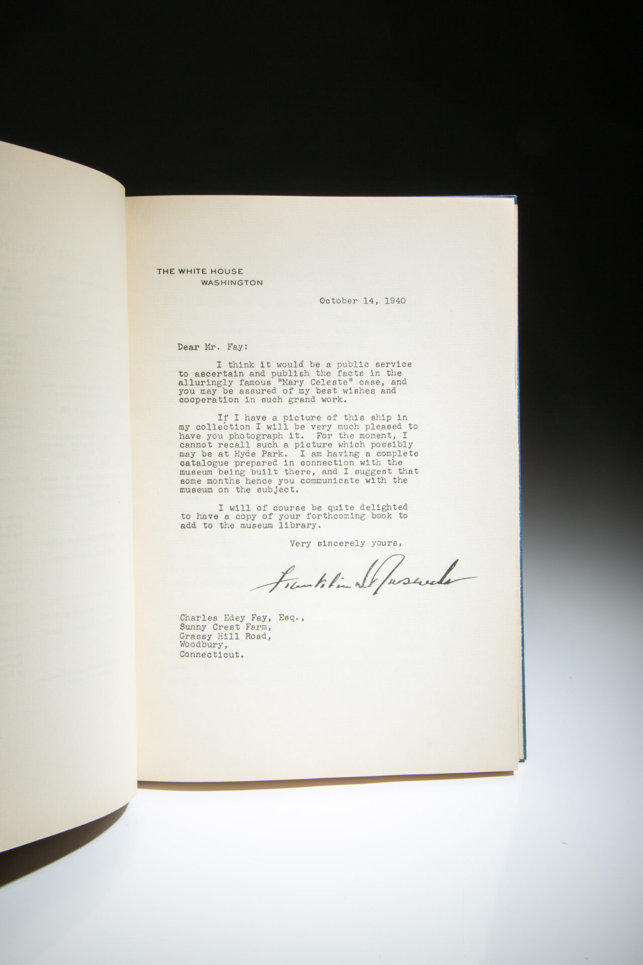 The first edition of Mary Celeste: The Odyssey of an Abandoned Ship by Charles Edey Fay, signed by President Franklin Roosevelt, who encouraged the publication of this book.