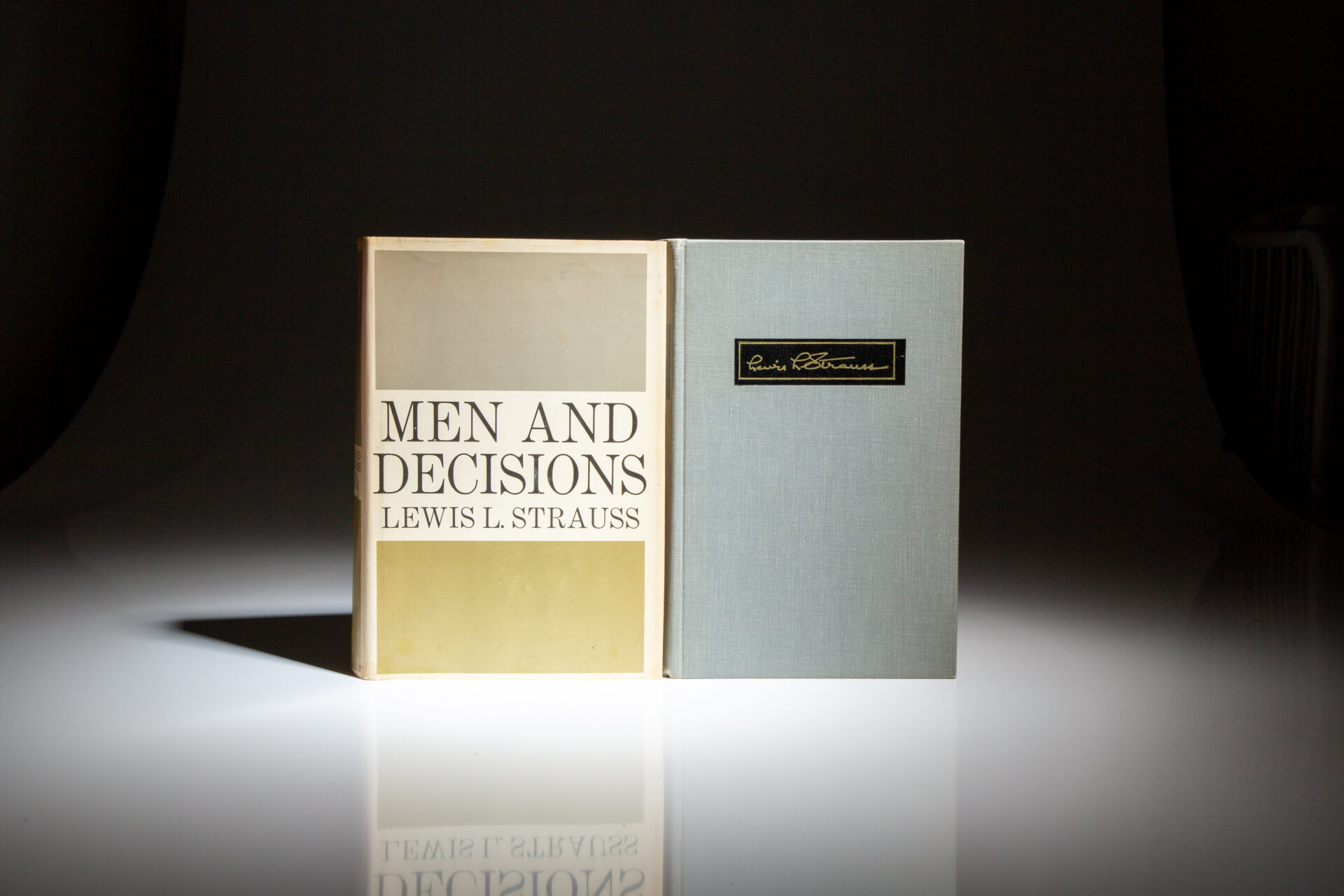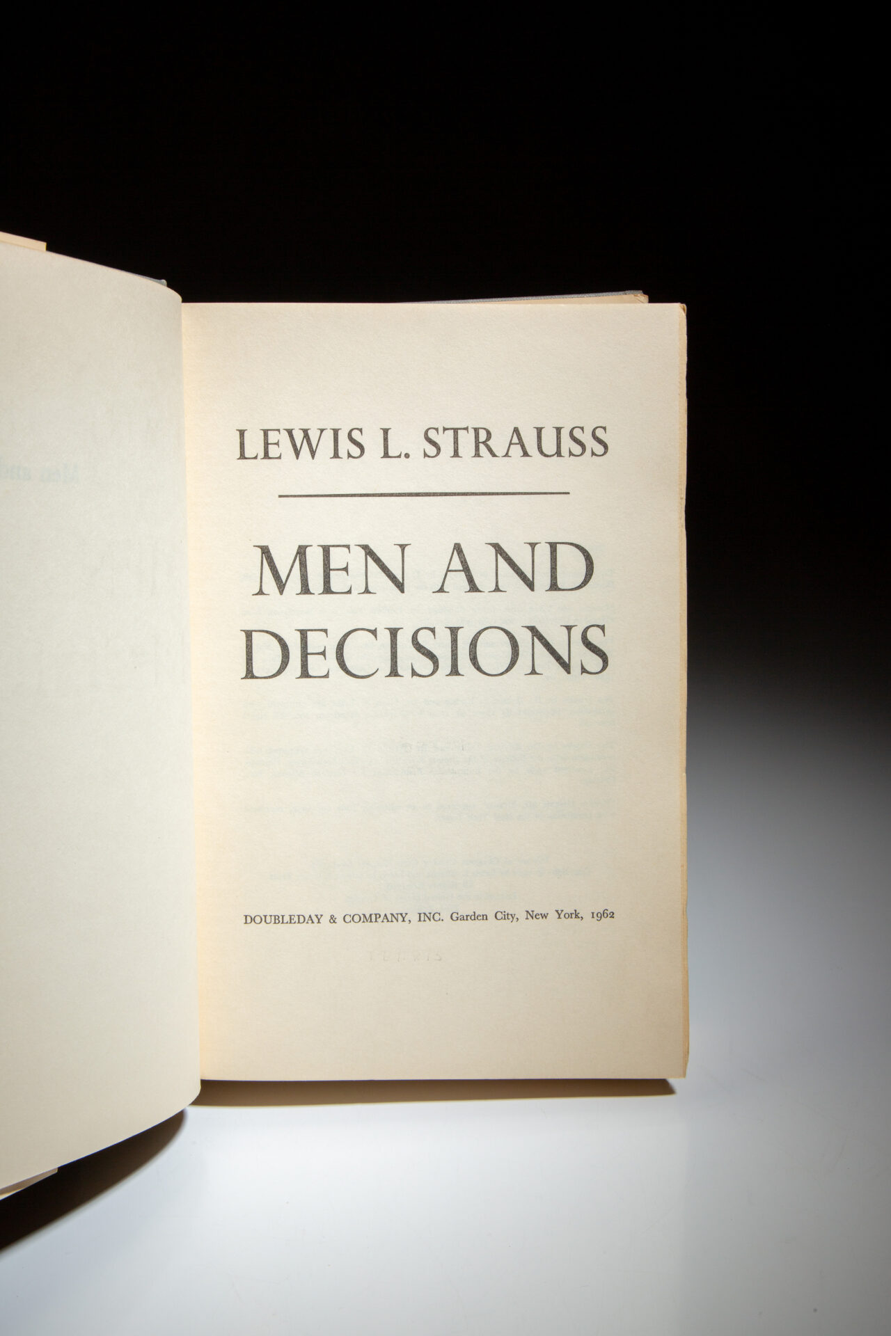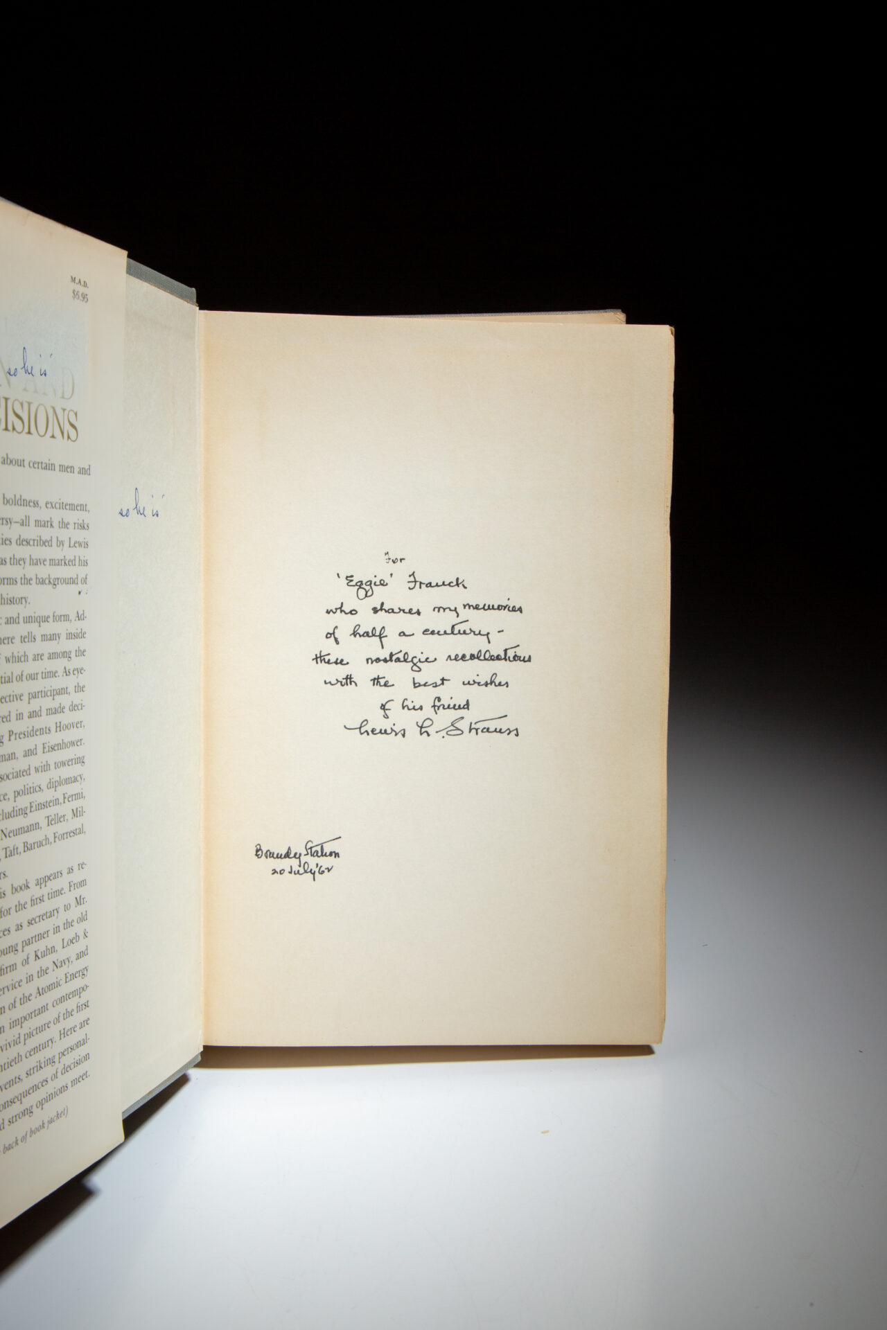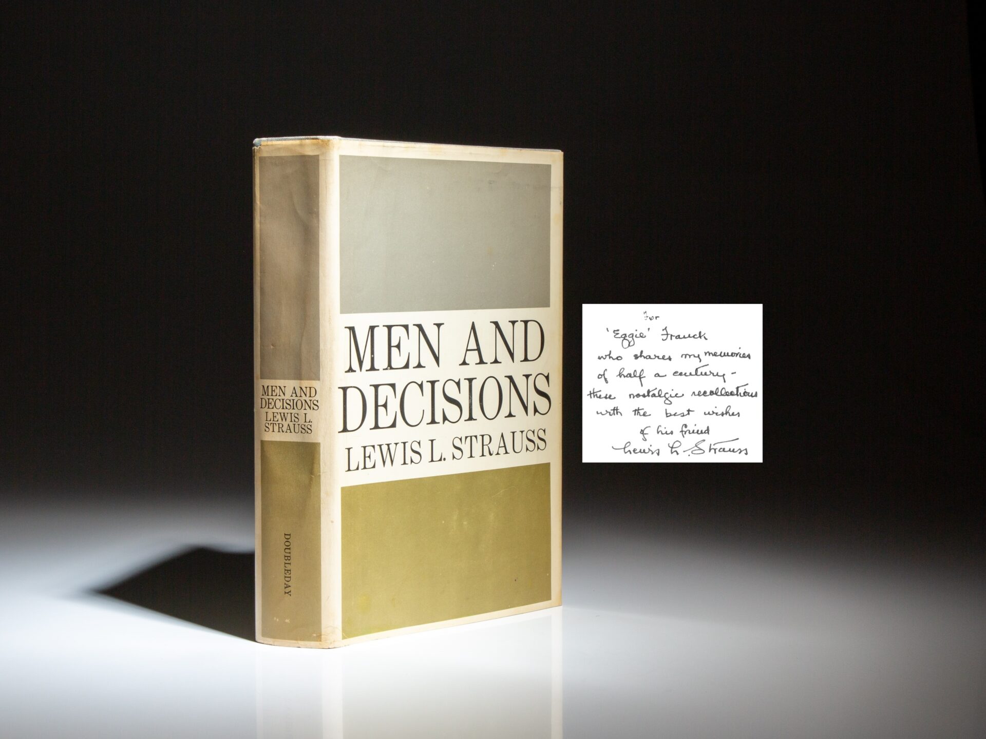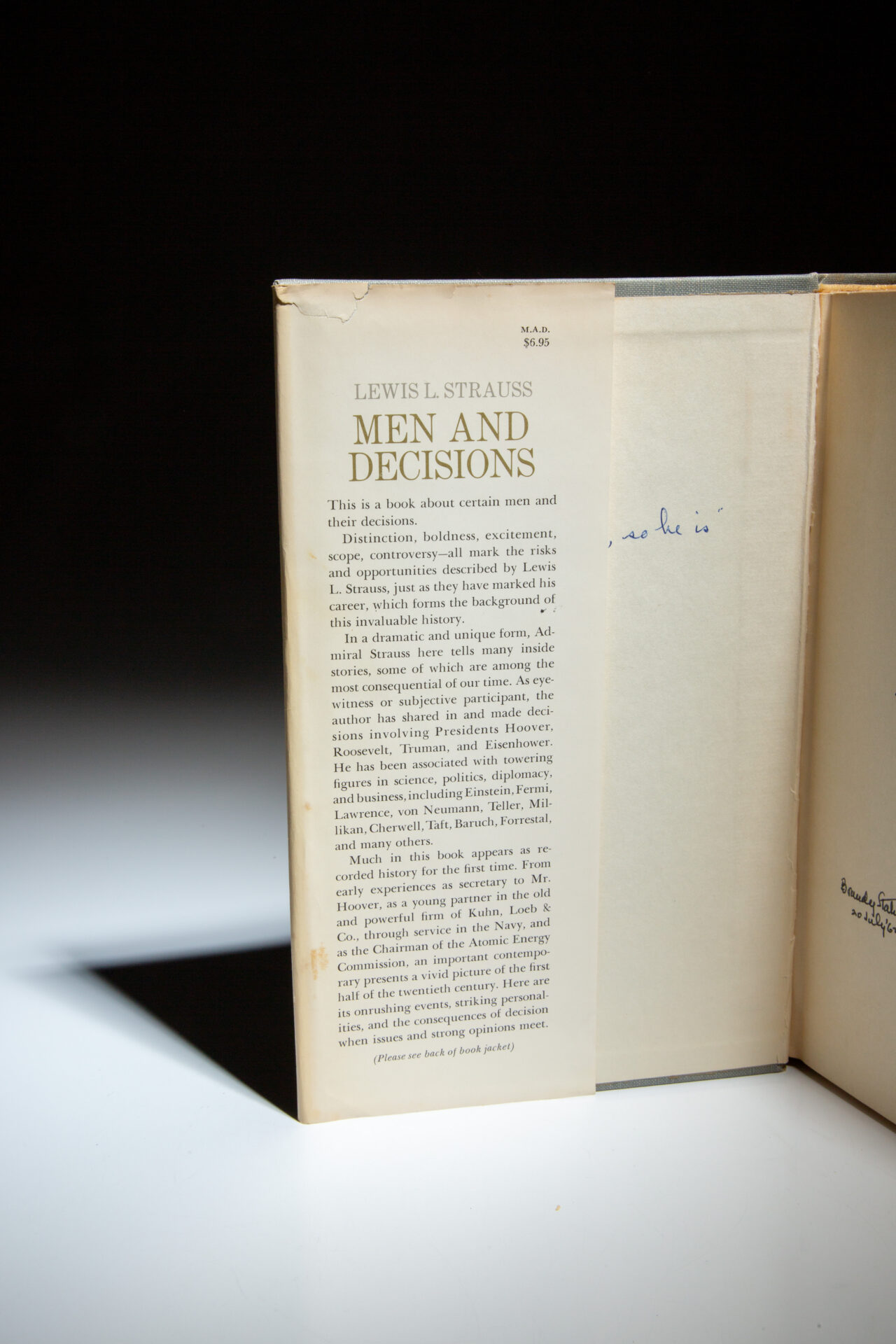 First edition of Men and Decisions by Secretary Lewis L. Strauss, inscribed to James Franck, winner of the 1925 Nobel Prize in Physics and Director of Chemistry for the Manhattan Project.