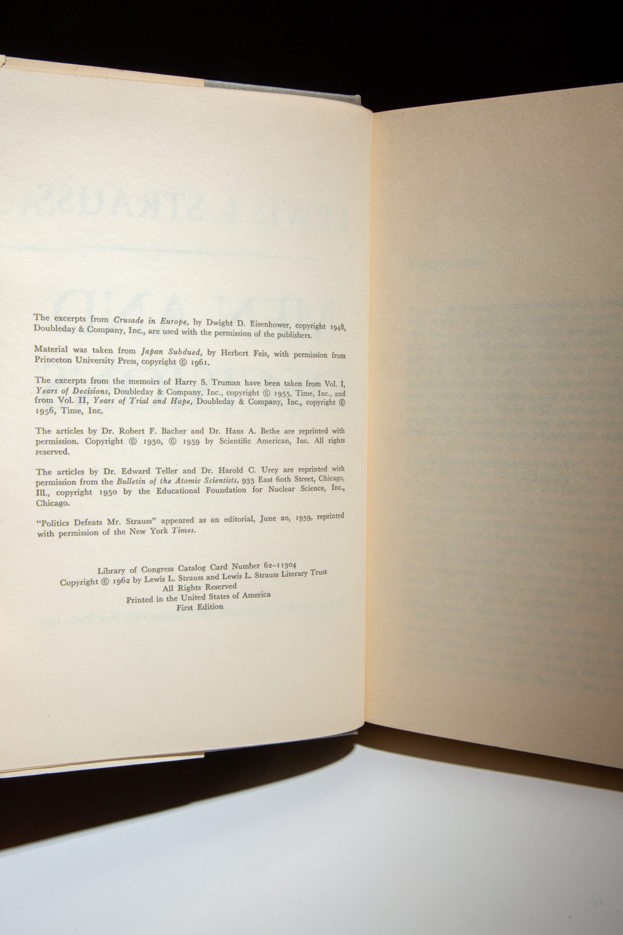 Inscribed on the front free endpaper to James Franck, using a nickname: “For ‘Eggie’ Franck / who shares my memoires of half a century – these nostalgic recollections / with the best wishes of his friend / Lewis L. Strauss / Brandy Station / 20 July ’62.”