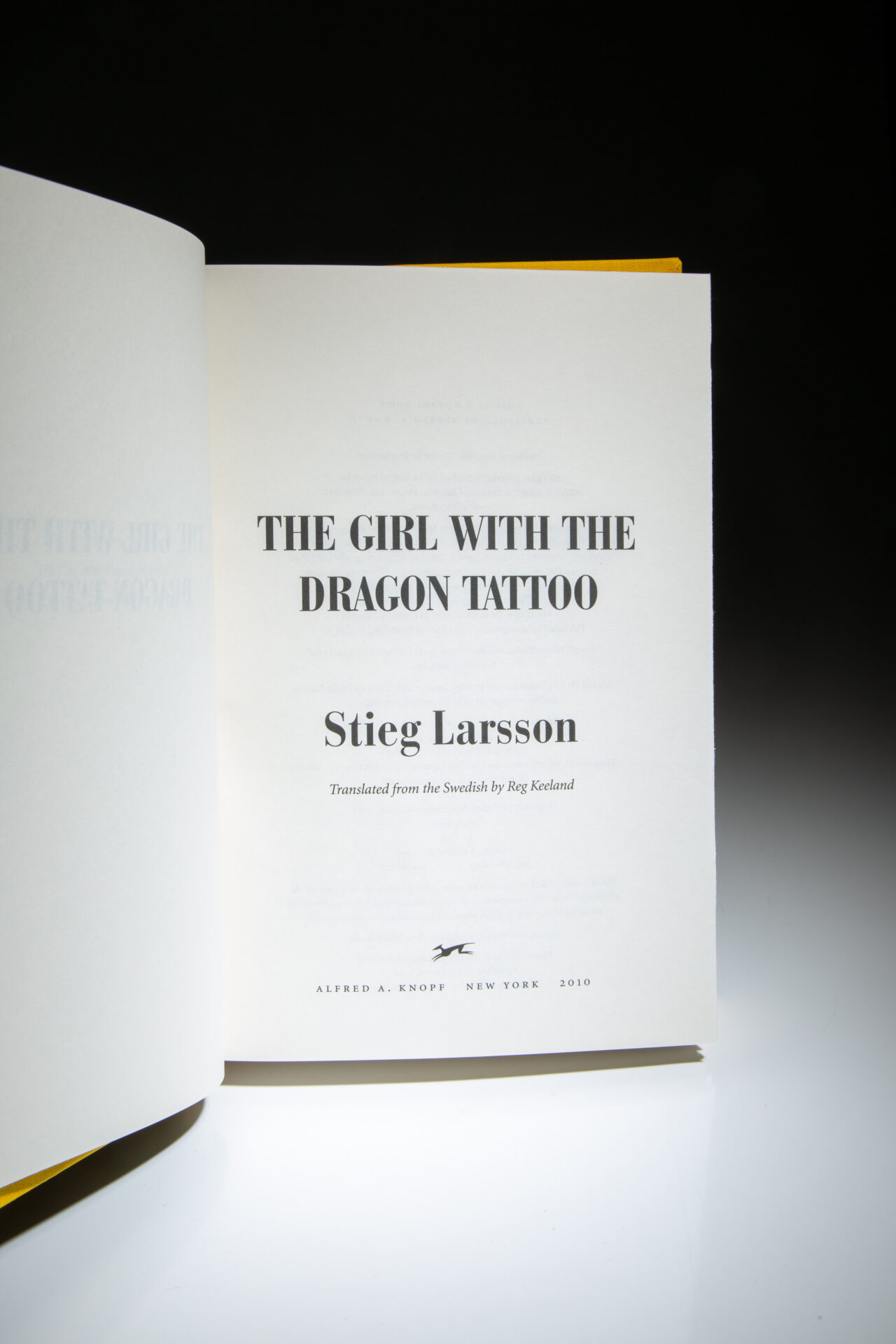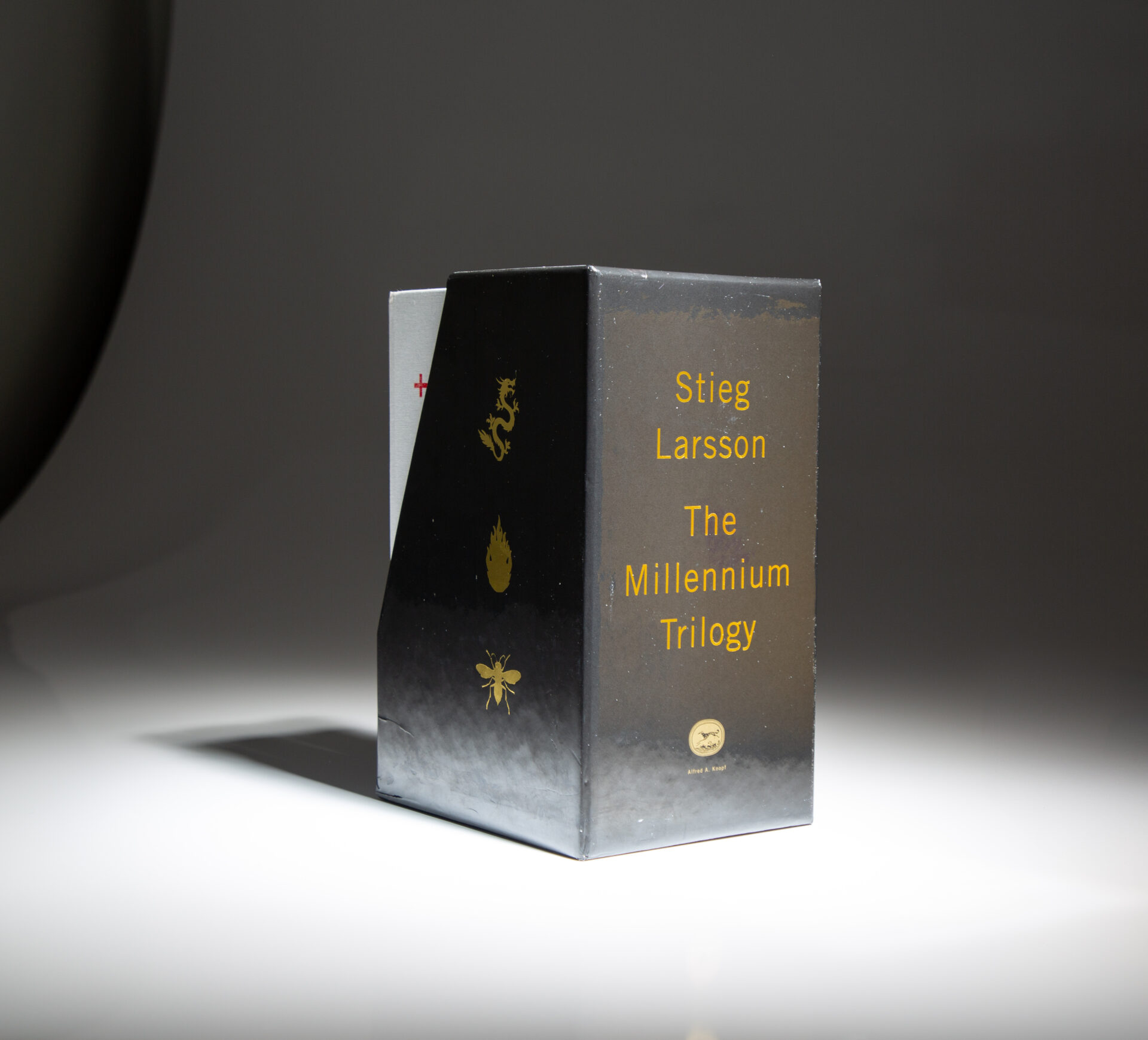 Tall octavo, 465pp; 503pp; 563pp. Bound in yellow, red and blue cloth, titles in black on spines. Copyright page states “Deluxe Boxed Edition, November 26, 2010” in each volume. Solid text blocks, light dust remnants along edges, otherwise fine. Without dust jackets, as issued. Also includes a thin volume “On Steig Larsson” featuring a short biography and some of his correspondence. Housed in a black cardboard slipcase, with retail price listed as $99.00.