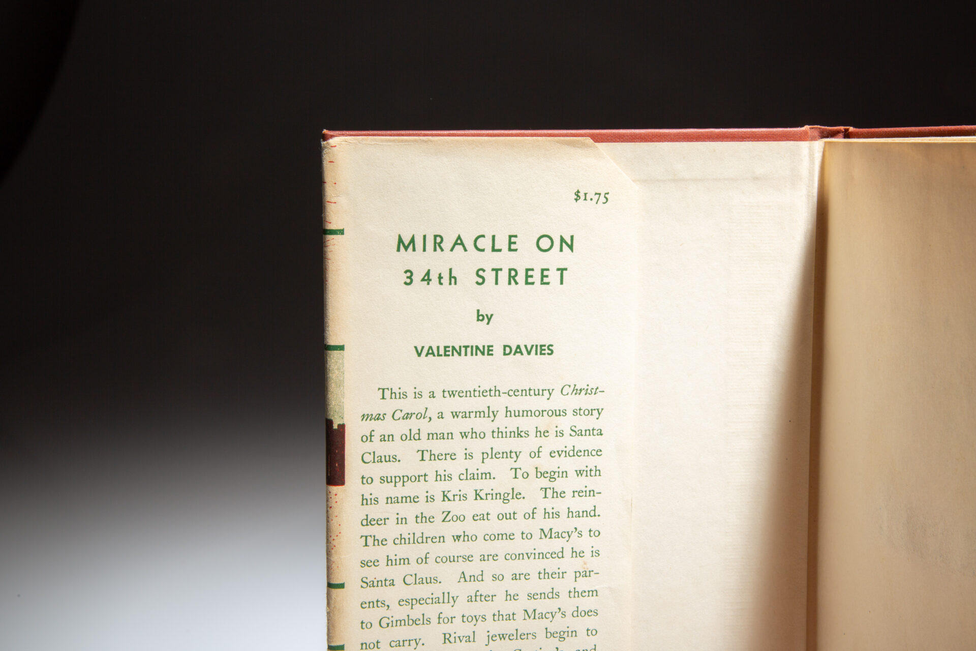 First edition of Miracle on 34th Street by Valentine Davies, in the first state dust jacket.