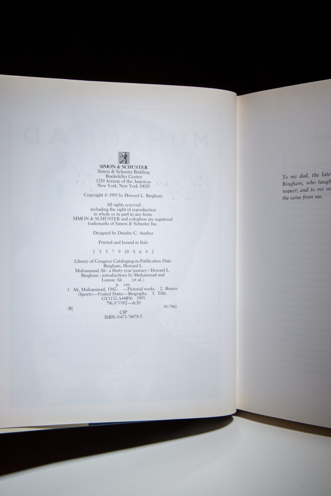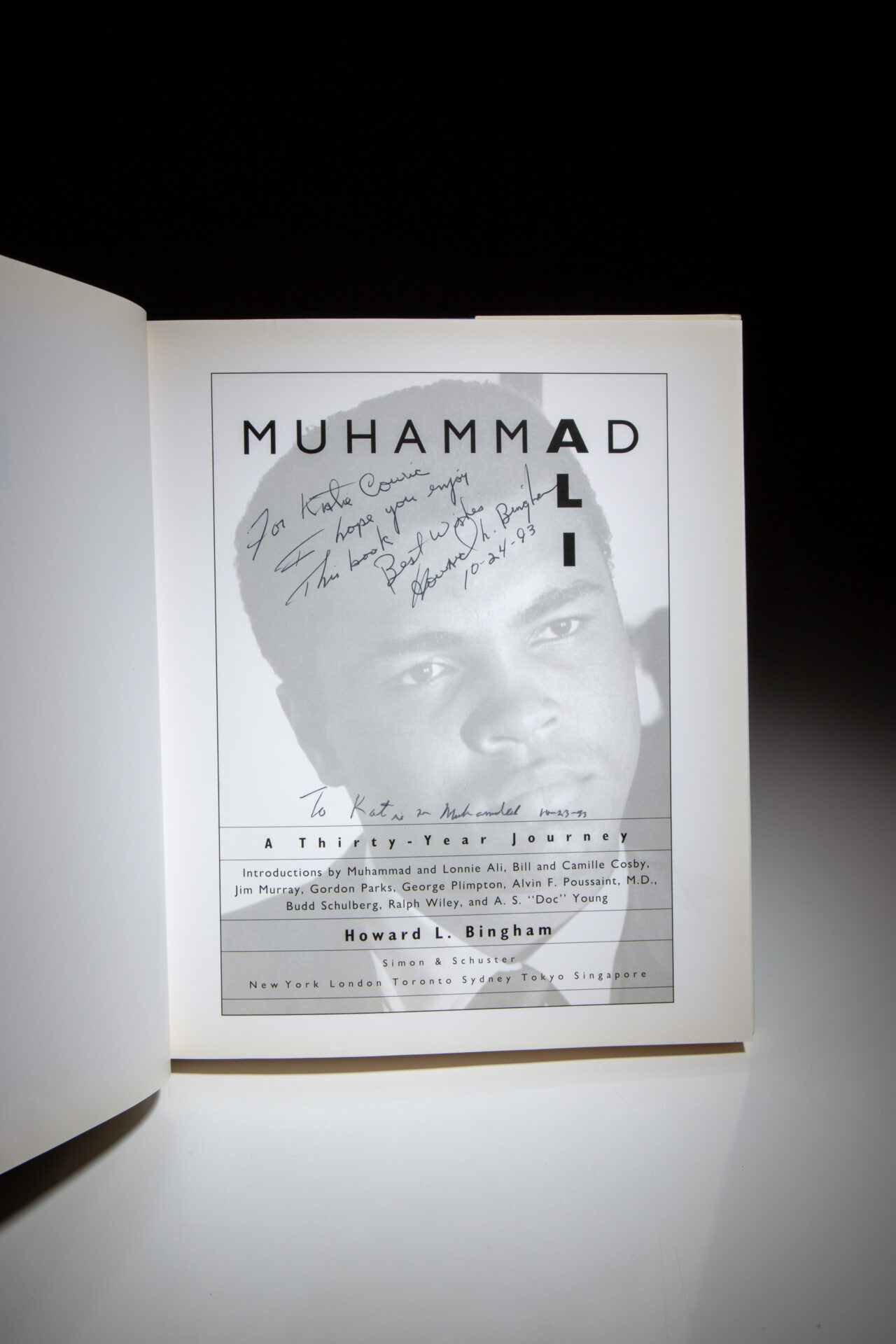 This copy is inscribed by the author and Muhammad Ali on the title page to Katie Couric, after filming a special for NBC called “Legend to Legend” in Los Angeles. Inscription reads: “For Katie Couric / I hope you enjoy this book / Best Wishes / Howard L. Bingham / 10-24-93.” / “To Katie – Muhammad 10-23-93.”