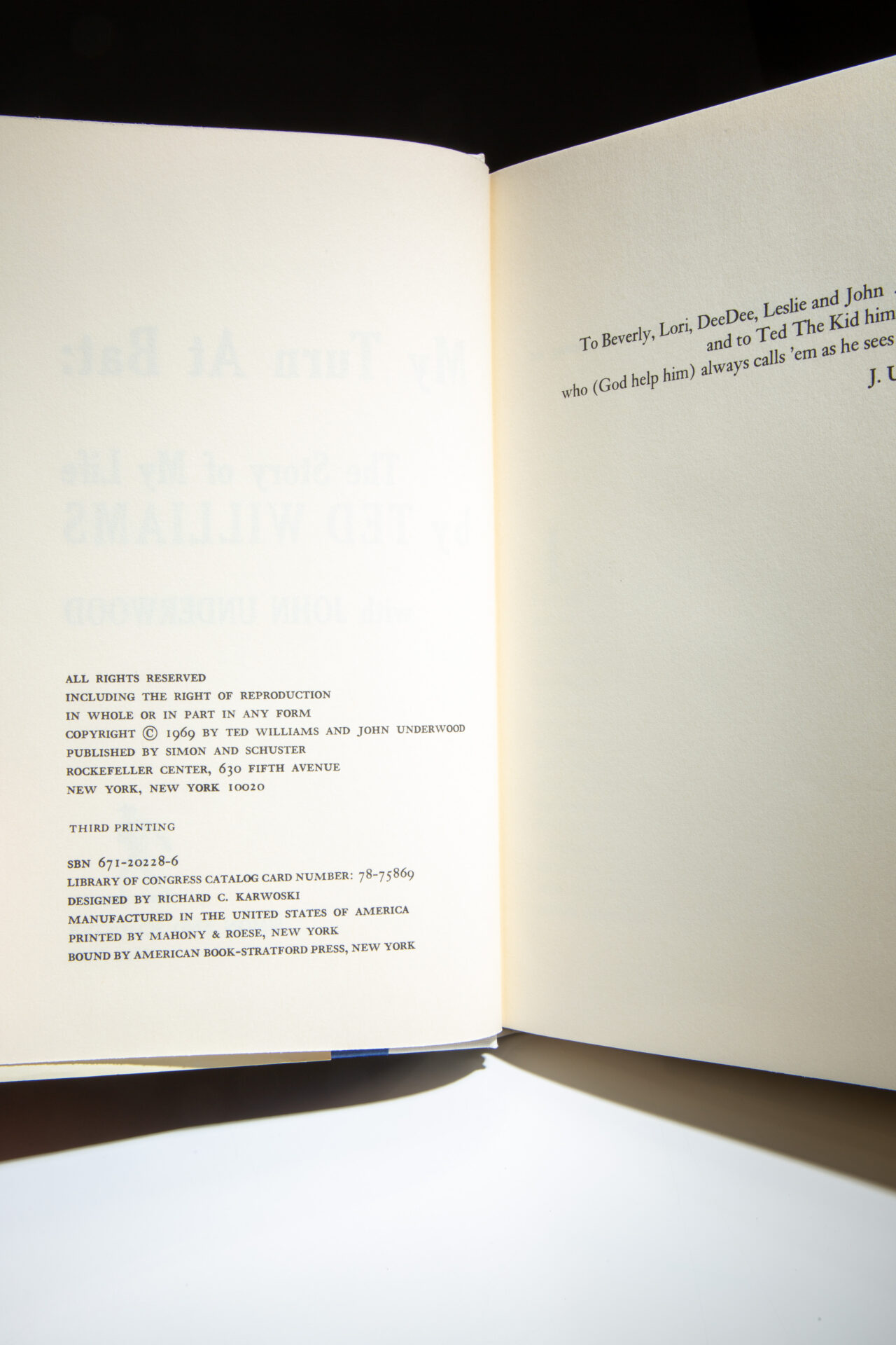 Signed by Ted Williams, an early printing of My Turn at Bat: The Story of My Life by Ted Williams with John Underwood.