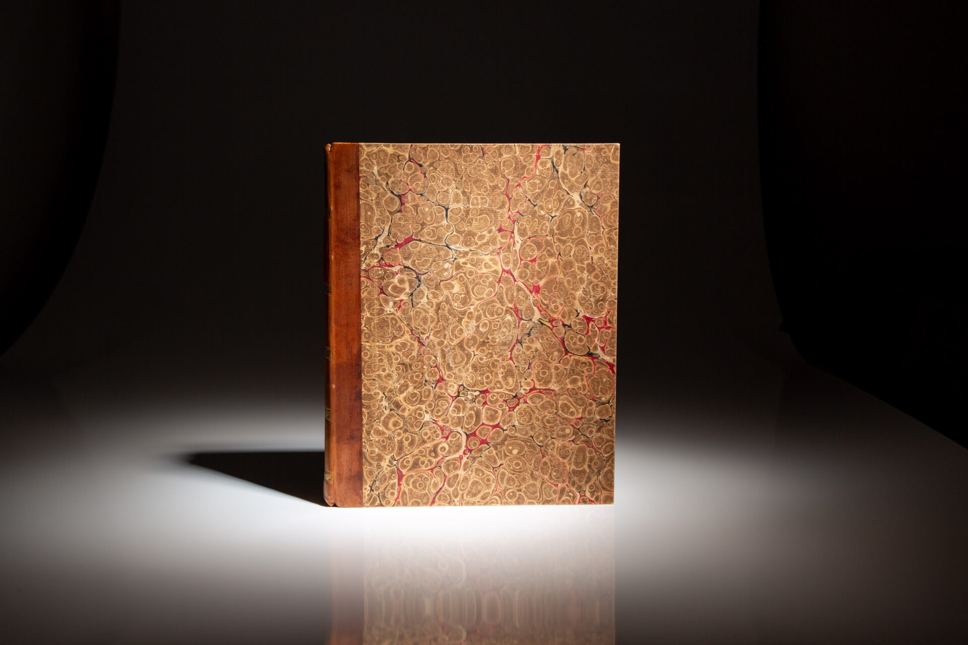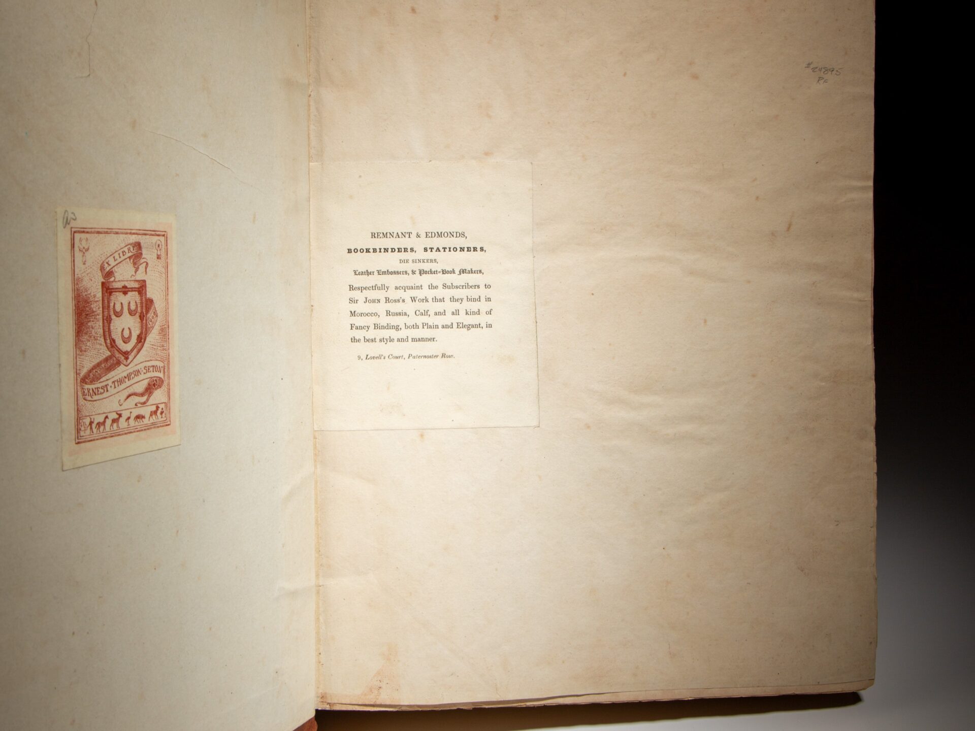 Quarto, xxxiii, [1], 740; [Appendix], xii, [1], 120pp, cxliv, cii, [errata]. Contemporary quarter brown calf, decorative gilt bands, marbled boards. Bookplate of Ernest Thompson Seton on the front pastedown of both volumes. Booksellers’ small label on rear pastedown of both volumes. Both works are complete, with 30 plates and charts (9 hand-colored) and a large hand-colored map of the Boothia Peninsula; 20 plates (nine hand-colored) in Appendix. Frontispiece portrait of Sir John Ross in the Appendix. Clean text throughout, solid text block. Scattered foxing and toning to plates, color plates all fine. Archival repair to closed tear along margin of fold-out map.