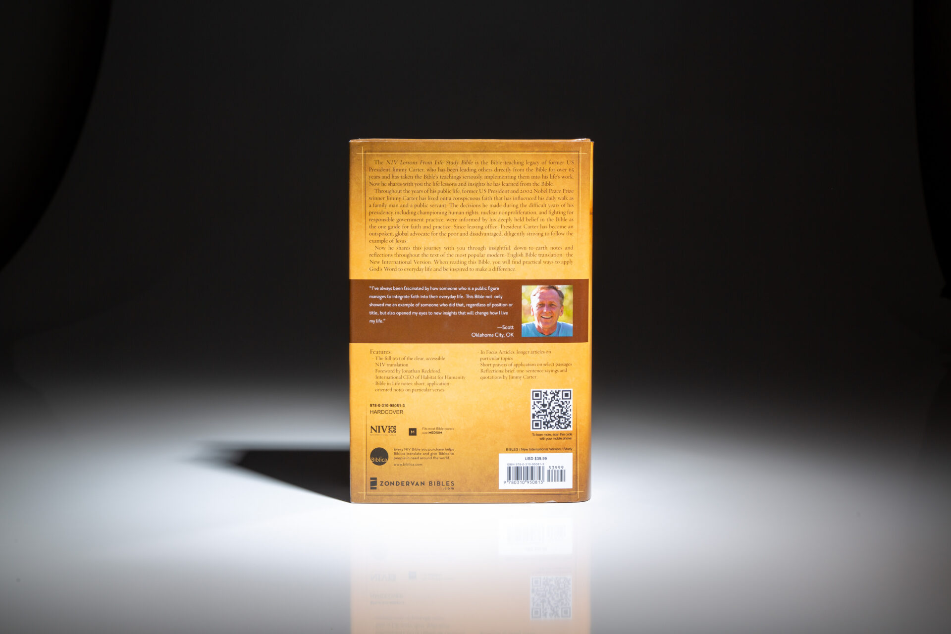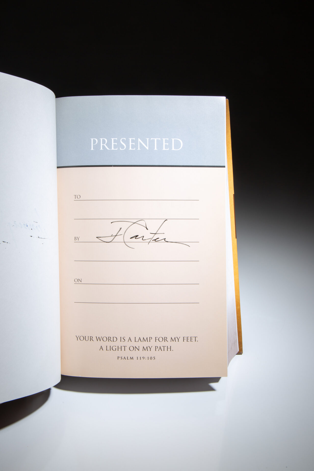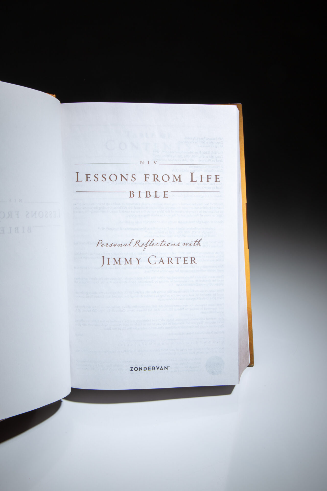 The signed first edition of NIV Lessons from Life Bible: Personal Reflections with Jimmy Carter, signed twice by President Carter.