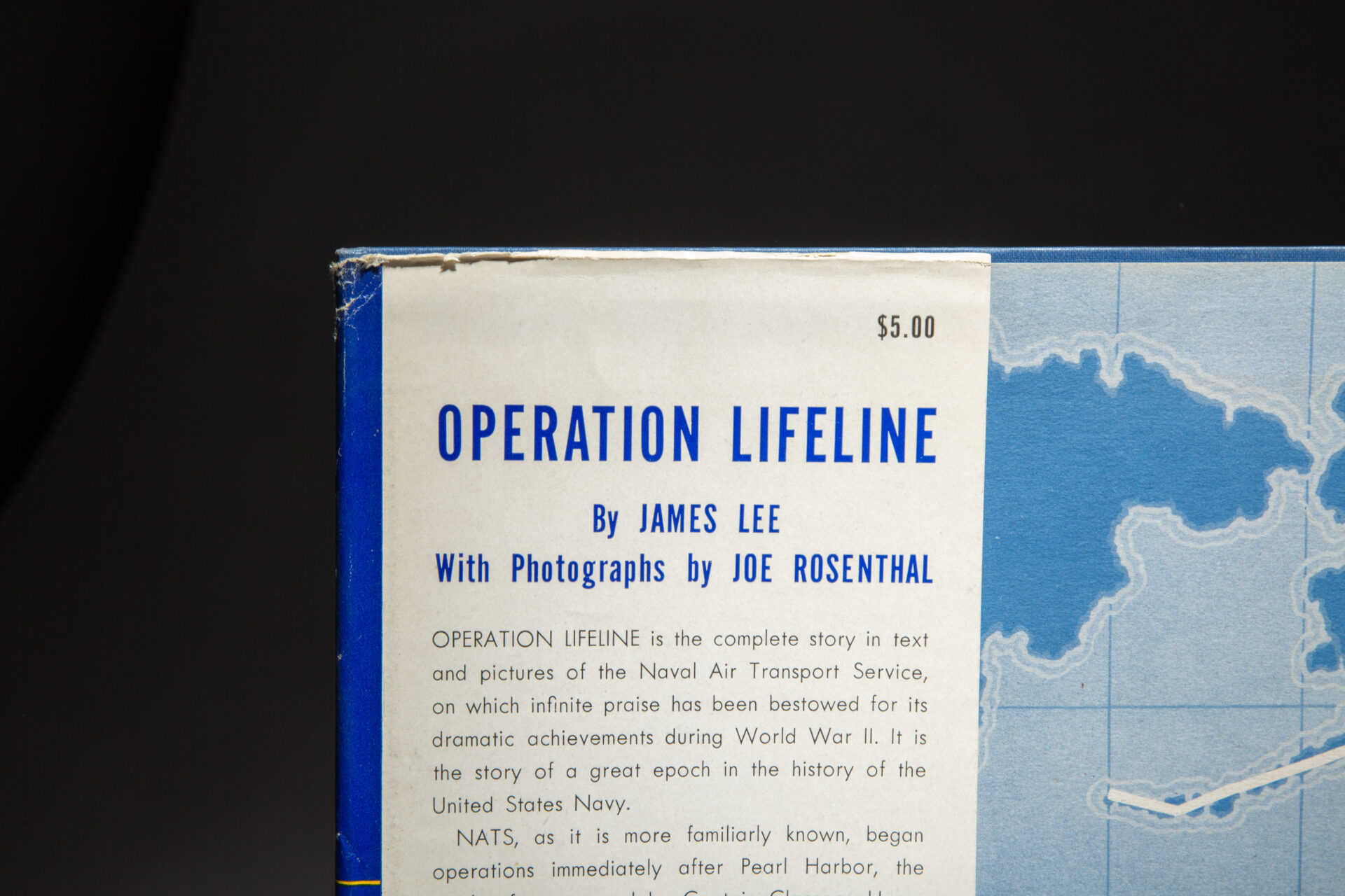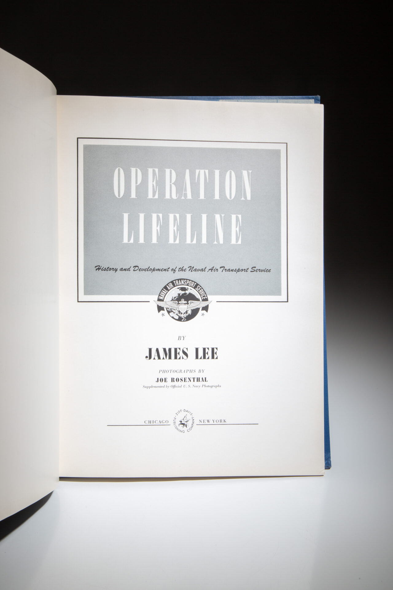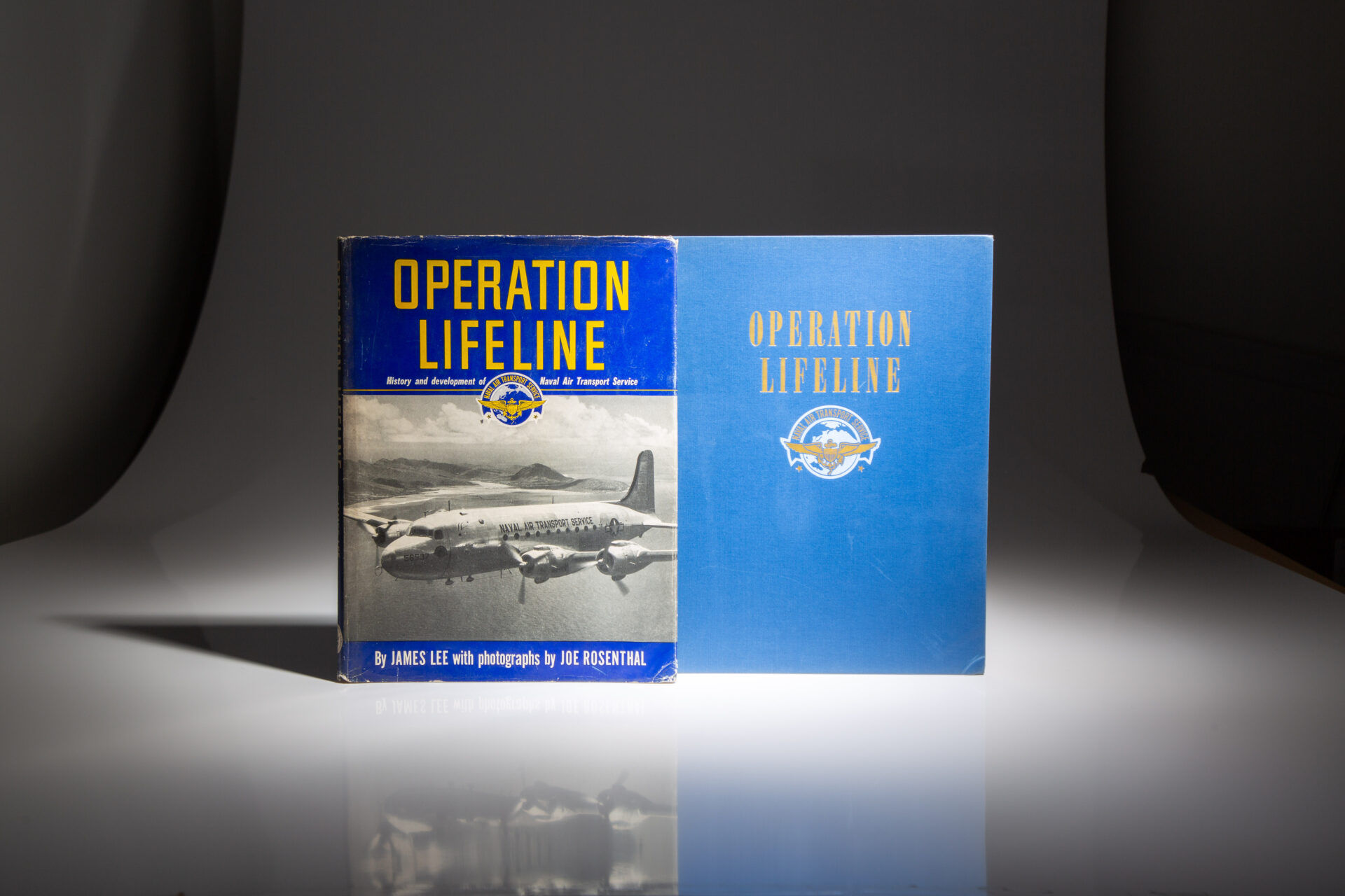 Quarto, [5], 171pp, [4]. Publisher’s blue cloth, title printed on spine, emblem of the Naval Air Transport Service on front cover. Pictorial endpapers. Bumped lower left corner of front board. In the publisher’s dust jacket, $5.00 on the front flap, tape repairs to closed tears on verso, shelf wear to boards, a scarce jacket in this condition.