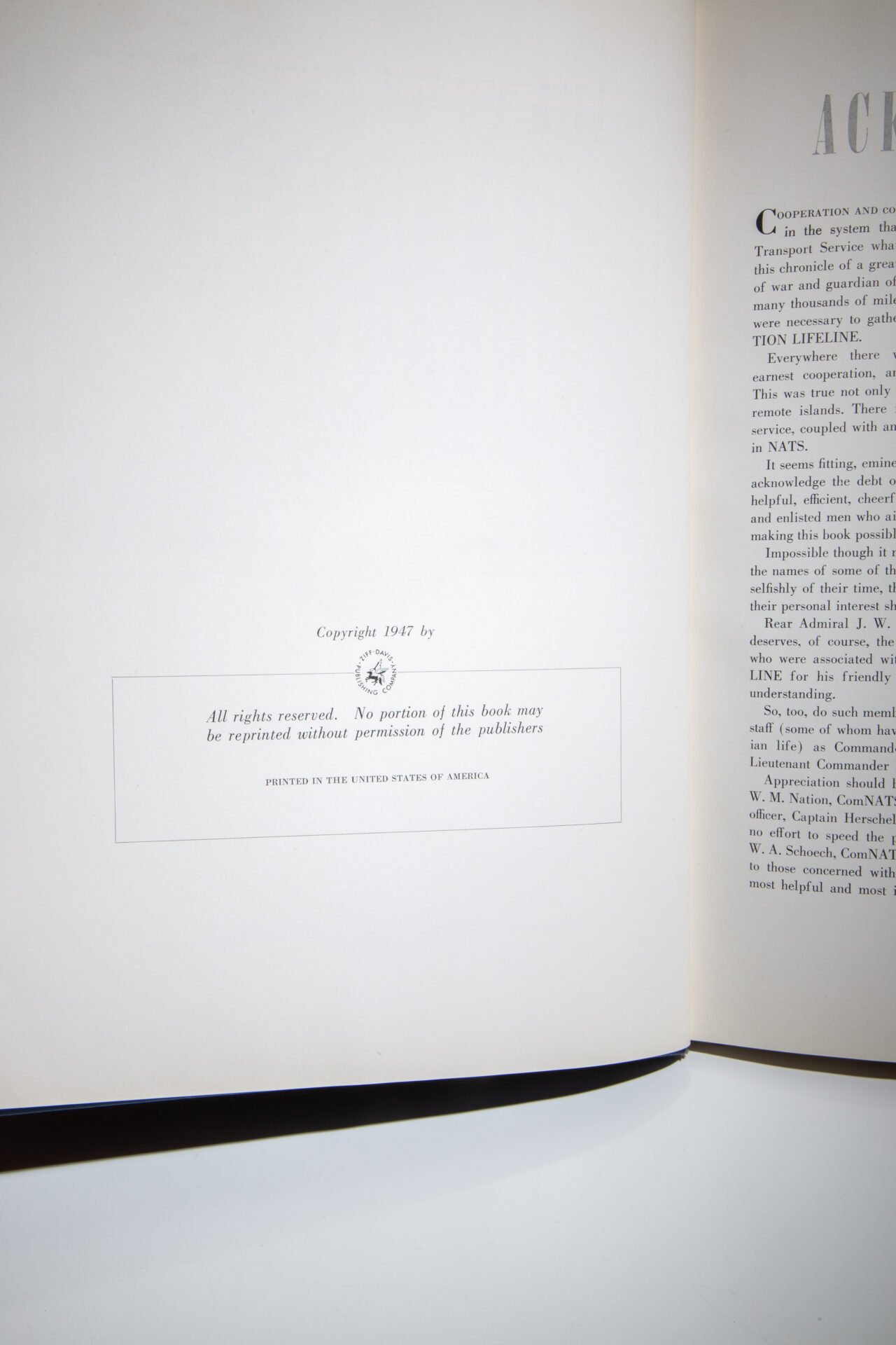 Includes the signed limitation page from the De-Luxe Edition, tipped-in before the half title, numbered 972 of 1000. The limitation page is signed by James Forrestal (Secretary of the Navy), Admiral Chester W. Nimitz (Chief of Naval Operations), Vice Admiral A.W. Radford (Deputy Chief of Naval Operations) and Rear Admiral J.W. Reeves (Commander, Naval Air Transport Services).