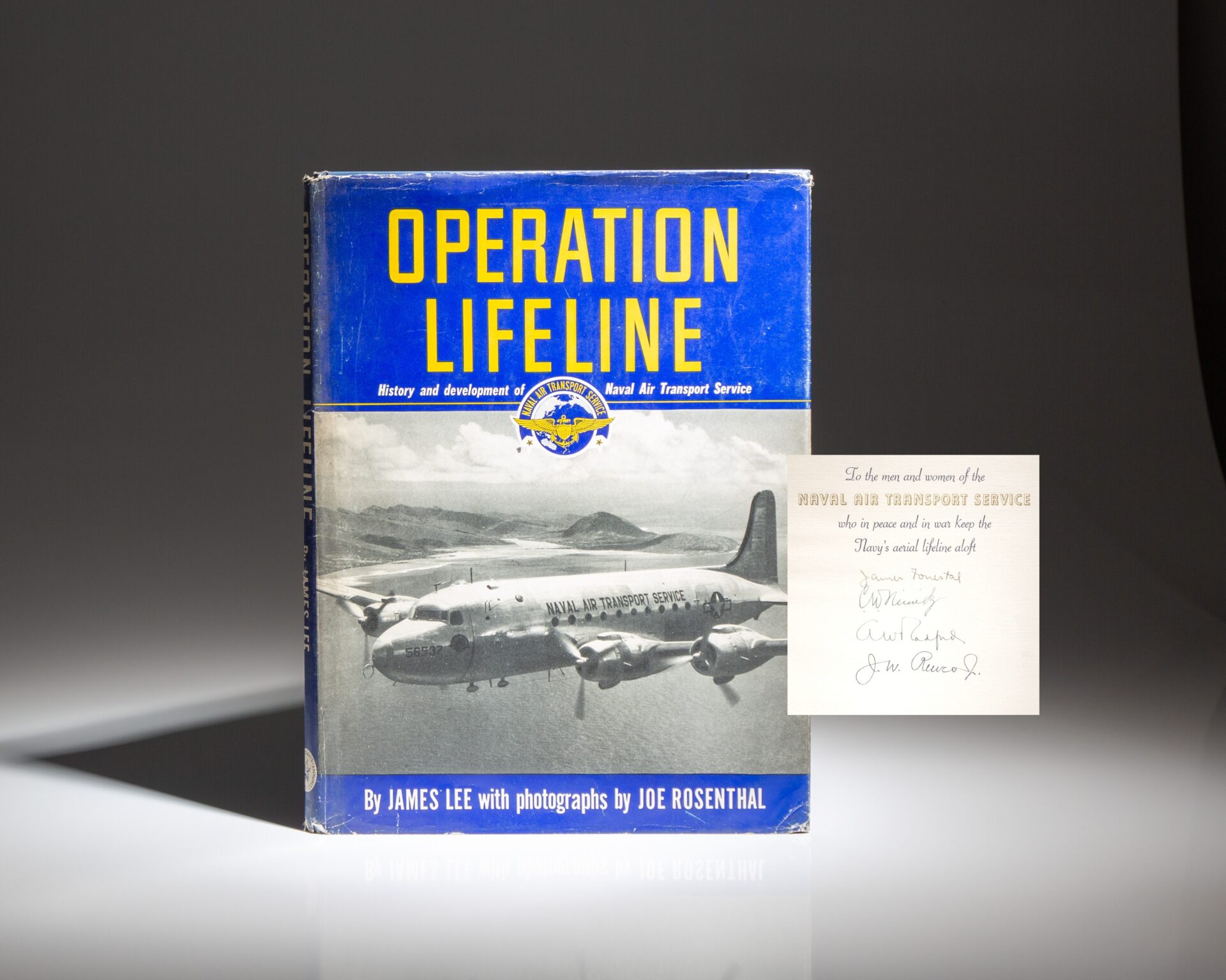 The first edition of Operation Lifeline: History and Development of the Naval Air Transport Service, signed by Forrestal, Nimitz, Radford, and Reeves on the limitation page.