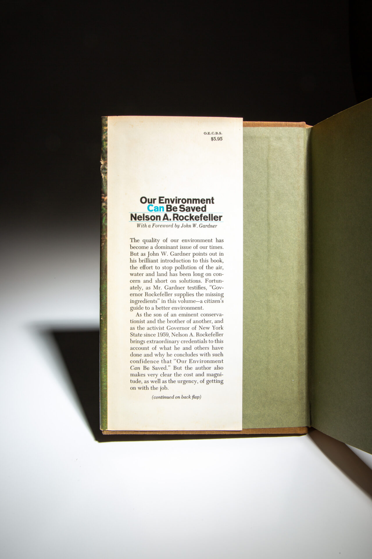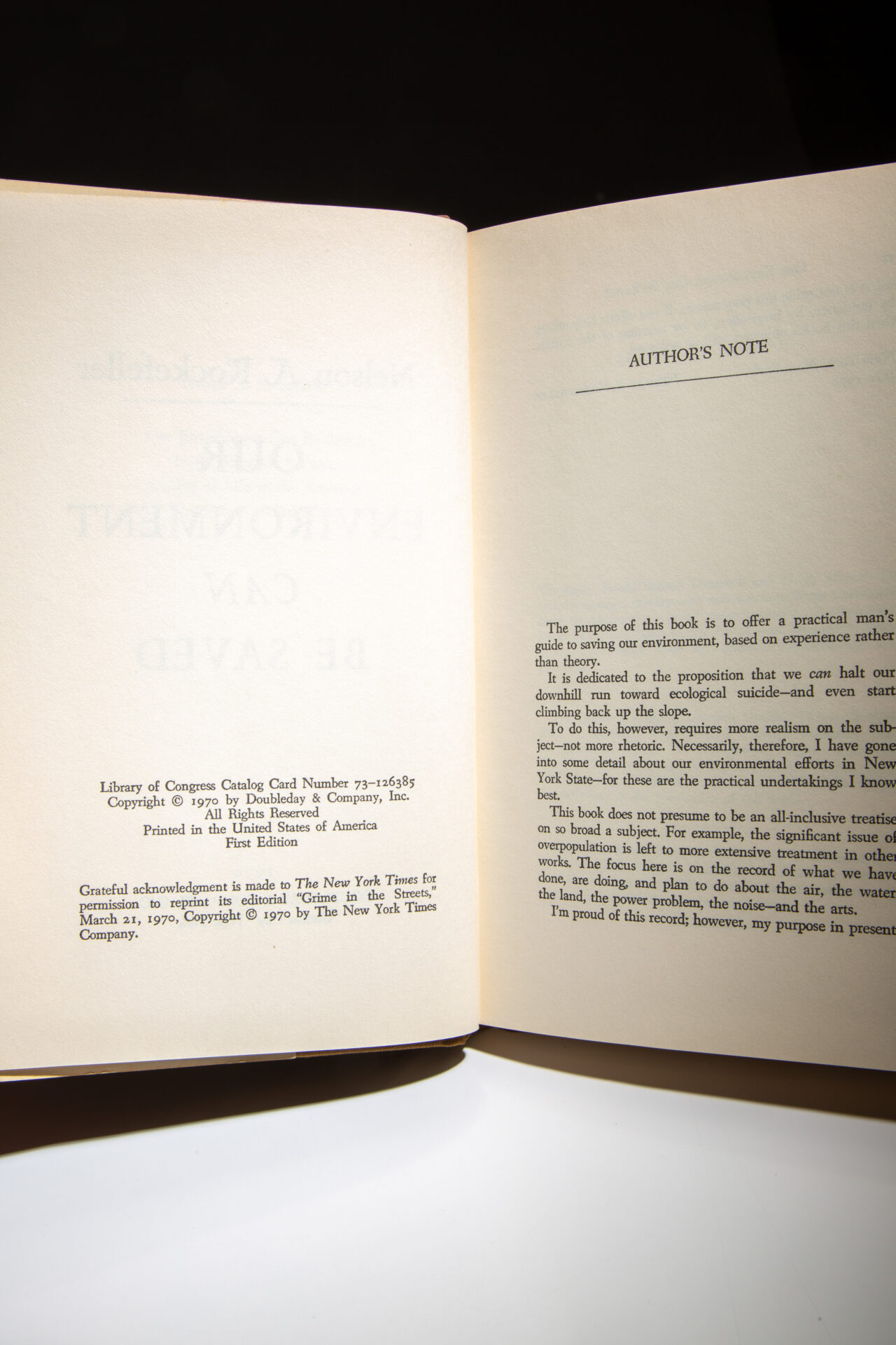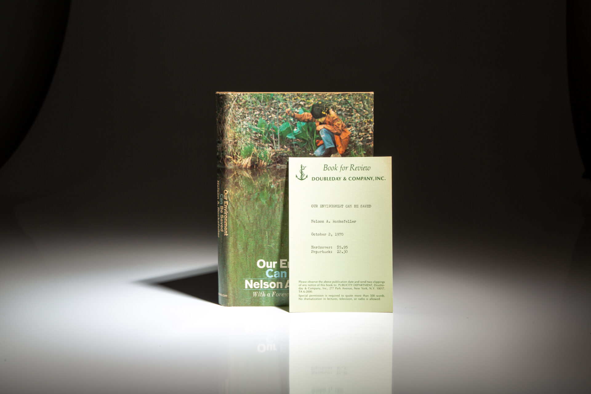 The first edition, first printing of Our Environment Can Be Saved, signed by Gov. Nelson A. Rockefeller.