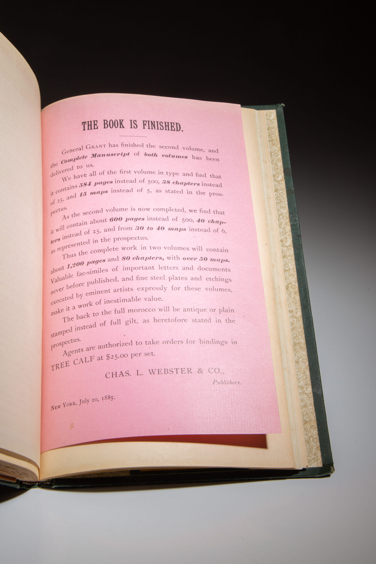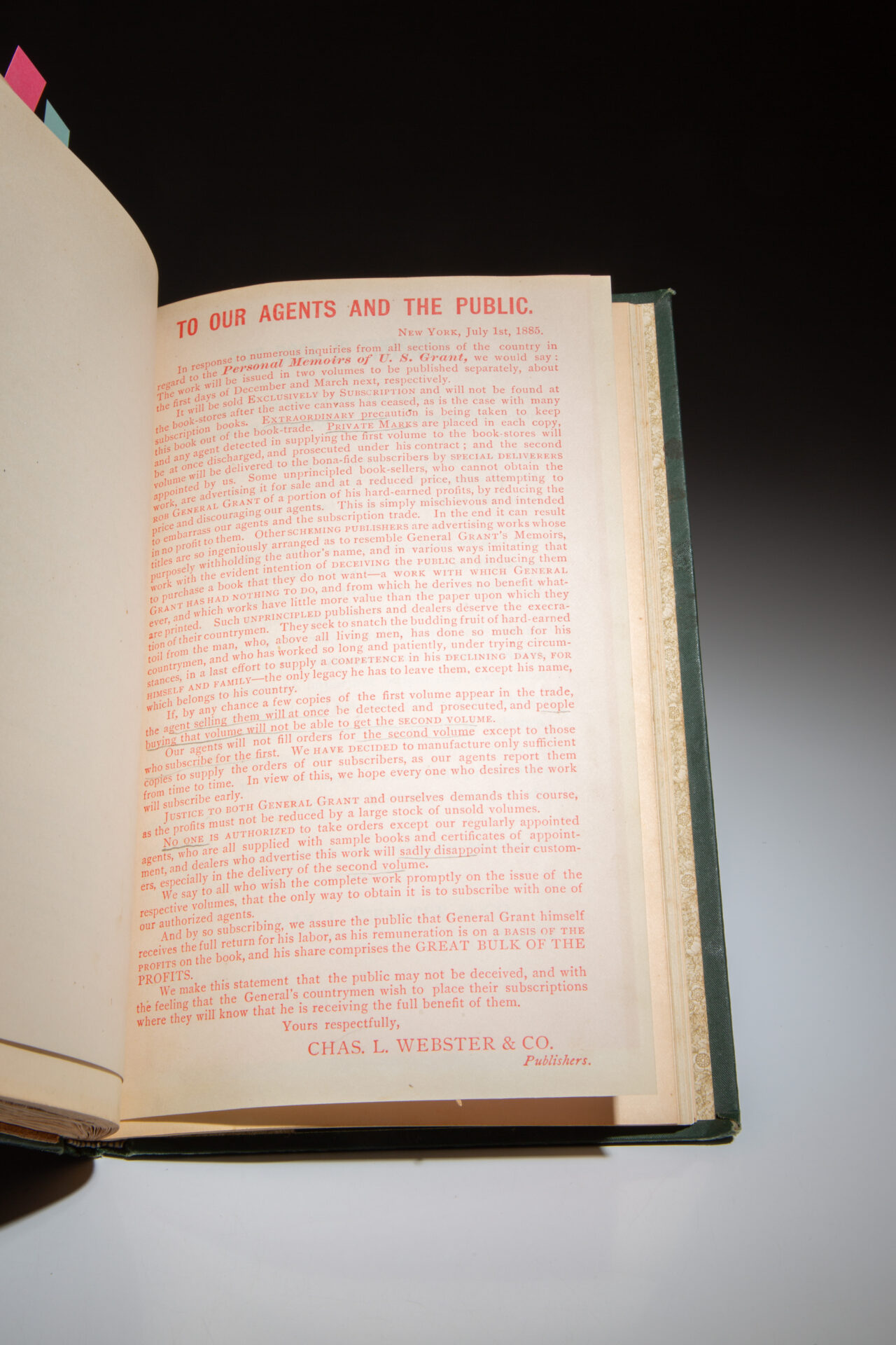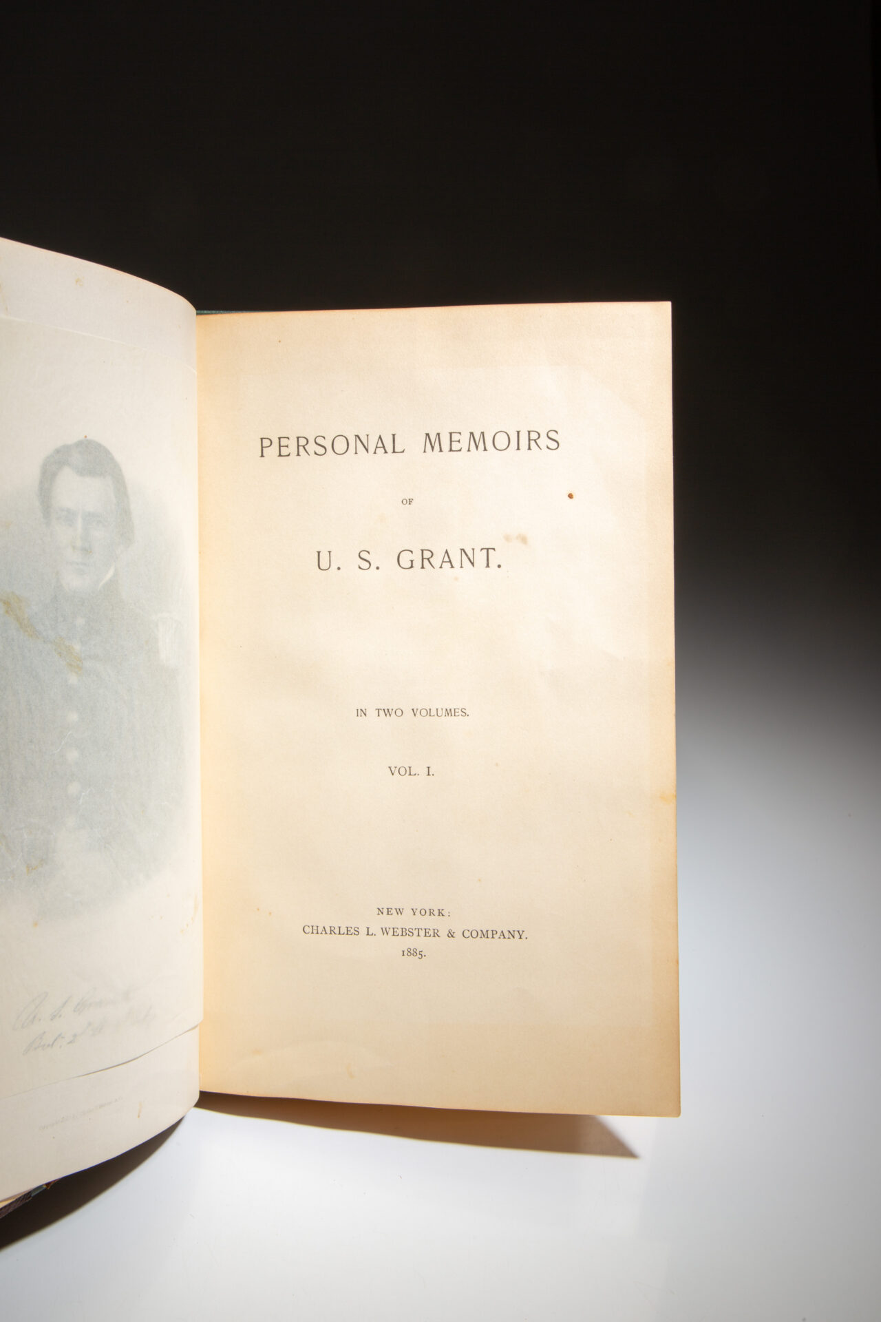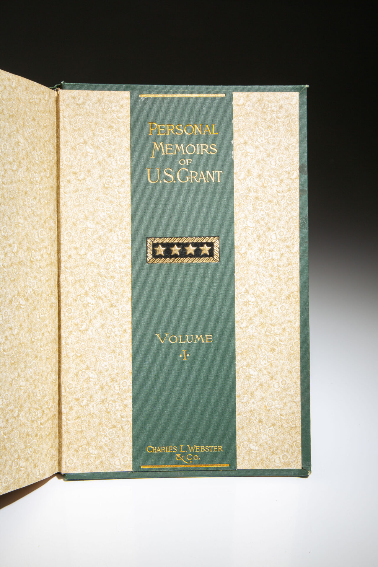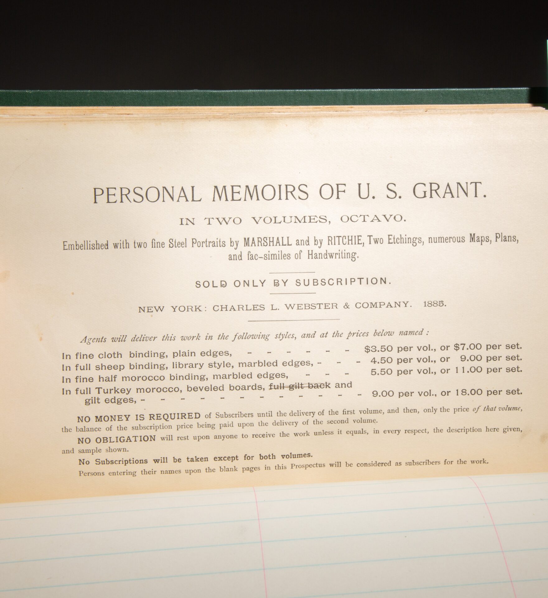Published shortly after his death, the Personal Memoirs of President Grant are held in high regard by historians and general readers alike. Grant was initially opposed to writing his memoirs, but wished to leave his family financially stable after his death. The books were sold in multiple formats, ranging in price from $3.50 to $12.00 in 1885. (Eicher 492) (Dornbusch II: 1986)