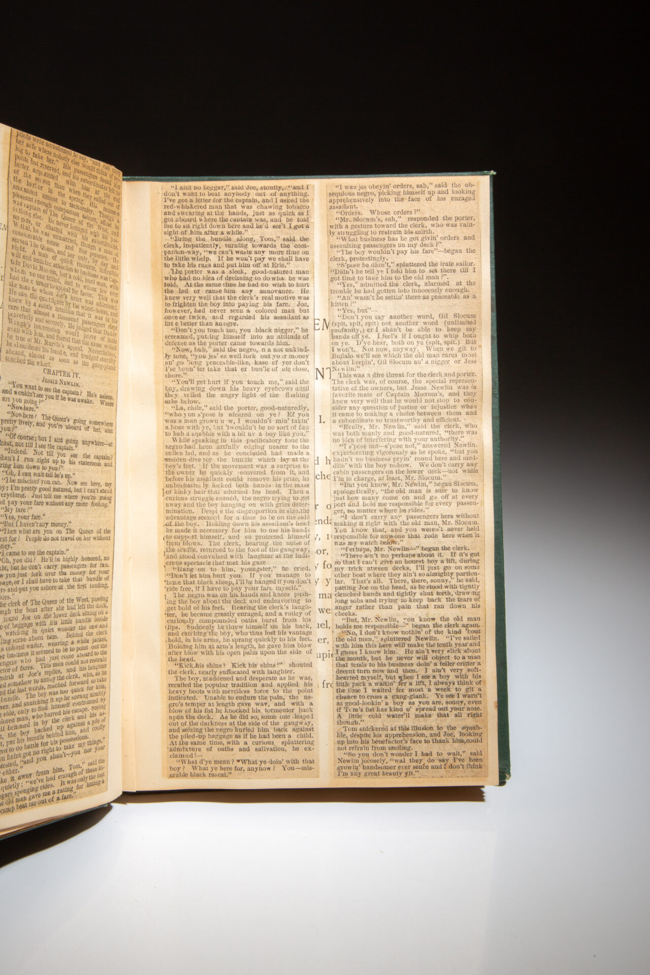 This problematic copy features 28 leaves of text, which are covered by the serialized version of “The Mortgage on the Hip-Roof House” by Albion W. Tourgee, dated 1887.