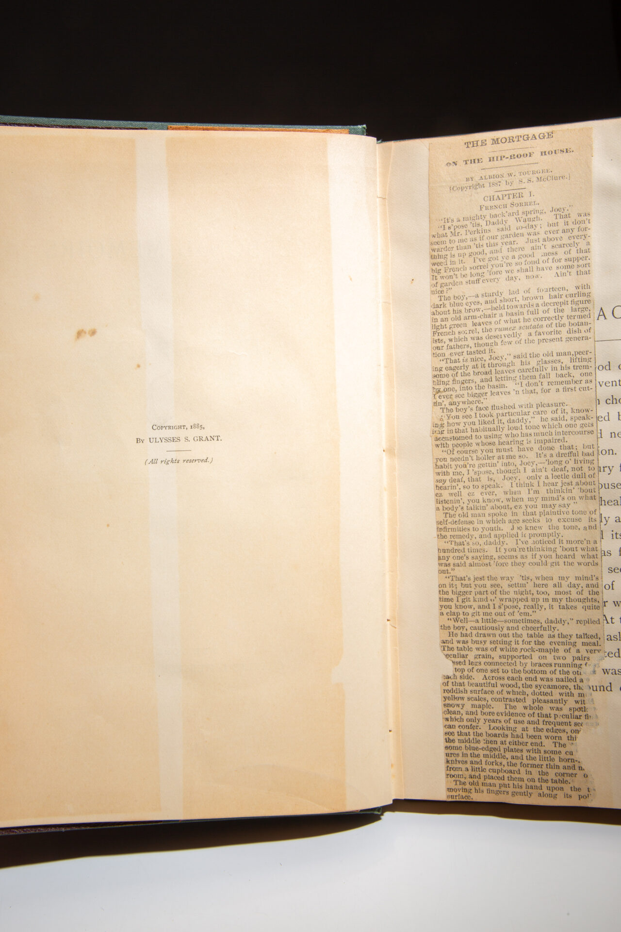 Salesman’s sample copy of the Personal Memoirs of U.S. Grant, with binding samples and illustrated plates. Numerous leaves pasted over with serialized newspaper articles.
